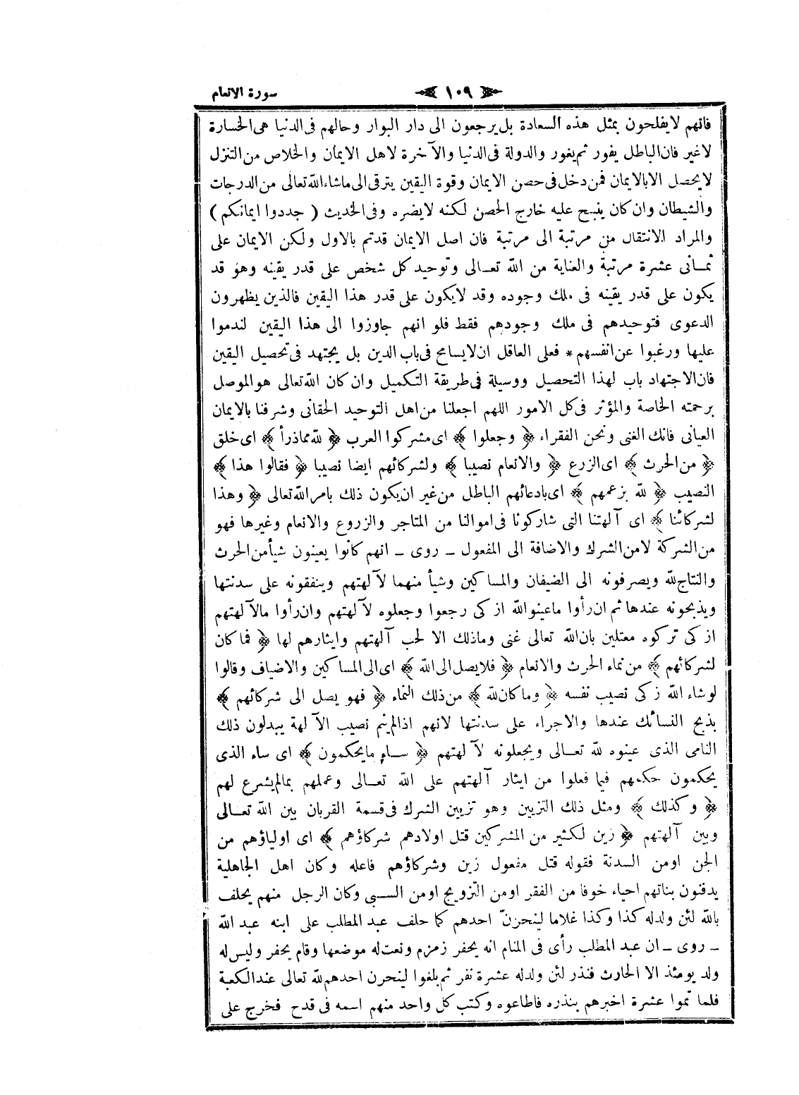فانهم لا يفلحون بمثل هذه السعادة بل يرجعون الى دار البوار وحالهم فى الدنيا هى الخسارة لا غير فان الباطل يفور ثم يغور والدولة فى الدنيا والآخرة لاهل الايمان والخلاص من التنزل لا يحصل الا بالايمان فمن دخل فى حصن الايمان وقوة اليقين يترقى الى ما شاء الله تعالى من الدرجات والشيطان وان كان ينبح عليه خارج الحصن لكنه لا يضره وفى الحديث (جددوا ايمانكم) والمراد الانتقال من مرتبة الى مرتبة فان اصل الايمان قدتم بالأول ولكن الايمان على ثمانى عشرة مرتبة والعناية من الله تعالى وتوحيد كل شخص على قدر يقينه وهو قد يكون على قدر يقينه فى ملك وجوده وقد لا يكون على قدر هذا اليقين فالذين يظهرون الدعوى فتوحيدهم فى ملك وجودهم فقط فلو انهم جاوزوا الى هذا اليقين لندموا عليها ورغبوا عن أنفسهم فعلى العاقل ان لا يسامح فى باب الدين بل يجتهد فى تحصيل اليقين فان الاجتهاد باب لهذا التحصيل ووسيلة فى طريقة التكميل وان كان الله تعالى هو الموصل برحمته الخاصة والمؤثر فى كل الأمور اللهم اجعلنا من اهل التوحيد الحقانى وشرفنا بالايمان العيانى فانك الغنى ونحن الفقراء وَجَعَلُوا اى مشركوا العرب لِلَّهِ مِمَّا ذَرَأَ اى خلق مِنَ الْحَرْثِ اى الزرع وَالْأَنْعامِ نَصِيباً ولشركائهم ايضا نصيبا فَقالُوا هذا النصيب لِلَّهِ بِزَعْمِهِمْ اى بادعائهم الباطل من غير ان يكون ذلك بامر الله تعالى وَهذا لِشُرَكائِنا اى آلهتنا التي شاركونا فى أموالنا من المتاجر والزروع والانعام وغيرها فهو من الشركة لا من الشرك والاضافة الى المفعول- روى- انهم كانوا يعينون شيأ من الحرث والنتاج لله ويصرفونه الى الضيفان والمساكين وشيأ منهما لآلهتهم وينفقونه على سدنتها ويذبحونه عندها ثم ان رأوا ما عينو الله ازكى رجعوا وجعلوه لآلهتهم وان رأوا ما لآلهتهم از كى تركوه معتلين بان الله تعالى غنى وما ذلك الا لحب آلهتهم وإيثارهم لها فَما كانَ لِشُرَكائِهِمْ من نماء الحرث والانعام فَلا يَصِلُ إِلَى اللَّهِ اى الى المساكين والأضياف وقالوا لو شاء الله زكى نصيب نفسه وَما كانَ لِلَّهِ من ذلك النماء فَهُوَ يَصِلُ إِلى شُرَكائِهِمْ بذبح النسائك عندها والاجراء على سدنتها لانهم إذا لم ينم نصيب الآلهة يبدلون ذلك النامي الذي عينوه لله تعالى ويجعلونه لآلهتهم ساءَ ما يَحْكُمُونَ اى ساء الذي يحكمون حكمهم فيما فعلوا من إيثار آلهتهم على الله تعالى وعملهم بما لم يشرع لهم وَكَذلِكَ ومثل ذلك التزيين وهو تزيين الشرك فى قسمة القربان بين الله تعالى وبين آلهتهم زَيَّنَ لِكَثِيرٍ مِنَ الْمُشْرِكِينَ قَتْلَ أَوْلادِهِمْ شُرَكاؤُهُمْ اى أولياؤهم من الجن او من السدنة فقوله قتل مفعول زين وشركاؤهم فاعله وكان اهل الجاهلية يدفنون بناتهم احياء خوفا من الفقر او من التزويج او من السبي وكان الرجل منهم يحلف بالله لئن ولد له كذا وكذا غلاما لينحزن أحدهم كما حلف عبد المطلب على ابنه عبد الله- روى- ان عبد المطلب رأى فى المنام انه يحفر زمزم ونعت له موضعها وقام يحفر وليس له ولد يومئذ الا الحارث فنذر لئن ولد له عشرة نفر ثم بلغوا لينحرن أحدهم لله تعالى عند الكعبة فلما تموا عشرة أخبرهم بنذره فاطاعوه وكتب كل واحد منهم اسمه فى قدح فخرج على