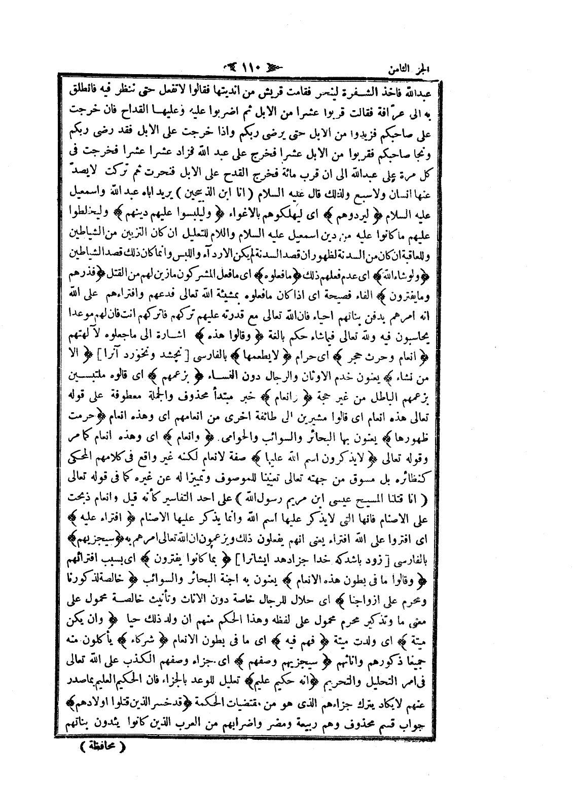 عبد الله فاخذ الشفرة لينحر فقامت قريش من أنديتها فقالوا لا تفعل حتى ننظر فيه فانطلق به الى عرّافة فقالت قربوا عشرا من الإبل ثم اضربوا عليه وعليها القداح فان خرجت على صاحبكم فزيدوا من الإبل حتى يرضى ربكم وإذا خرجت على الإبل فقد رضى ربكم ونجا صاحبكم فقربوا من الإبل عشرا فخرج على عبد الله فزاد عشرا عشرا فخرجت فى كل مرة على عبد الله الى ان قرب مائة فخرج القدح على الإبل فنحرت ثم تركت لا يصدّ عنها انسان ولا سبع ولذلك قال عليه السلام (انا ابن الذبيحين) يريد أباه عبد الله واسمعيل عليه السلام لِيُرْدُوهُمْ اى ليهلكوهم بالإغواء وَلِيَلْبِسُوا عَلَيْهِمْ دِينَهُمْ وليخلطوا عليهم ما كانوا عليه من دين اسمعيل عليه السلام واللام للتعليل ان كان التزيين من الشياطين وللعاقبة ان كان من السدنة لظهور ان قصد السدنة لم يكن الإرداء واللبس وانما كان ذلك قصد الشياطين وَلَوْ شاءَ اللَّهُ اى عدم فعلهم ذلك ما فَعَلُوهُ اى ما فعل المشركون ما زين لهم من القتل فَذَرْهُمْ وَما يَفْتَرُونَ الفاء فصيحة اى إذا كان ما فعلوه بمشيئة الله تعالى فدعهم وافتراءهم على الله انه أمرهم بدفن بناتهم احياء فان الله تعالى مع قدرته عليهم تركهم فاتركهم أنت فان لهم موعدا يحاسبون فيه ولله تعالى فيما شاء حكم بالغة وَقالُوا هذِهِ اشارة الى ما جعلوه لآلهتهم أَنْعامٌ وَحَرْثٌ حِجْرٌ اى حرام لا يَطْعَمُها بالفارسي [نچشد ونخورد آنرا] إِلَّا مَنْ نَشاءُ يعنون خدم الأوثان والرجال دون النساء بِزَعْمِهِمْ اى قالوه ملتبسين بزعمهم الباطل من غير حجة وَأَنْعامٌ خبر مبتدأ محذوف والجملة معطوفة على قوله تعالى هذه انعام اى قالوا مشيرين الى طائفة اخرى من أنعامهم اى وهذه انعام حُرِّمَتْ ظُهُورُها يعنون بها البحائر والسوائب والحوامي وَأَنْعامٌ اى وهذه انعام كما مر وقوله تعالى لا يَذْكُرُونَ اسْمَ اللَّهِ عَلَيْهَا صفة لانعام لكنه غير واقع فى كلامهم المحكي كنظائره بل مسوق من جهته تعالى تعييننا للموصوف وتمييزا له عن غيره كما فى قوله تعالى إِنَّا قَتَلْنَا الْمَسِيحَ عِيسَى ابْنَ مَرْيَمَ رَسُولَ اللَّهِ على أحد التفاسير كأنه قيل وانعام ذبحت على الأصنام فانها التي لا يذكر عليها اسم الله وانما يذكر عليها الأصنام افْتِراءً عَلَيْهِ اى افتروا على الله افتراء يعنى انهم يفعلون ذلك ويزعمون ان الله تعالى أمرهم به سَيَجْزِيهِمْ بالفارسي [زود باشد كه خدا جزا دهد ايشانرا] بِما كانُوا يَفْتَرُونَ اى بسبب افترائهم وَقالُوا ما فِي بُطُونِ هذِهِ الْأَنْعامِ يعنون به اجنة البحائر والسوائب خالِصَةٌ لِذُكُورِنا وَمُحَرَّمٌ عَلى أَزْواجِنا اى حلال للرجال خاصة دون الإناث وتأنيث خالصة محمول على معنى ما وتذكير محرم محمول على لفظه وهذا الحكم منهم ان ولد ذلك حيا وَإِنْ يَكُنْ مَيْتَةً اى ولدت ميتة فَهُمْ فِيهِ اى ما فى بطون الانعام شُرَكاءُ يأكلون منه جميعا ذكورهم وإناثهم سَيَجْزِيهِمْ وَصْفَهُمْ اى جزاء وصفهم الكذب على الله تعالى فى امر التحليل والتحريم إِنَّهُ حَكِيمٌ عَلِيمٌ تعليل للوعد بالجزاء فان الحكيم العليم بما صدر عنهم لا يكاد يترك جزاءهم الذي هو من مقتضيات الحكمة قَدْ خَسِرَ الَّذِينَ قَتَلُوا أَوْلادَهُمْ جواب قسم محذوف وهم ربيعة ومضر واضرابهم من العرب الذين كانوا يئدون بناتهم