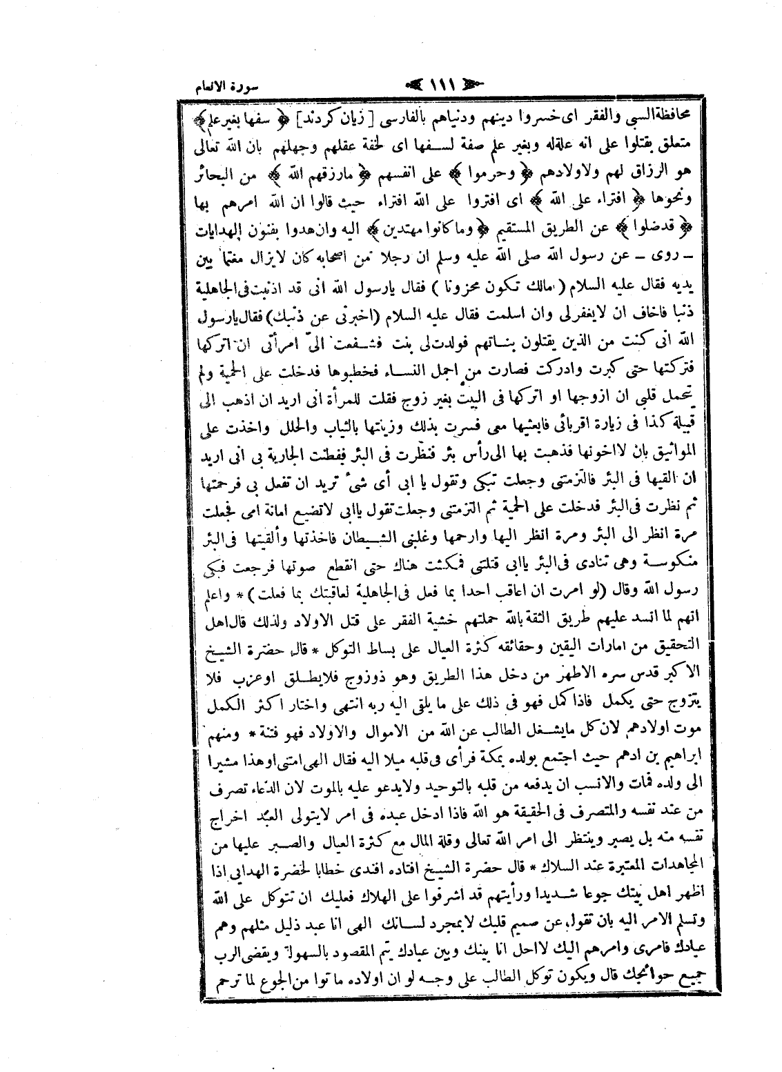 فابعثيها معى فسرت بذلك وزينتها بالثياب والحلل وأخذت على المواثيق بان لا اخونها فذهبت بها الى رأس بئر فنظرت فى البئر ففطنت الجارية بي انى أريد ان ألقيها فى البئر فالتزمتنى وجعلت تبكى وتقول يا ابى أي شىء تريد ان تفعل بي فرحمتها ثم نظرت فى البئر فدخلت على الحمية ثم التزمتنى وجعلت تقول يا ابى لا تضيع امانة أمي فجعلت مرة انظر الى البئر ومرة انظر إليها وارحمها وغلبنى الشيطان فاخذتها وألقيتها فى البئر منكوسة وهى تنادى فى البئر يا ابى قتلتنى فمكثت هناك حتى انقطع صوتها فرجعت فبكى رسول الله وقال (لو أمرت ان أعاقب أحدا بما فعل فى الجاهلية لعاقبتك بما فعلت) واعلم انهم لما انسد عليهم طريق الثقة بالله حملتهم خشية الفقر على قتل الأولاد ولذلك قال اهل التحقيق من امارات اليقين وحقائقه كثرة العيال على بساط التوكل قال حضرة الشيخ الأكبر قدس سره الأطهر من دخل هذا الطريق وهو ذو زوج فلا يطلق او عزب فلا يتزوج حتى يكمل فاذا كمل فهو فى ذلك على ما يلقى اليه ربه انتهى واختار اكثر الكمل موت أولادهم لان كل ما يشغل الطالب عن الله من الأموال والأولاد فهو فتنة ومنهم ابراهيم بن أدهم حيث اجتمع بولده بمكة فرأى فى قلبه ميلا اليه فقال الهى أمتني او هذا مشيرا الى ولده فمات والأنسب ان يدفعه من قلبه بالتوحيد ولا يدعو عليه بالموت لان الدعاء تصرف من عند نفسه والمتصرف فى الحقيقة هو الله فاذا ادخل عبده فى امر لا يتولى العبد إخراج نفسه منه بل يصير وينتظر الى امر الله تعالى وقلة المال مع كثرة العيال والصبر عليها من المجاهدات المعتبرة عند السلاك قال حضرة الشيخ افتاده افندى خطابا لحضرة الهدايى إذا اظهر اهل بيتك جوعا شديدا ورأيتهم قد أشرفوا على الهلاك فعليك ان تتوكل على الله وتسلم الأمر اليه بان تقول عن صميم قلبك لا بمجرد لسانك الهى انا عبد ذليل مثلهم وهم عبادك فامرى وأمرهم إليك لا أحل انا بينك وبين عبادك يتم المقصود بالسهولة ويقضى الرب جميع حوائجك قال ويكون توكل الطالب على وجه لو ان أولاده ما توا من الجوع لما ترحم