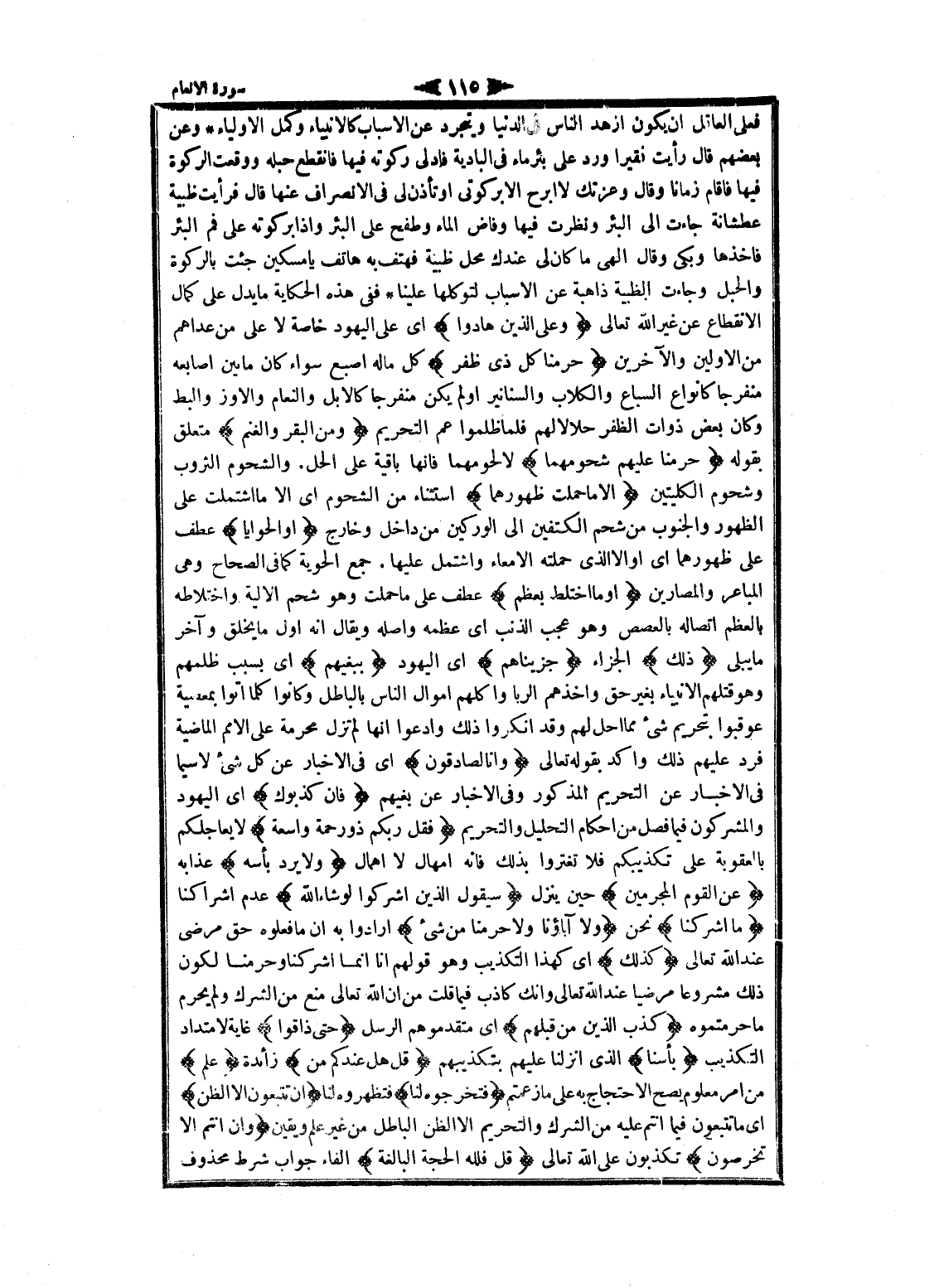 فعلى العاقل ان يكون ازهد الناس فى الدنيا ويتجرد عن الأسباب كالانبياء وكمل الأولياء وعن بعضهم قال رأيت فقيرا ورد على بئر ماء فى البادية فادلى ركوته فيها فانقطع حبله ووقعت الركوة فيها فاقام زمانا وقال وعزتك لا أبرح إلا بركوتي او تأذن لى فى الانصراف عنها قال فرأيت ظبية عطشانة جاءت الى البئر ونظرت فيها وفاض الماء وطفح على البئر وإذا بركوته على فم البئر فاخذها وبكى وقال الهى ما كان لى عندك محل ظبية فهتف به هاتف يا مسكين جئت بالركوة والحبل وجاءت الظبية ذاهبة عن الأسباب لتوكلها علينا ففى هذه الحكاية ما يدل على كمال الانقطاع عن غير الله تعالى وَعَلَى الَّذِينَ هادُوا اى على اليهود خاصة لا على من عداهم من الأولين والآخرين حَرَّمْنا كُلَّ ذِي ظُفُرٍ كل ما له إصبع سواء كان ما بين أصابعه منفرجا كانواع السباع والكلاب والسنانير أو لم يكن منفرجا كالابل والنعام والإوز والبط وكان بعض ذوات الظفر حلالا لهم فلما ظلموا عم التحريم وَمِنَ الْبَقَرِ وَالْغَنَمِ متعلق بقوله حَرَّمْنا عَلَيْهِمْ شُحُومَهُما لا لحومهما فانها باقية على الحل. والشحوم الثروب وشحوم الكليتين إِلَّا ما حَمَلَتْ ظُهُورُهُما استثناء من الشحوم اى الا ما اشتملت على الظهور والجنوب من شحم الكتفين الى الوركين من داخل وخارج أَوِ الْحَوايا عطف على ظهورهما اى او الا الذي حملته الأمعاء واشتمل عليها. جمع الحوية كما فى الصحاح وهى المباعر والمصارين أَوْ مَا اخْتَلَطَ بِعَظْمٍ عطف على ما حملت وهو شحم الالية واختلاطه بالعظم اتصاله بالعصص وهو عجب الذنب اى عظمه وأصله ويقال انه أول ما يخلق وآخر ما يبلى ذلِكَ الجزاء جَزَيْناهُمْ اى اليهود بِبَغْيِهِمْ اى بسبب ظلمهم وهو قتلهم الأنبياء بغير حق وأخذهم الربا وأكلهم اموال الناس بالباطل وكانوا كلما أتوا بمعصية عوقبوا بتحريم شىء مما أحل لهم وقد أنكروا ذلك وادعوا انها لم تزل محرمة على الأمم الماضية فرد عليهم ذلك وأكد بقوله تعالى وَإِنَّا لَصادِقُونَ اى فى الاخبار عن كل شىء لا سيما فى الاخبار عن التحريم المذكور وفى الاخبار عن بغيهم فَإِنْ كَذَّبُوكَ اى اليهود والمشركون فيما فصل من احكام التحليل والتحريم فَقُلْ رَبُّكُمْ ذُو رَحْمَةٍ واسِعَةٍ لا يعاجلكم بالعقوبة على تكذيبكم فلا تغتروا بذلك فانه امهال لا إهمال وَلا يُرَدُّ بَأْسُهُ عذابه عَنِ الْقَوْمِ الْمُجْرِمِينَ حين ينزل سَيَقُولُ الَّذِينَ أَشْرَكُوا لَوْ شاءَ اللَّهُ عدم اشراكنا ما أَشْرَكْنا نحن وَلا آباؤُنا وَلا حَرَّمْنا مِنْ شَيْءٍ أرادوا به ان ما فعلوه حق مرضى عند الله تعالى كَذلِكَ اى كهذا التكذيب وهو قولهم انا انما أشركنا وحرمنا لكون ذلك مشروعا مرضيا عند الله تعالى وانك كاذب فيما قلت من ان الله تعالى منع من الشرك ولم يحرم ما حرمتموه كَذَّبَ الَّذِينَ مِنْ قَبْلِهِمْ اى متقدموهم الرسل حَتَّى ذاقُوا غاية لامتداد التكذيب بَأْسَنا الذي أنزلنا عليهم بتكذيبهم قُلْ هَلْ عِنْدَكُمْ مِنْ زائدة عِلْمٍ من امر معلوم يصح الاحتجاج به على ما زعمتم فَتُخْرِجُوهُ لَنا فتظهروه لنا إِنْ تَتَّبِعُونَ إِلَّا الظَّنَّ اى ما تتبعون فيما أنتم عليه من الشرك والتحريم الا الظن الباطل من غير علم ويقين وَإِنْ أَنْتُمْ إِلَّا تَخْرُصُونَ تكذبون على الله تعالى قُلْ فَلِلَّهِ الْحُجَّةُ الْبالِغَةُ الفاء جواب شرط محذوف