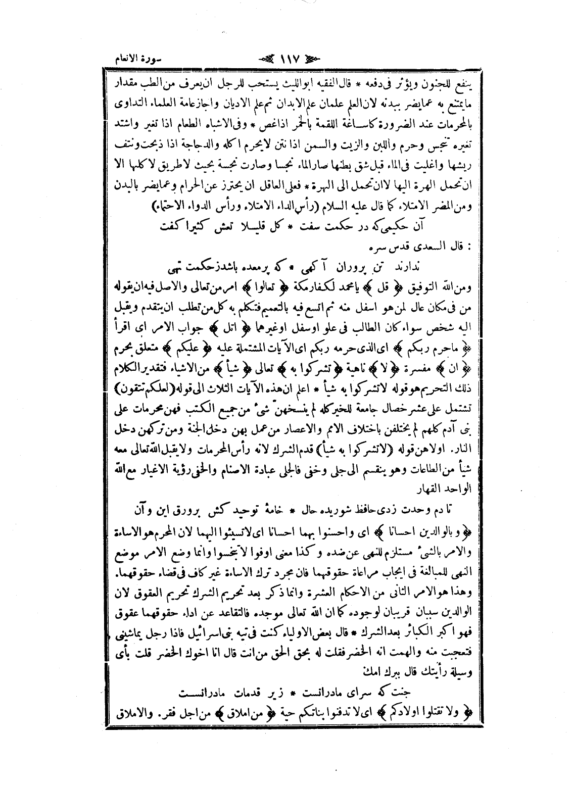 ومن الله التوفيق قُلْ يا محمد لكفار مكة تَعالَوْا امر من تعالى والأصل فيه ان يقوله من فى مكان عال لمن هو أسفل منه ثم اتسع فيه بالتعميم فتكلم به كل من تطلب ان يتقدم ويقبل اليه شخص سواء كان الطالب فى علو او سفل او غيرهما أَتْلُ جواب الأمر اى اقرأ ما حَرَّمَ رَبُّكُمْ اى الذي حرمه ربكم اى الآيات المشتملة عليه عَلَيْكُمْ متعلق بحرم ان مفسرة لا ناهية تُشْرِكُوا بِهِ تعالى شَيْئاً من الأشياء فتقدير الكلام ذلك التحريم هو قوله لا تشركوا به شيأ اعلم ان هذه الآيات الثلاث الى قوله لَعَلَّكُمْ تَتَّقُونَ تشتمل على عشر خصال جامعة للخير كله لم ينسخهنّ شىء من جميع الكتب فهن محرمات على بنى آدم كلهم لم يختلفن باختلاف الأمم والاعصار من عمل بهن دخل الجنة ومن تركهن دخل النار. اولاهن قوله أَلَّا تُشْرِكُوا بِهِ شَيْئاً قدم الشرك لانه رأس المحرمات ولا يقبل الله تعالى معه شيأ من الطاعات وهو ينقسم الى جلى وخفى فالجلى عبادة الأصنام والخفي رؤية الأغيار مع الله الواحد القهار