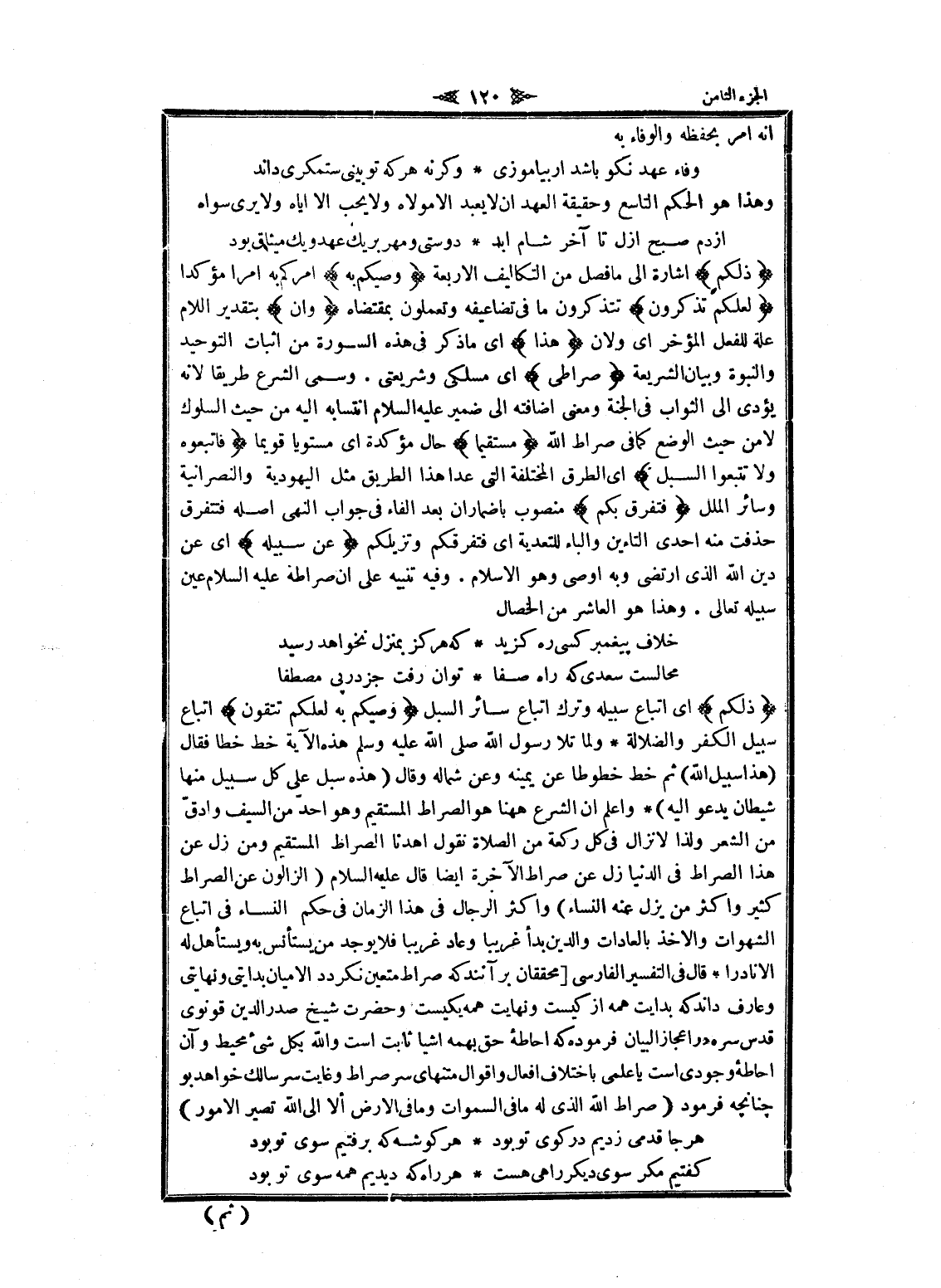 ذلِكُمْ اى اتباع سبيله وترك اتباع سائر السبل وَصَّاكُمْ بِهِ لَعَلَّكُمْ تَتَّقُونَ اتباع سبيل الكفر والضلالة ولما تلا رسول الله صلى الله عليه وسلم هذه الآية خط خطا فقال (هذا سبيل الله) ثم خط خطوطا عن يمينه وعن شماله وقال (هذه سبل على كل سبيل منها شيطان يدعو اليه) واعلم ان الشرع هاهنا هو الصراط المستقيم وهو احدّ من السيف وادقّ من الشعر ولذا لا نزال فى كل ركعة من الصلاة نقول اهدنا الصراط المستقيم ومن زل عن هذا الصراط فى الدنيا زل عن صراط الآخرة ايضا قال عليه السلام (الزالون عن الصراط كثير واكثر من يزل عنه النساء) واكثر الرجال فى هذا الزمان فى حكم النساء فى اتباع الشهوات والاخذ بالعادات والدين بدأ غريبا وعاد غريبا فلا يوجد من يستأنس به ويستأهل له الا نادرا قال فى التفسير الفارسي [محققان بر آنند كه صراط متعين نكردد الا ميان بدايتى ونهايتى وعارف داند كه بدايت همه از كيست ونهايت همه يكيست وحضرت شيخ صدر الدين قونوى قدس سره در اعجاز البيان فرموده كه احاطه حق بهمه اشيا ثابت است والله بكل شىء محيط وآن احاطه وجودى است يا علمى باختلاف افعال واقوال متنهاى سر صراط وغايت سر سالك خواهد بو چنانچهـ فرمود صِراطِ اللَّهِ الَّذِي لَهُ ما فِي السَّماواتِ وَما فِي الْأَرْضِ أَلا إِلَى اللَّهِ تَصِيرُ الْأُمُورُ