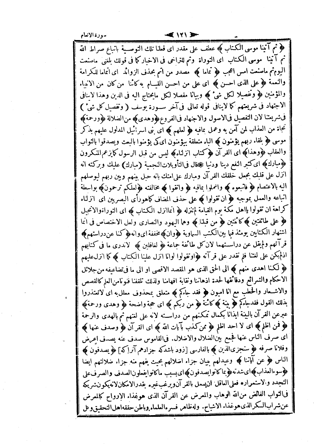 ثُمَّ آتَيْنا مُوسَى الْكِتابَ عطف على مقدر اى فعلنا تلك التوصية باتباع صراط الله ثم آتينا موسى الكتاب اى التوراة وثم للتراخى فى الاخبار كما فى قولك بلغني ما صنعت اليوم ثم ما صنعت أمس اعجب تَماماً مصدر من أتم بحذف الزوائد اى إتماما للكرامة والنعمة عَلَى الَّذِي أَحْسَنَ اى على من احسن القيام به كائنا من كان من الأنبياء والمؤمنين وَتَفْصِيلًا لِكُلِّ شَيْءٍ وبيانا مفصلا لكل ما يحتاج اليه فى الدين وهذا لا ينافى الاجتهاد فى شريعتهم كما لا ينافى قوله تعالى فى آخر سورة يوسف وَتَفْصِيلَ كُلِّ شَيْءٍ فى شريعتنا لان التفصيل فى الأصول والاجتهاد فى الفروع وَهُدىً من الضلالة وَرَحْمَةً نجاة من العذاب لمن آمن به وعمل بما فيه لَعَلَّهُمْ اى بنى إسرائيل المدلول عليهم بذكر موسى بِلِقاءِ رَبِّهِمْ يُؤْمِنُونَ الباء متعلقة بيؤمنون اى كى يؤمنوا بالبعث ويصدقوا بالثواب والعقاب وَهذا اى القرآن كِتابٌ أَنْزَلْناهُ ليس من قبل الرسول كما يزعم المنكرون مُبارَكٌ اى كثير النفع دينا ودنيا قال فى التأويلات النجمية مُبارَكٌ عليك وبركته انه انزل على قلبك بجعل خلقك القرآن ومبارك على أمتك بانه حبل بينهم وبين ربهم ليوصلهم اليه بالاعتصام فَاتَّبِعُوهُ واعملوا بما فيه وَاتَّقُوا مخالفته لَعَلَّكُمْ تُرْحَمُونَ بواسطة اتباعه والعمل بموجبه أَنْ تَقُولُوا على حذف المضاف كما هو رأى البصريين اى أنزلناه كراهة ان تقولوا يا اهل مكة يوم القيامة لم تنزله إِنَّما أُنْزِلَ الْكِتابُ اى التوراة والإنجيل عَلى طائِفَتَيْنِ كائنتين مِنْ قَبْلِنا وهما اليهود والنصارى ولعل الاختصاص فى انما اشتهار الكتابين يومئذ فيما بين الكتب السماوية وَإِنْ مخففة اى وانه كُنَّا عَنْ دِراسَتِهِمْ قرآتهم ولم يقل عن دراستهما لان كل طائفة جماعة لَغافِلِينَ لا ندرى ما فى كتابهم إذ لم يكن على لغتنا فلم نقدر على قرآنه أَوْ تَقُولُوا لَوْ أَنَّا أُنْزِلَ عَلَيْنَا الْكِتابُ كما انزل عليهم لَكُنَّا أَهْدى مِنْهُمْ الى الحق الذي هو المقصد الأقصى او الى ما فى تضاعيفه من جلائل الاحكام والشرائع ودقائقها لحدة أذهاننا ونقابة افهامنا ولذلك تلقفنا فنونا من العلم كالقصص والاشعار والخطب مع انا أميون فَقَدْ جاءَكُمْ متعلق بمحذوف معلل به اى لا تعتذروا بذلك القول فقد جاءكم بَيِّنَةٌ كائنة مِنْ رَبِّكُمْ اى حجة واضحة وَهُدىً وَرَحْمَةٌ عبر عن القرآن بالبينة إيذانا بكمال تمكنهم من دراسته لانه على لغتهم ثم بالهدى والرحمة فَمَنْ أَظْلَمُ اى لا أحد اظلم مِمَّنْ كَذَّبَ بِآياتِ اللَّهِ اى القرآن وَصَدَفَ عَنْها اى صرف الناس عنها فجمع بين الضلال والإضلال. فى القاموس صدف عنه يصدق اعرض وفلانا صرفه سَنَجْزِي الَّذِينَ بالفارسي [زود باشد كه جزا دهم آنرا كه] يَصْدِفُونَ الناس عَنْ آياتِنا وعيد لهم ببيان جزاء اضلالهم بحيث يفهم منه جزاء ضلالتهم ايضا سُوءَ الْعَذابِ اى شدته بِما كانُوا يَصْدِفُونَ اى بسبب ما كانوا يفعلون الصدف والصرف على التجدد ولاستمرار فعلى العاقل ان يعمل بالقرآن ويرغب غيره بقدر الإمكان لانه يكون شريكه فى الثواب الفائض من الله الوهاب والمعرض عن القرآن الذي هو غذاء الأرواح كالمعرض عن شراب السكر الذي هو غذاء الأشباح. وله ظاهر فسره العلماء وباطن حققه اهل التحقيق وكل