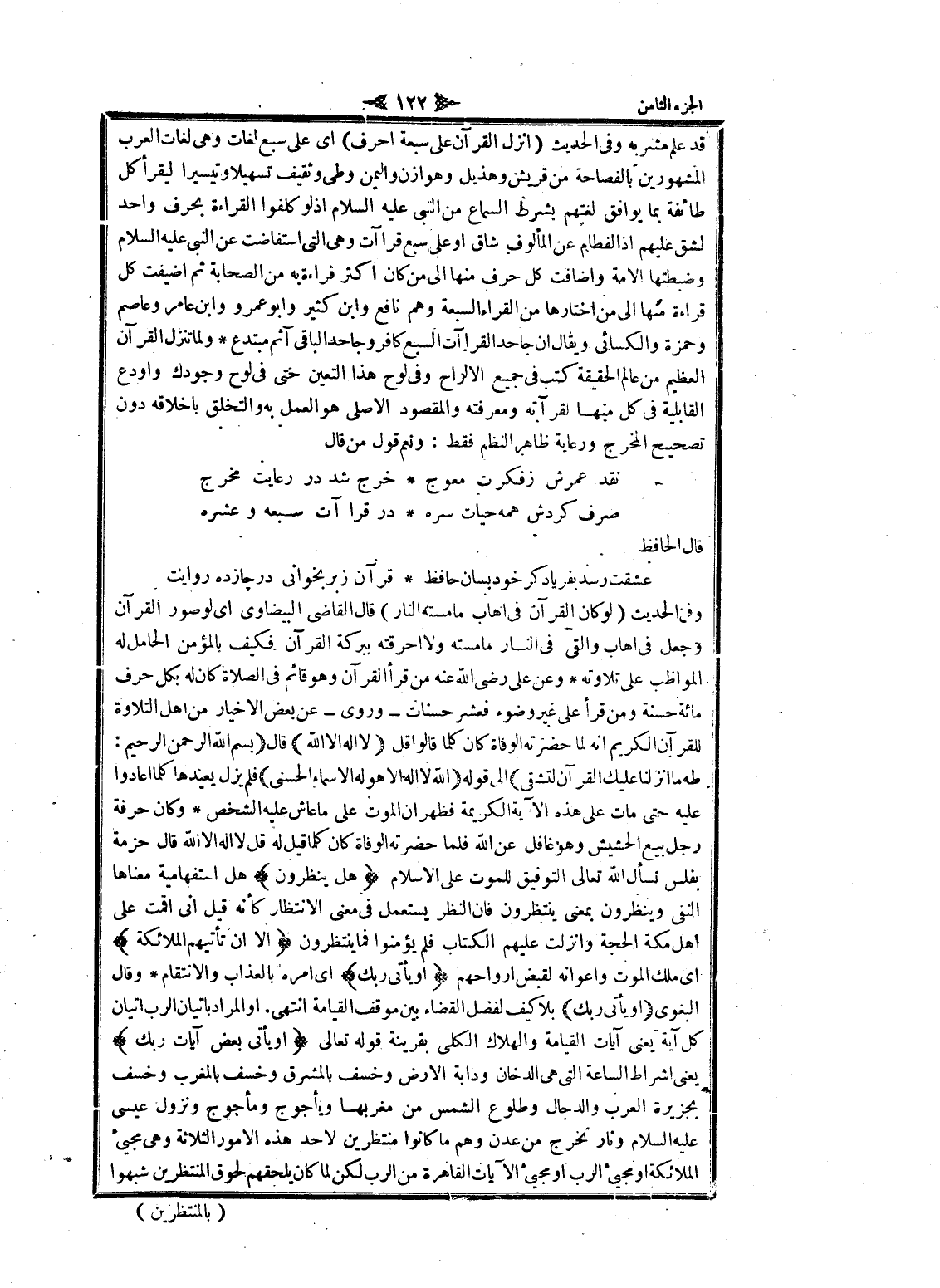 قد علم مشربه وفى الحديث (انزل القرآن على سبعة أحرف) اى على سبع لغات وهى لغات العرب المشهورين بالفصاحة من قريش وهذيل وهوازن واليمن وطى وثقيف تسهيلا وتيسيرا ليقرأ كل طائفة بما يوافق لغتهم بشرط السماع من النبي عليه السلام إذ لو كلفوا القراءة بحرف واحد لشق عليهم إذ الفطام عن المألوف شاق او على سبع قراءات وهى التي استفاضت عن النبي عليه السلام وضبطتها الامة واضافت كل حرف منها الى من كان اكثر فراءة به من الصحابة ثم أضيفت كل قراءة منها الى من اختارها من القراء السبعة وهم نافع وابن كثير وابو عمرو وابن عامر وعاصم وحمزة والكسائي ويقال ان جاحد القراآت السبع كافر وجاحد الباقي آثم مبتدع ولما تنزل القرآن العظيم من عالم الحقيقة كتب فى جميع الألواح وفى لوح هذا التعين حتى فى لوح وجودك وأودع القابلية فى كل منها لقرآته ومعرفته والمقصود الأصلي هو العمل به والتخلق بأخلاقه دون تصحيح المخرج ورعاية ظاهر النظم فقط: ونعم قول من قال