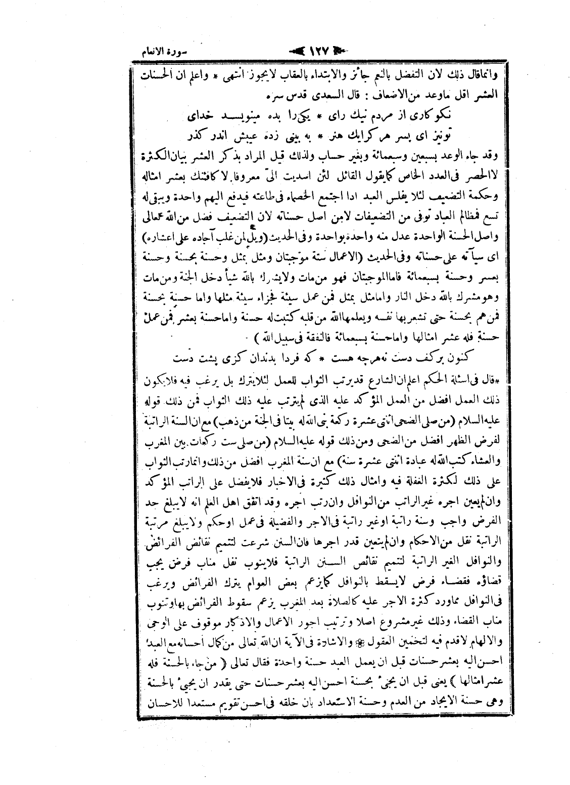 قال فى اسئلة الحكم اعلم ان الشارع قد يرتب الثواب للعمل لئلا يترك بل يرغب فيه فلا يكون ذلك العمل أفضل من العمل المؤكد عليه الذي لم يترتب عليه ذلك الثواب فمن ذلك قوله عليه السلام (من صلى الضحى اثنتي عشرة ركعة بنى الله له بيتا فى الجنة من ذهب) مع ان السنة الراتبة لفرض الظهر أفضل من الضحى ومن ذلك قوله عليه السلام (من صلى ست ركعات بين المغرب والعشاء كتب الله له عبادة اثنتي عشرة سنة) مع ان سنة المغرب أفضل من ذلك وانما رتب الثواب على ذلك لكثرة الغفلة فيه وأمثال ذلك كثيرة فى الاخبار فلا يفضل على الراتب المؤكد وان لم يعين اجره غير الراتب من النوافل وان رتب اجره وقد اتفق اهل العلم انه لا يبلغ حد الفرض واجب وسنة راتبة او غير راتبة فى الاجر والفضيلة فى عمل او حكم ولا يبلغ مرتبة الراتبة نقل من الاحكام وان لم يتعين قدر أجرها فان السنن شرعت لتتميم نقائض الفرائض والنوافل الغير الراتبة لتتميم نقائص السنن الراتبة فلا ينوب نفل مناب فرض يجب قضاؤه فقضاء فرض لا يسقط بالنوافل كما يزعم بعض العوام يترك الفرائض ويرغب فى النوافل مما ورد كثرة الاجر عليه كالصلاة بعد المغرب يزعم سقوط الفرائض بها وتنوب مناب القضاء وذلك غير مشروع أصلا وترتيب أجور الأعمال والاذكار موقوف على الوحى والإلهام لا قدم فيه لتخمين العقول والاشارة فى الآية ان الله تعالى من كمال إحسانه مع العبد احسن اليه بعشر حسنات قبل ان يعمل العبد حسنة واحدة فقال تعالى مَنْ جاءَ بِالْحَسَنَةِ فَلَهُ عَشْرُ أَمْثالِها يعنى قبل ان يجىء بحسنة احسن اليه بعشر حسنات حتى يقدر ان يجيىء بالحسنة وهى حسنة الإيجاد من العدم وحسنة الاستعداد بان خلقه فى احسن تقويم مستعدا للاحسان