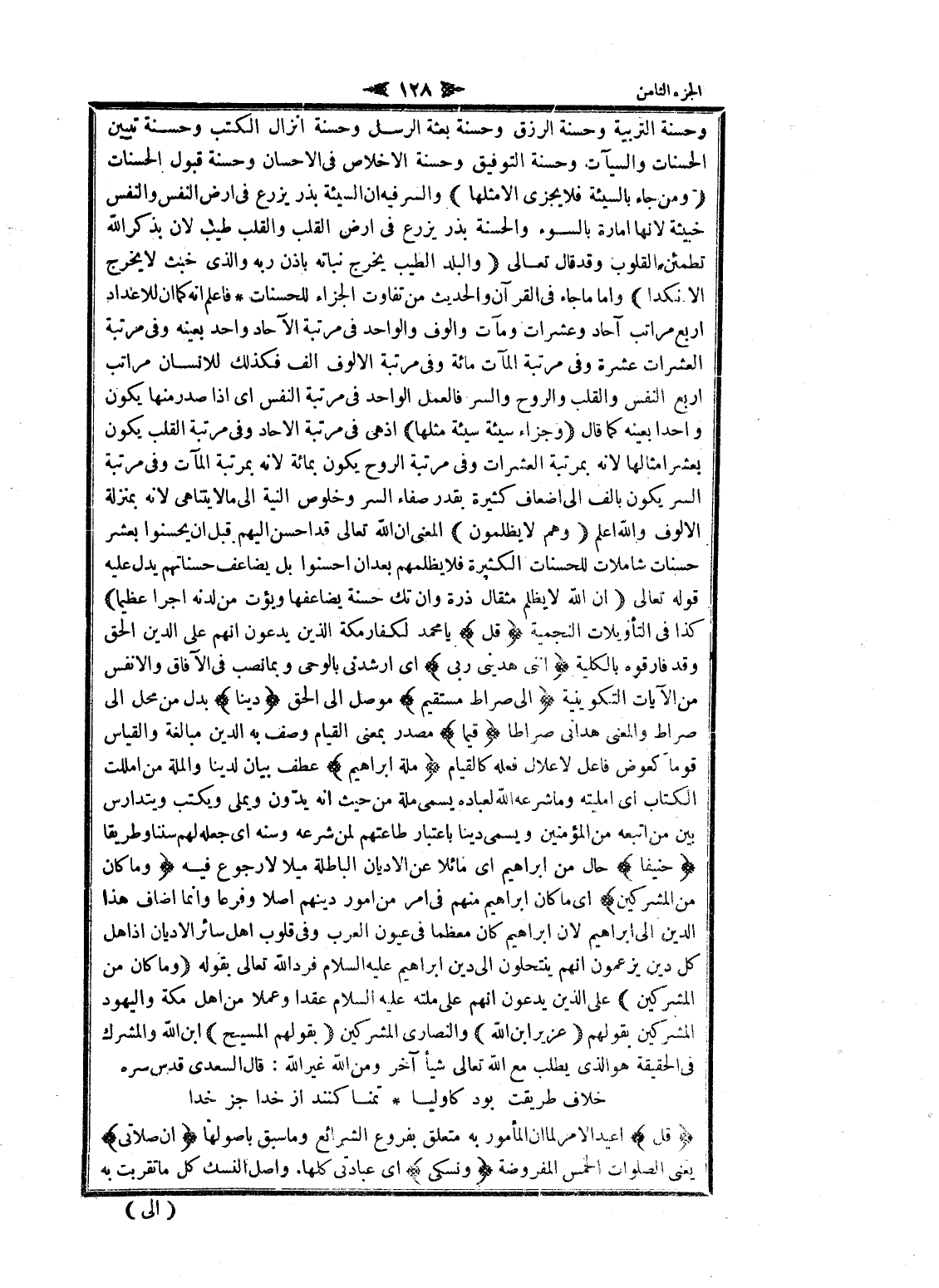 وحسنة التربية وحسنة الرزق وحسنة بعثة الرسل وحسنة إنزال الكتب وحسنة تبيين الحسنات والسيئات وحسنة التوفيق وحسنة الإخلاص فى الإحسان وحسنة قبول الحسنات وَمَنْ جاءَ بِالسَّيِّئَةِ فَلا يُجْزى إِلَّا مِثْلَها والسر فيه ان السيئة بذر يزرع فى ارض النفس والنفس خبيثة لانها امارة بالسوء والحسنة بذر يزرع فى ارض القلب والقلب طيب لان بذكر الله تطمئن القلوب وقد قال تعالى وَالْبَلَدُ الطَّيِّبُ يَخْرُجُ نَباتُهُ بِإِذْنِ رَبِّهِ وَالَّذِي خَبُثَ لا يَخْرُجُ إِلَّا نَكِداً واما ما جاء فى القرآن والحديث من تفاوت الجزاء للحسنات فاعلم انه كما ان للاعداد اربع مراتب آحاد وعشرات ومات وألوف والواحد فى مرتبة الآحاد واحد بعينه وفى مرتبة العشرات عشرة وفى مرتبة المآت مائة وفى مرتبة الألوف الف فكذلك للانسان مراتب اربع النفس والقلب والروح والسر فالعمل الواحد فى مرتبة النفس اى إذا صدر منها يكون واحدا بعينه كما قال وَجَزاءُ سَيِّئَةٍ سَيِّئَةٌ مِثْلُها إذ هى فى مرتبة الآحاد وفى مرتبة القلب يكون بعشر أمثالها لانه بمرتبة العشرات وفى مرتبة الروح يكون بمائة لانه بمرتبة المآت وفى مرتبة السر يكون بألف الى أضعاف كثيرة بقدر صفاء السر وخلوص النية الى ما لا يتناهى لانه بمنزلة الألوف والله اعلم وَهُمْ لا يُظْلَمُونَ المعنى ان الله تعالى قد احسن إليهم قبل ان يحسنوا بعشر حسنات شاملات للحسنات الكثيرة فلا يظلمهم بعد ان أحسنوا بل يضاعف حسناتهم يدل عليه قوله تعالى إِنَّ اللَّهَ لا يَظْلِمُ مِثْقالَ ذَرَّةٍ وَإِنْ تَكُ حَسَنَةً يُضاعِفْها وَيُؤْتِ مِنْ لَدُنْهُ أَجْراً عَظِيماً كذا فى التأويلات النجمية قُلْ يا محمد لكفار مكة الذين يدعون انهم على الدين الحق وقد فارقوه بالكلية إِنَّنِي هَدانِي رَبِّي اى أرشدني بالوحى وبما نصب فى الآفاق والأنفس من الآيات التكوينية إِلى صِراطٍ مُسْتَقِيمٍ موصل الى الحق دِيناً بدل من محل الى صراط والمعنى هدانى صراطا قِيَماً مصدر بمعنى القيام وصف به الدين مبالغة والقياس قوما كعوض فاعل لاعلال فعله كالقيام مِلَّةَ إِبْراهِيمَ عطف بيان لدينا والملة من أمللت الكتاب اى أمليته وما شرعه الله لعباده يسمى ملة من حيث انه يدّون ويملى ويكتب ويتدارس بين من اتبعه من المؤمنين ويسمى دينا باعتبار طاعتهم لمن شرعه وسنه اى جعله لهم سننا وطريقا حَنِيفاً حال من ابراهيم اى مائلا عن الأديان الباطلة ميلا لا رجوع فيه وَما كانَ مِنَ الْمُشْرِكِينَ اى ما كان ابراهيم منهم فى امر من امور دينهم أصلا وفرعا وانما أضاف هذا الدين الى ابراهيم لان ابراهيم كان معظما فى عيون العرب وفى قلوب اهل سائر الأديان إذ اهل كل دين يزعمون انهم ينتحلون الى دين ابراهيم عليه السلام فرد الله تعالى بقوله وَما كانَ مِنَ الْمُشْرِكِينَ على الذين يدعون انهم على ملته عليه السلام عقدا وعملا من اهل مكة واليهود المشركين بقولهم عُزَيْرٌ ابْنُ اللَّهِ والنصارى المشركين بقولهم الْمَسِيحُ ابْنُ اللَّهِ والمشرك فى الحقيقة هو الذي يطلب مع الله تعالى شيأ آخر ومن الله غير الله: قال السعدي قدس سره