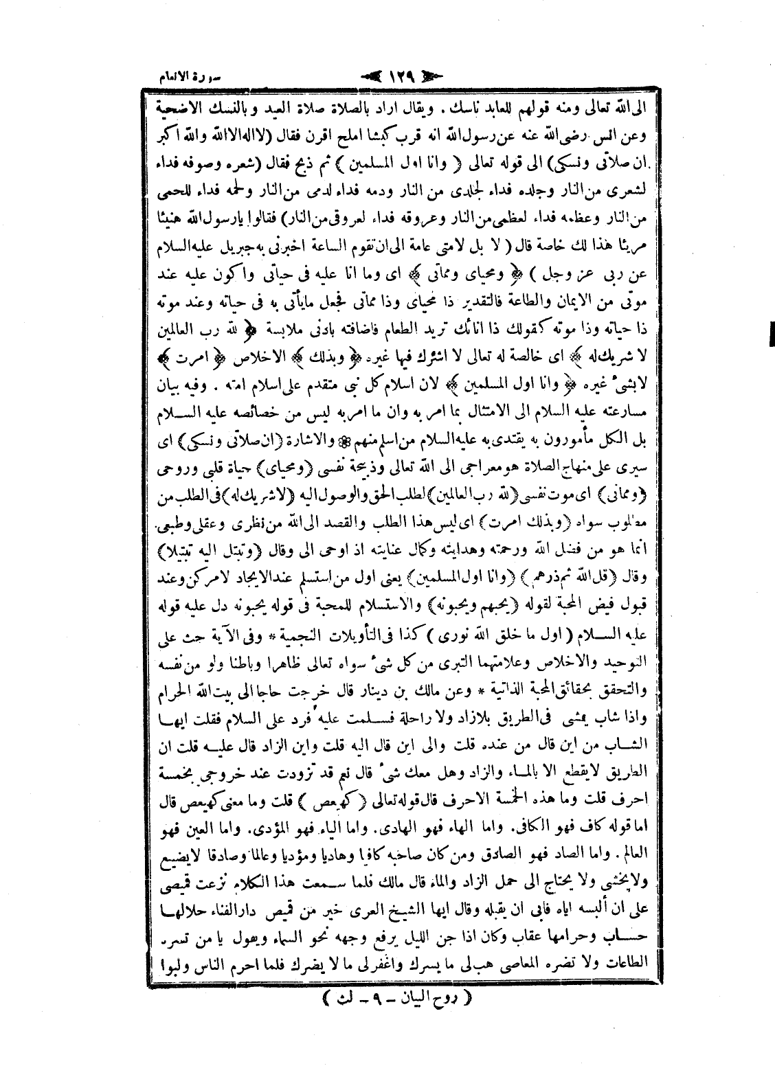 الى الله تعالى ومنه قولهم للعابد ناسك. ويقال أراد بالصلاة صلاة العيد وبالنسك الاضحية وعن انس رضى الله عنه عن رسول الله انه قرب كبشا أملح اقرن فقال (لا اله الا الله والله اكبر ان صلاتى ونسكى) الى قوله تعالى وَأَنَا أَوَّلُ الْمُسْلِمِينَ ثم ذبح فقال (شعره وصوفه فداء لشعرى من النار وجلده فداء لجلدى من النار ودمه فداء لدمى من النار ولحمه فداء للحمى من النار وعظمه فداء لعظمى من النار وعروقه فداء لعروقى من النار) فقالوا يا رسول الله هنيئا مريئا هذا لك خاصة قال (لا بل لامتى عامة الى ان تقوم الساعة أخبرني به جبريل عليه السلام عن ربى عز وجل) وَمَحْيايَ وَمَماتِي اى وما انا عليه فى حياتى وأكون عليه عند موتى من الايمان والطاعة فالتقدير ذا محياى وذا مماتى فجعل ما يأتى به فى حياته وعند موته ذا حياته وذا موته كقولك ذا انائك تريد الطعام فاضافته بأدنى ملابسة لِلَّهِ رَبِّ الْعالَمِينَ لا شَرِيكَ لَهُ اى خالصة له تعالى لا أشرك فيها غيره وَبِذلِكَ الإخلاص أُمِرْتُ لا بشىء غيره وَأَنَا أَوَّلُ الْمُسْلِمِينَ لان اسلام كل نبى متقدم على اسلام أمته. وفيه بيان مسارعته عليه السلام الى الامتثال بما امر به وان ما امر به ليس من خصائصه عليه السلام بل الكل مأمورون به يقتدى به عليه السلام من اسلم منهم والاشارة إِنَّ صَلاتِي وَنُسُكِي اى سيرى على منهاج الصلاة هو معراجى الى الله تعالى وذبيحة نفسى وَمَحْيايَ حياة قلبى وروحى وَمَماتِي اى موت نفسى لِلَّهِ رَبِّ الْعالَمِينَ لطلب الحق والوصول اليه لا شَرِيكَ لَهُ فى الطلب من مطلوب سواه وَبِذلِكَ أُمِرْتُ اى ليس هذا الطلب والقصد الى الله من نظرى وعقلى وطبعى انما هو من فضل الله ورحمته وهدايته وكمال عنايته إذ اوحى الى وقال وَتَبَتَّلْ إِلَيْهِ تَبْتِيلًا وقال قُلِ اللَّهُ ثُمَّ ذَرْهُمْ وَأَنَا أَوَّلُ الْمُسْلِمِينَ يعنى أول من استسلم عند الإيجاد لامركن وعند قبول فيض المحبة لقوله يُحِبُّهُمْ وَيُحِبُّونَهُ والاستسلام للمحبة فى قوله يحبونه دل عليه قوله عليه السلام (أول ما خلق الله نورى) كذا فى التأويلات النجمية وفى الآية حث على التوحيد والإخلاص وعلامتهما التبري من كل شىء سواه تعالى ظاهرا وباطنا ولو من نفسه والتحقق بحقائق المحبة الذاتية وعن مالك بن دينار قال خرجت حاجا الى بيت الله الحرام وإذا شاب يمشى فى الطريق بلا زاد ولا راحلة فسلمت عليه فرد على السلام فقلت ايها الشاب من اين قال من عنده قلت والى اين قال اليه قلت واين الزاد قال عليه قلت ان الطريق لا يقطع الا بالماء والزاد وهل معك شىء قال نعم قد تزودت عند خروجى بخمسة أحرف قلت وما هذه الخمسة الا حرف قال قوله تعالى كهيعص قلت وما معنى كهيعص قال اما قوله كاف فهو الكافي. واما الهاء فهو الهادي. واما الياء فهو المؤدى. واما العين فهو العالم. واما الصاد فهو الصادق ومن كان صاحبه كافيا وهاديا ومؤديا وعالما وصادقا لا يضيع ولا يخشى ولا يحتاج الى حمل الزاد والماء قال مالك فلما سمعت هذا الكلام نزعت قميصى على ان ألبسه إياه فابى ان يقبله وقال ايها الشيخ العرى خير من قميص دار الفناء حلالها حساب وحرامها عقاب وكان إذا جن الليل يرفع وجهه نحو السماء ويقول يا من تسره الطاعات ولا تضره المعاصي هب لى ما يسرك واغفر لي ما لا يضرك فلما احرم الناس ولبوا