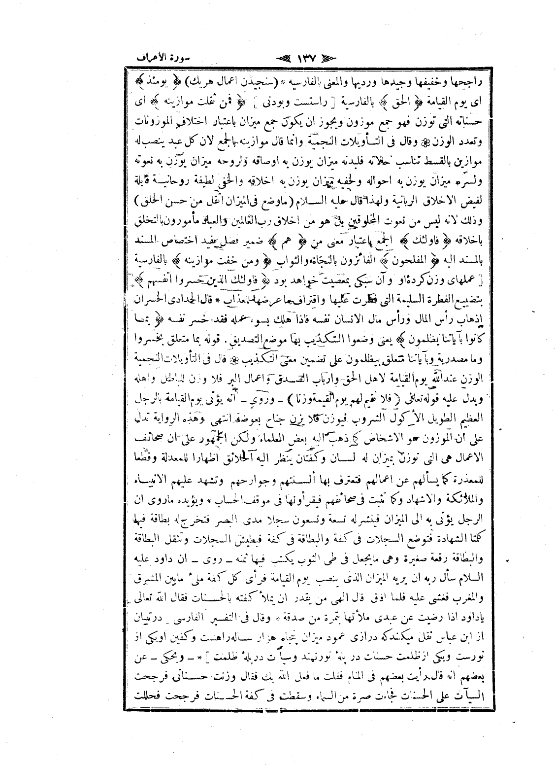 راجحها وخفيفها وجيدها ورديها والمعنى بالفارسيه (سنجيدن اعمال هر يك) يَوْمَئِذٍ اى يوم القيامة الْحَقُّ بالفارسية [راستست وبودنى] فَمَنْ ثَقُلَتْ مَوازِينُهُ اى حسناته التي توزن فهو جمع موزون ويجوز ان يكون جمع ميزان باعتبار اختلاف الموزونات وتعدد الوزن وقال فى التأويلات النجمية وانما قال موازينه بالجمع لان كل عبد ينصب له موازين بالقسط تناسب حالاته فلبدنه ميزان يوزن به أوصافه ولروحه ميزان يوزن به نعوته ولسره ميزان يوزن به أحواله ولخفيه ميزان يوزن به أخلاقه والخفي لطيفة روحانية قابلة لفيض الأخلاق الربانية ولهذا قال عليه السلام (ما وضع فى الميزان أثقل من حسن الخلق) وذلك لانه ليس من نعوت المخلوقين بل هو من اخلاق رب العالمين والعباد مأمورون بالتخلق بأخلاقه فَأُولئِكَ الجمع باعتبار معنى من هُمُ ضمير فصل يفيد اختصاص المسند بالمسند اليه الْمُفْلِحُونَ الفائزون بالنجاة والثواب وَمَنْ خَفَّتْ مَوازِينُهُ بالفارسية [عملهاى وزن كرده او وآن سبكى بمعصيت خواهد بود فَأُولئِكَ الَّذِينَ خَسِرُوا أَنْفُسَهُمْ بتضييع الفطرة السليمة التي فطرت عليها واقتراف ما عرضها للعذاب قال الحدادي الخسران اذهاب رأس المال ورأس مال الإنسان نفسه فاذا هلك بسوء عمله فقد حسر نفسه بِما كانُوا بِآياتِنا يَظْلِمُونَ يعنى وضعوا التكذيب بها موضع التصديق. قوله بما متعلق بخسروا وما مصدرية وبآياتنا متعلق بيظلمون على تضمين معنى التكذيب قال فى التأويلات النجمية الوزن عند الله يوم القيامة لاهل الحق وارباب الصدق واعمال البر فلا وزن للباطل واهله ويدل عليه قوله تعالى فَلا نُقِيمُ لَهُمْ يَوْمَ الْقِيامَةِ وَزْناً- وروى- انه يؤتى يوم القيامة بالرجل العظيم الطويل الأكول الشروب فيوزن فلا يزن جناح بعوضة انتهى وهذه الرواية تدل على ان الموزون هو الاشخاص كما ذهب اليه بعض العلماء ولكن الجمهور على ان صحائف الأعمال هى التي توزن بميزان له لسان وكفتان ينظر اليه الخلائق إظهارا للمعدلة وقطعا للمعذرة كما يسألهم عن أعمالهم فتعترف بها ألسنتهم وجوارحهم وتشهد عليهم الأنبياء والملائكة والاشهاد وكما تثبت فى صحائفهم فيقرأونها فى موقف الحساب ويؤيده ما روى ان الرجل يؤتى به الى الميزان فينشر له تسعة وتسعون سجلا مدى البصر فتخرج له بطاقة فيها كلمتا الشهادة فتوضع السجلات فى كفة والبطاقة فى كفة فيطيش السجلات وتثقل البطاقة والبطاقة رقعة صغيرة وهى ما يجعل فى طى الثوب يكتب فيها ثمنه- روى- ان داود عليه السلام سأل ربه ان يريه الميزان الذي ينصب يوم القيامة فرأى كل كفة ملىء ما بين المشرق والمغرب فغشى عليه فلما أفاق قال الهى من يقدر ان يملأ كفته بالحسنات فقال الله تعالى يا داود إذا رضيت عن عبدى ملأتها بتمرة من صدقة وقال فى التفسير الفارسي [در تبيان از ابن عباس نقل ميكند كه درازى عمود ميزان پنجاه هزار ساله راهست وكفين او يكى از نورست ويكى از ظلمت حسنات در پله نور نهند وسيآت در پله ظلمت]- ويحكى- عن بعضهم انه قال رأيت بعضهم فى المنام فقلت ما فعل الله بك فقال وزنت حسناتى فرجحت السيئات على الحسنات فجاءت صرة من السماء وسقطت فى كفة الحسنات فرجحت فحللت