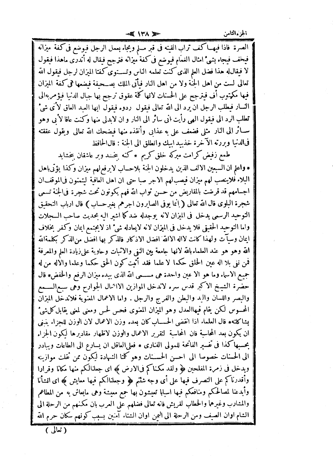 الصرة فاذا فيها كف تراب ألقيته فى قبر مسلم ويجاء بعمل الرجل فيوضع فى كفة ميزانه فيخف فيجاء بشىء أمثال الغمام فيوضع فى كفة ميزانه فترجح فيقال له أتدري ما هذا فيقول لا فيقال له هذا فضل العلم الذي كنت تعلمه الناس وتستوى كفتا الميزان لرجل فيقول الله تعالى لست من اهل الجنة ولا من اهل النار فيأتى الملك بصحيفة فيضعها فى كفة الميزان فيها مكتوب أف فيترجح على الحسنات لانها كلمة عقوق ترجح بها جبال الدنيا فيؤمر به الى النار فيطلب الرجل ان يرد الى الله تعالى فيقول ردوه فيقول ايها العبد العاق لأى شىء تطلب الرد الى فيقول الهى رأيت انى سائر الى النار وان لا بدلى منها وكنت عاقا لأبى وهو سائر الى النار مثلى فضعف على به عذابى وأنقذه منها فيضحك الله تعالى ويقول عققته فى الدنيا وبررته الآخرة خذ بيد أبيك وانطلق الى الجنة: قال الحافظ