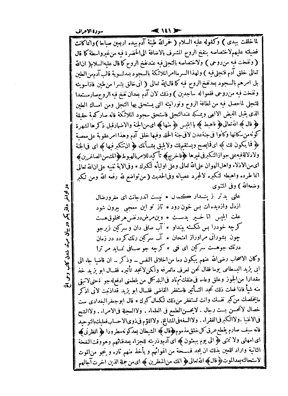 وكان الاصحاب رضى الله عنهم يبكون دما من اخلاق النفس- وذكر- ان قاضيا جاء الى ابى يزيد البسطامي يوما فقال نحن نعرف ما تعرفه ولكن لا نجد تأثيره فقال ابو يزيد خذ مقدارا من الجوز وعلق وعاءه فى عنقك ثم ناد فى البلد كل من يلطمنى ادفع له جوزة حتى لا تبقى منه شيأ فاذا فعلت ذلك تجد التأثير فاستغفر القاضي فقال ابو يزيد قد أذنبت لانى اذكر ما يخلصك من كبر نفسك وأنت تستغفر من ذلك لكمال كبرك قال ابو جعفر البغدادي ست خصال لا تحسن بست رجال. لا يحسن الطمع فى العلماء. ولا العجلة فى الأمراء. ولا الشح فى الأغنياء. ولا الكبر فى الفقراء. ولا السفه فى المشايخ. ولا اللؤم فى ذوى الاحساب فعليك بالتوحيد فانه سيف صارم يقطع عرق كل خلق مذموم قالَ الشيطان بعد كونه مطرودا أَنْظِرْنِي اى أمهلني ولا تمتنى إِلى يَوْمِ يُبْعَثُونَ اى آدم وذريته للجزاء بعد فنائهم وهو وقت النفخة الثانية وأراد اللعين بذلك ان يجد فسحة من اغوائهم ويأخذ منهم ثاره وينجو من الموت لاستحالته بعد الموت قالَ الله تعالى إِنَّكَ مِنَ الْمُنْظَرِينَ اى من جملة الذين أخرت آجالهم