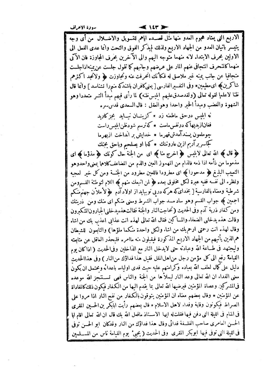 الأربع التي يعتاد هجوم العدو منها مثل قصده إياهم للتسويل والإضلال من أي وجه يتيسر بإتيان العدو من الجهاد الأربع ولذلك لم يذكر الفوق والتحت وانما عدى الفعل الى الأولين بحرف الابتداء لانه منهما متوجه إليهم والى الآخرين بحرف المجاوزة فان الآتي منهما كالمنحرف المتجافى عنهم المار على عرضهم وجانبهم كما تقول جلست عن يمينه إذا جلست متجافيا عن جانب يمينه غير ملاصق له فكأنك انحرفت عنه وتجاوزت وَلا تَجِدُ أَكْثَرَهُمْ شاكِرِينَ اى مطيعين وفى التفسير الفارسي [يعنى كافران باشند كه منعم را نشناسد] وانما قال ظنا لا علما لقوله تعالى وَلَقَدْ صَدَّقَ عَلَيْهِمْ إِبْلِيسُ ظَنَّهُ لما رأى فيهم مبدأ الشر متعددا وهو الشهوة والغضب ومبدأ الخير واحدا وهو العقل: قال السعدي قدس سره
