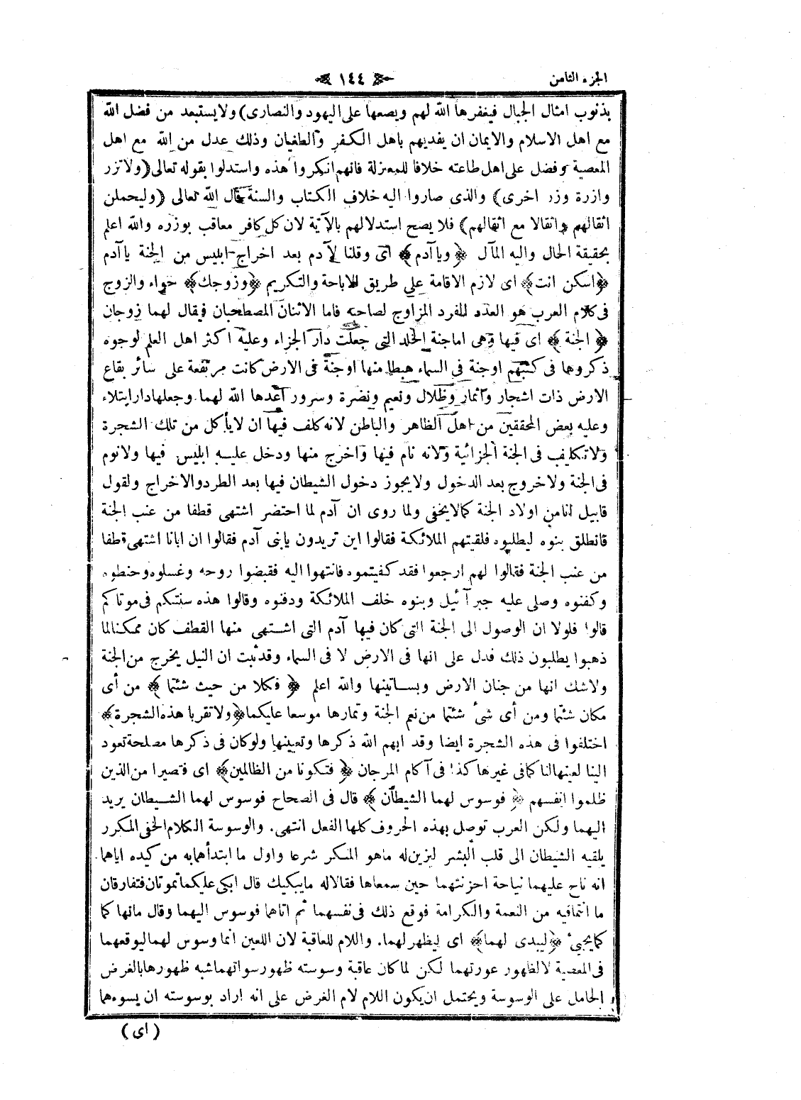 بذنوب أمثال الجبال فيغفرها الله لهم ويصعها على اليهود والنصارى) ولا يستبعد من فضل الله مع اهل الإسلام والايمان ان يفديهم باهل الكفر والطغيان وذلك عدل من الله مع اهل المعصية وفضل على اهل طاعته خلافا للمعزلة فانهم أنكروا هذه واستدلوا بقوله تعالى وَلا تَزِرُ وازِرَةٌ وِزْرَ أُخْرى والذي صاروا اليه خلاف الكتاب والسنة قال الله تعالى وَلَيَحْمِلُنَّ أَثْقالَهُمْ وَأَثْقالًا مَعَ أَثْقالِهِمْ فلا يصح استدلالهم بالآية لان كل كافر معاقب بوزره والله اعلم بحقيقة الحال واليه المآل وَيا آدَمُ اى وقلنا لآدم بعد إخراج إبليس من الجنة يا آدم اسْكُنْ أَنْتَ اى لازم الاقامة على طريق الإباحة والتكريم وَزَوْجُكَ حواء والزوج فى كلام العرب هو العدد الفرد المزاوج لصاحبه فاما الاثنان المصطحبان فيقال لهما زوجان الْجَنَّةَ اى قيها وهى اما جنة الخلد التي جعلت دار الجزاء وعليه اكثر اهل العلم لوجوه ذكروها فى كتبهم او جنة فى السماء هبطا منها او جنة فى الأرض كانت مرتفعة على سائر بقاع الأرض ذات أشجار واثمار وظلال ونعيم ونضرة وسرور أعدها الله لهما وجعلها دار ابتلاء وعليه بعض المحققين من اهل الظاهر والباطن لانه كلف فيها ان لا يأكل من تلك الشجرة ولا تكليف فى الجنة الجزائية ولانه نام فيها واخرج منها ودخل عليه إبليس فيها ولا نوم فى الجنة ولا خروج بعد الدخول ولا يجوز دخول الشيطان فيها بعد الطرد والإخراج ولقول قابيل انا من أولاد الجنة كما لا يخفى ولما روى ان آدم لما احتضر اشتهى قطفا من عنب الجنة فانطلق بنوه ليطلبوه فلقيتهم الملائكة فقالوا اين تريدون يا بنى آدم فقالوا ان أبانا اشتهى قطفا من عنب الجنة فقالوا لهم ارجعوا فقد كفيتموه فانتهوا اليه فقبضوا روحه وغسلوه وحنطوه وكفنوه وصلى عليه جبرائيل وبنوه خلف الملائكة ودفنوه وقالوا هذه سنتكم فى موتاكم قالوا فلولا ان الوصول الى الجنة التي كان فيها آدم التي اشتهى منها القطف كان ممكنا لما ذهبوا يطلبون ذلك فدل على انها فى الأرض لا فى السماء وقد تبت ان النيل يخرج من الجنة ولا شك انها من جنان الأرض وبساتينها والله اعلم فَكُلا مِنْ حَيْثُ شِئْتُما من أي مكان شئتما ومن أي شىء شئتما من نعم الجنة وثمارها موسعا عليكما وَلا تَقْرَبا هذِهِ الشَّجَرَةَ اختلفوا فى هذه الشجرة ايضا وقد أبهم الله ذكرها وتعيينها ولو كان فى ذكرها مصلحة تعود إلينا لعينها لنا كما فى غيرها كذا فى آكام المرجان فَتَكُونا مِنَ الظَّالِمِينَ اى فتصيرا من الذين ظلموا أنفسهم فَوَسْوَسَ لَهُمَا الشَّيْطانُ قال فى الصحاح فوسوس لهما الشيطان يريد إليهما ولكن العرب توصل بهذه الحروف كلها الفعل انتهى. والوسوسة الكلام الخفي المكرر يلقيه الشيطان الى قلب البشر ليزين له ما هو المنكر شرعا وأول ما ابتدأهما به من كيده إياهما انه ناح عليهما نياحة احزنتهما حين سمعاها فقالا له ما يبكيك قال ابكى عليكما تموتان فتفارقان ما أنتما فيه من النعمة والكرامة فوقع ذلك فى نفسهما ثم أتاهما فوسوس إليهما وقال ما نهاكما كما يجيىء لِيُبْدِيَ لَهُما اى ليظهر لهما. واللام للعاقبة لان اللعين انما وسوس لهما ليوقعهما فى المعصية لا لظهور عورتهما لكن لما كان عاقبة وسوسته ظهور سواتهما شبه ظهورها بالغرض الحامل على الوسوسة ويحتمل ان يكون اللام لام الغرض على انه أراد بوسوسته ان يسوءهما