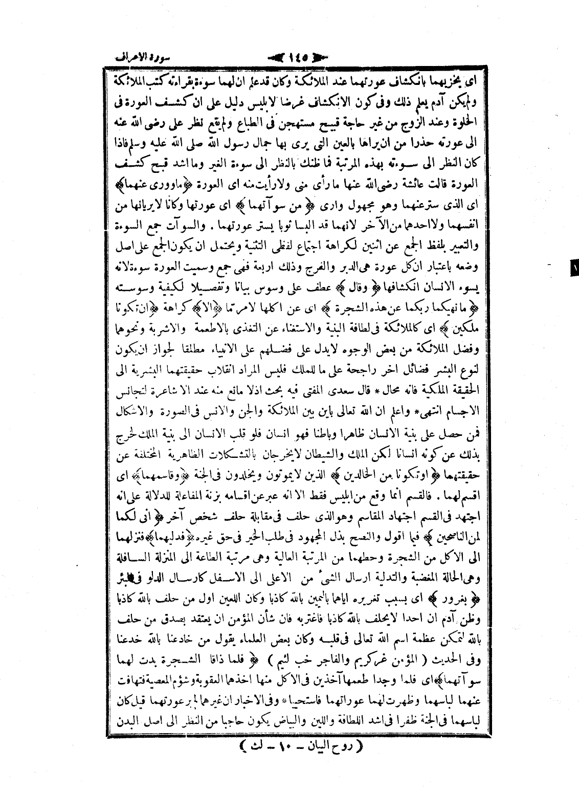 اى يخزيهما بانكشاف عورتهما عند الملائكة وكان قد علم ان لهما سوءة بقراءته كتب الملائكة ولم يكن آدم يعلم ذلك وفى كون الانكشاف غرضا لابليس دليل على ان كشف العورة فى الخلوة وعند الزوج من غير حاجة قبيح مستهجن فى الطباع ولم يقع نظر على رضى الله عنه الى عورته حذرا من ان يراها بالعين التي يرى بها جمال رسول الله صلى الله عليه وسلم فاذا كان النظر الى سوءته بهذه المرتبة فما ظنك بالنظر الى سوءة الغير وما أشد قبح كشف العورة قالت عائشة رضى الله عنها ما رأى منى ولا رأيت منه الى العورة ما وُورِيَ عَنْهُما اى الذي سترعنهما وهو مجهول وارى مِنْ سَوْآتِهِما اى عورتها وكانا لا يريانها من أنفسهما ولا أحدهما من الآخر لانهما قد البسا ثوبا يستر عورتهما. والسوآت جمع السوءة والتعبير بلفظ الجمع عن اثنين لكراهة اجتماع لفظى التثنية ويحتمل ان يكون الجمع على اصل وضعه باعتبار ان كل عورة هى الدبر والفرج وذلك اربعة فهى جمع وسميت العورة سوءة لانه يسوء الإنسان انكشافها وَقالَ عطف على وسوس بيانا وتفصيلا لكيفية وسوسته ما نَهاكُما رَبُّكُما عَنْ هذِهِ الشَّجَرَةِ اى عن أكلها لامر ما إِلَّا كراهة أَنْ تَكُونا مَلَكَيْنِ اى كالملائكة فى لطافة البنية والاستغناء عن التغذي بالاطعمة والاشربة ونحوهما وفضل الملائكة من بعض الوجوه لا يدل على فضلهم على الأنبياء مطلقا لجواز ان يكون لنوع البشر فضائل اخر راجحة على ما للملك فليس المراد انقلاب حقيقتهما البشرية الى الحقيقة الملكية فانه محال قال سعدى المفتى فيه بحث إذ لا مانع منه عند الاشاعرة لتجانس الأجسام انتهى واعلم ان الله تعالى باين بين الملائكة والجن والانس فى الصورة والاشكال فمن حصل على بنية الإنسان ظاهرا وباطنا فهو انسان فلو قلب الإنسان الى بنية الملك لخرج بذلك عن كونه إنسانا لكن الملك والشيطان لا يخرجان بالتشكلات الظاهرية المختلفة عن حقيقتهما أَوْ تَكُونا مِنَ الْخالِدِينَ الذين لا يموتون ويخلدون فى الجنة وَقاسَمَهُما اى اقسم لهما. فالقسم انما وقع من إبليس فقط الا انه عبر عن اقسامه بزنة المفاعلة للدلالة على انه اجتهد فى القسم اجتهاد المقاسم وهو الذي حلف فى مقابله حلف شخص آخر إِنِّي لَكُما لَمِنَ النَّاصِحِينَ فيما أقول والنصح بذل المجهود فى طلب الخير فى حق غيره فَدَلَّاهُما فنزلهما الى الاكل من الشجرة وحطهما من المرتبة العالية وهى مرتبة الطاعة الى المنزلة السافلة وهى الحالة المغضبة والتدلية إرسال الشيء من الأعلى الى الأسفل كارسال الدلو فى البئر بِغُرُورٍ اى بسبب تغريره إياهما باليمين بالله كاذبا وكان اللعين أول من حلف بالله كاذبا وظن آدم ان أحدا لا يحلف بالله كاذبا فاغتربه فان شأن المؤمن ان يعتقد بصدق من حلف بالله لتمكن عظمة اسم الله تعالى فى قلبه وكان بعض العلماء يقول من خادعنا بالله خدعنا وفى الحديث (المؤمن غر كريم والفاجر خب لئيم) فَلَمَّا ذاقَا الشَّجَرَةَ بَدَتْ لَهُما سَوْآتُهُما اى فلما وجدا طعمها آخذين فى الاكل منها أخذهما العقوبة وشؤم المعصية فتهافت عنهما لباسهما وظهرت لهما عوراتهما فاستحييا وفى الاخبار ان غيرهما لم ير عورتهما قيل كان لباسهما فى الجنة ظفرا فى أشد اللطافة واللين والبياض يكون حاجبا من النظر الى اصل البدن