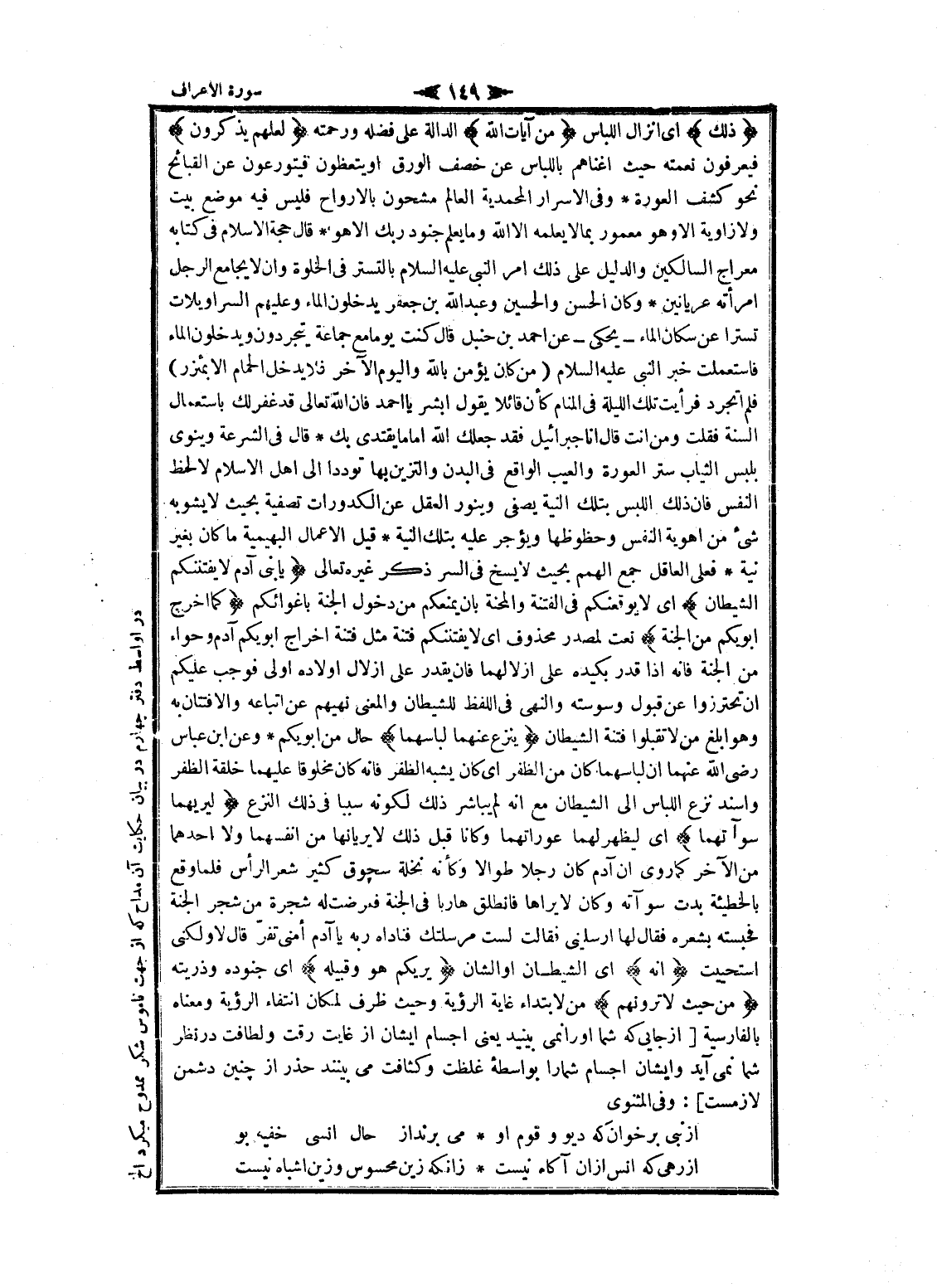 ذلِكَ اى إنزال اللباس مِنْ آياتِ اللَّهِ الدالة على فضله ورحمته لَعَلَّهُمْ يَذَّكَّرُونَ فيعرفون نعمته حيث أغناهم باللباس عن خصف الورق او يتعظون فيتورعون عن القبائح نحو كشف العورة وفى الاسرار المحمدية العالم مشحون بالأرواح فليس فيه موضع بيت ولا زاوية الا وهو معمور بما لا يعلمه الا الله وما يعلم جنود ربك الا هو قال حجة الإسلام فى كتابه معراج السالكين والدليل على ذلك امر النبي عليه السلام بالتستر فى الخلوة وان لا يجامع الرجل امرأته عريانين وكان الحسن والحسين وعبد الله بن جعفر يدخلون الماء وعليهم السراويلات تسترا عن سكان الماء- يحكى- عن احمد بن حنبل قال كنت يوما مع جماعة يتجردون ويدخلون الماء فاستعملت خبر النبي عليه السلام (من كان يؤمن بالله واليوم الآخر فلا يدخل الحمام الا بمئزر) فلم اتجرد فرأيت تلك الليلة فى المنام كأن قائلا يقول ابشر يا احمد فان الله تعالى قد غفر لك باستعمال السنة فقلت ومن أنت قال انا جبرائيل فقد جعلك الله اماما يقتدى بك قال فى الشرعة وينوى بلبس الثياب ستر العورة والعيب الواقع فى البدن والتزين بها توددا الى اهل الإسلام لاحظ النفس فان ذلك اللبس بتلك النية يصفى وينور العقل عن الكدورات تصفية بحيث لا يشوبه شىء من اهوية النفس وحظوظها ويؤجر عليه بتلك النية قيل الأعمال البهيمية ما كان بغير نية فعلى العاقل جمع الهمم بحيث لا يسخ فى السر ذكر غيره تعالى يا بَنِي آدَمَ لا يَفْتِنَنَّكُمُ الشَّيْطانُ اى لا يوقعنكم فى الفتنة والمحنة بان يمنعكم من دخول الجنة باغوائكم كَما أَخْرَجَ أَبَوَيْكُمْ مِنَ الْجَنَّةِ نعت لمصدر محذوف اى لا يفتننكم فتنة مثل فتنة إخراج أبويكم آدم وحواء من الجنة فانه إذا قدر بكيده على ازلالهما فان يقدر على ازلال أولاده اولى فوجب عليكم ان تحترزوا عن قبول وسوسته والنهى فى اللفظ للشيطان والمعنى نهيهم عن اتباعه والافتتان به وهو ابلغ من لا تقبلوا فتنة الشيطان يَنْزِعُ عَنْهُما لِباسَهُما حال من أبويكم وعن ابن عباس رضى الله عنهما ان لباسهما كان من الظفر اى كان يشبه الظفر فانه كان مخلوقا عليهما خلقة الظفر وأسند نزع اللباس الى الشيطان مع انه لم يباشر ذلك لكونه سببا فى ذلك النزع لِيُرِيَهُما سَوْآتِهِما اى ليظهر لهما عوراتهما وكانا قبل ذلك لا يريانها من أنفسهما ولا أحدهما من الآخر كما روى ان آدم كان رجلا طوالا وكأنه نخلة سحوق كثير شعر الرأس فلما وقع بالخطيئة بدت سوآته وكان لا يراها فانطلق هاربا فى الجنة فعرضت له شجرة من شجر الجنة فحبسته بشعره فقال لها ارسلينى فقالت لست مرسلتك فناداه ربه يا آدم أمنى تفرّ قال لا ولكنى استحييت إِنَّهُ اى الشيطان او الشان يَراكُمْ هُوَ وَقَبِيلُهُ اى جنوده وذريته مِنْ حَيْثُ لا تَرَوْنَهُمْ من لابتداء غاية الرؤية وحيث ظرف لمكان انتفاء الرؤية ومعناه بالفارسية [از جايى كه شما او را نمى بينيد يعنى أجسام ايشان از غايت رقت ولطافت در نظر شما نمى آيد وايشان أجسام شما را بواسطه غلظت وكثافت مى بينند حذر از چنين دشمن لازمست] : وفى المثنوى