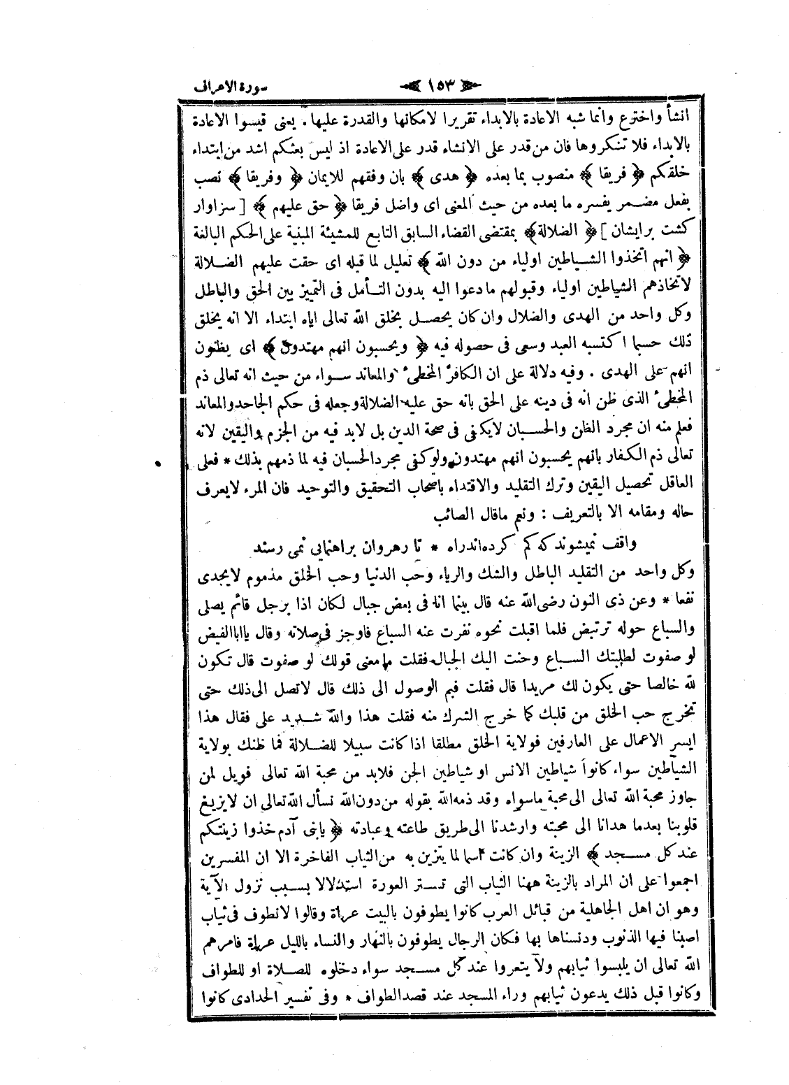 انشأ واخترع وانما شبه الاعادة بالابداء تقريرا لامكانها والقدرة عليها. يعنى قيسوا الاعادة بالابداء فلا تنكروها فان من قدر على الإنشاء قدر على الاعادة إذ ليس بعثكم أشد من ابتداء خلقكم فَرِيقاً منصوب بما بعده هَدى بان وفقهم للايمان وَفَرِيقاً نصب بفعل مضمر يفسره ما بعده من حيث المعنى اى وأضل فريقا حَقَّ عَلَيْهِمُ [سزاوار كشت بر ايشان] الضَّلالَةُ بمقتضى القضاء السابق التابع للمشيئة المبنية على الحكم البالغة إِنَّهُمُ اتَّخَذُوا الشَّياطِينَ أَوْلِياءَ مِنْ دُونِ اللَّهِ تعليل لما قبله اى حقت عليهم الضلالة لاتخاذهم الشياطين اولياء وقبولهم ما دعوا اليه بدون التأمل فى التمييز بين الحق والباطل وكل واحد من الهدى والضلال وان كان يحصل بخلق الله تعالى إياه ابتداء الا انه يخلق ذلك حسبما اكتسبه العبد وسعى فى حصوله فيه وَيَحْسَبُونَ أَنَّهُمْ مُهْتَدُونَ اى يظنون انهم على الهدى. وفيه دلالة على ان الكافر المخطئ والمعاند سواء من حيث انه تعالى ذم المخطئ الذي ظن انه فى دينه على الحق بانه حق عليه الضلالة وجعله فى حكم الجاحد والمعاند فعلم منه ان مجرد الظن والحسبان لا يكفى فى صحة الدين بل لا بد فيه من الجزم واليقين لانه تعالى ذم الكفار بانهم يحسبون انهم مهتدون ولو كفى مجرد الحسبان فيه لما ذمهم بذلك فعلى العاقل تحصيل اليقين وترك التقليد والاقتداء باصحاب التحقيق والتوحيد فان المرء لا يعرف حاله ومقامه الا بالتعريف: ونعم ما قال الصائب