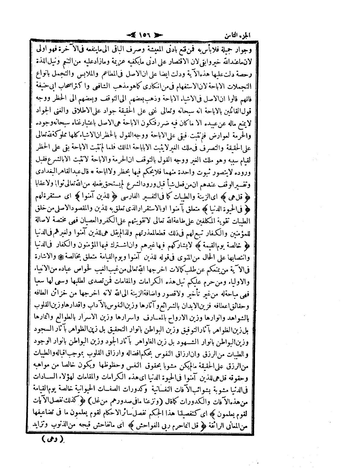 وجوار جميلة فلا بأس به فمن قنع بأدنى المعيشة وصرف الباقي الى ما ينفعه فى الآخرة فهو اولى لان ما عند الله خير وأبقى لان الاقتصار على ادنى ما يكفيه عزيمة وما زاد عليه من التنعم ونيل اللذة رخصة دلت عليها هذه الآية ودلت ايضا على ان الأصل فى المطاعم والملابس والتجمل بانواع التجملات الإباحة لان الاستفهام فى من إنكاري كما هو مذهب الشافعي واكثر اصحاب ابى حنيفة فانهم قالوا ان الأصل فى الأشياء الإباحة وذهب بعضهم الى التوقف وبعضهم الى الحظر ووجه قول القائلين بالاباحة انه سبحانه وتعالى غنى على الحقيقة جواد على الإطلاق والغنى الجواد لا يمنع مله عن عبيده الا ما كان فيه ضرر فتكون الإباحة هى الأصل باعتبار غناه سبحانه وجوده والحرمة لعوارض فلم تثبت فبقى على الإباحة ووجه القول بالحظر أن الأشياء كلها مملوكة لله تعالى على الحقيقة والتصرف فى ملك الغير لا يثبت الا بإباحة المالك فلما لم تثبت الإباحة بقي على الحظر لقيام سببه وهو ملك الغير ووجه القول بالتوقف ان الحرمة والإباحة لا تثبت الا بالشرع فقبل وروده لا يتصور ثبوت واحدة منهما فلا يحكم فيها بحظر ولا اباحة قال عبد القاهر البغدادي وتفسير الوقف عندهم ان من فعل شيأ قبل ورود الشرع لم يستحق بفعله من الله تعالى ثوابا ولا عقابا قُلْ هِيَ اى الزينة والطيبات كما فى التفسير الفارسي لِلَّذِينَ آمَنُوا اى مستقرة لهم فِي الْحَياةِ الدُّنْيا متعلق بآمنوا او بالاستقرار الذي تعلق به للذين والمقصود الأصلي من خلق الطيبات تقوية المكلفين على طاعة الله تعالى لا تقويتهم على الكفر والعصيان فهى مختصة لاصالة للمؤمنين والكفار تبع لهم فى ذلك قطعا لمعذرتهم ولذا لم يقل هى للذين آمنوا ولغيرهم فى الدنيا خالِصَةً يَوْمَ الْقِيامَةِ لا يشاركهم فيها غيرهم وان اشترك فيها المؤمنون والكفار فى الدنيا وانتصابها على الحال من المنوي فى قوله للذين آمنوا ويوم القيامة متعلق بخالصة والاشارة فى الآية من يمنعكم عن طلب كمالات أخرجها الله تعالى من غيب الغيب لخواص عباده من الأنبياء والأولياء ومن حرم عليكم نيل هذه الكرامات والمقامات فمن تصدى لطلبها وسعى لها سعيا فهى مباحة له من غير تأخير ولا قصور واضافة الزينة الى الله لانه أخرجها من خزائن الطافه وحقائق أعطافه فزين الأبدان بالشرائع وآثارها وزين النفوس بالآداب وأقدارها وزين القلوب بالشواهد وأنوارها وزين الأرواح بالمعارف واسرارها وزين الاسرار بالطوالع وأثمارها بل زين الظواهر بآثار التوفيق وزين البواطن بانوار التحقيق بل زين الظواهر بآثار السجود وزين البواطن بانوار الشهود بل زين الظواهر بآثار الجود وزين البواطن بانوار الوجود والطيبات من الرزق وان أرزاق النفوس بحكم افضاله وأرزاق القلوب بموجب إقباله والطيبات من الرزق على الحقيقة ما لم يكن مشوبا بحقوق النفس وحظوظها ويكون خالصا من مواهبه وحقوقه قل هى للذين آمنوا فى الحيوة الدنيا اى هذه الكرامات والمقامات لهؤلاء السادات فى الدنيا مشوبة بشوائب الآفات النفسانية وكدورات الصفات الحيوانية خالصة يوم القيامة من هذه الآفات والكدورات كما قال وَنَزَعْنا ما فِي صُدُورِهِمْ مِنْ غِلٍّ كَذلِكَ نُفَصِّلُ الْآياتِ لِقَوْمٍ يَعْلَمُونَ اى كتفصيلنا هذا الحكم نفصل سائر الاحكام لقوم يعلمون ما فى تضاعيفها من المعاني الرائقة قُلْ إِنَّما حَرَّمَ رَبِّيَ الْفَواحِشَ اى ما تفاحش قبحه من الذنوب وتزايد