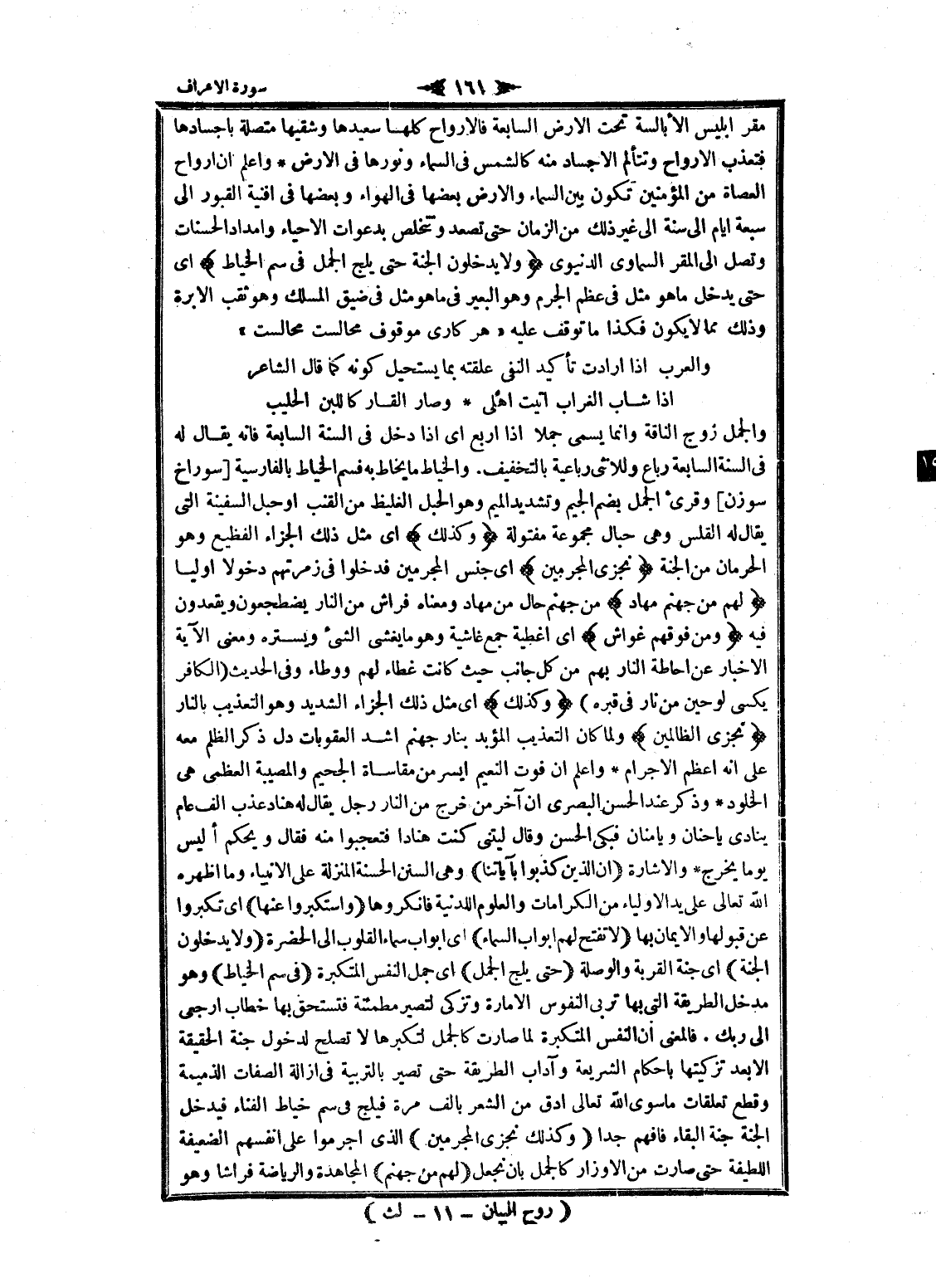 مقر إبليس الأبالسة تحت الأرض السابعة فالارواح كلها سعيدها وشقيها متصلة بأجسادها فتعذب الأرواح وتتألم الأجساد منه كالشمس فى السماء ونورها فى الأرض واعلم ان أرواح العصاة من المؤمنين تكون بين السماء والأرض بعضها فى الهواء وبعضها فى أفنية القبور الى سبعة ايام الى سنة الى غير ذلك من الزمان حتى تصعد وتتخلص بدعوات الاحياء وامداد الحسنات وتصل الى المقر السماوي الدنيوي وَلا يَدْخُلُونَ الْجَنَّةَ حَتَّى يَلِجَ الْجَمَلُ فِي سَمِّ الْخِياطِ اى حتى يدخل ما هو مثل فى عظم الجرم وهو البعير فى ما هو مثل فى ضيق المسلك وهو ثقب الابرة وذلك مما لا يكون فكذا ما توقف عليه «هر كارى موقوف محالست محالست» والعرب إذا أرادت تأكيد النفي علقته بما يستحيل كونه كما قال الشاعر