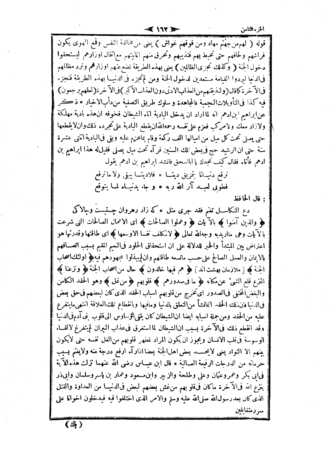 قوله لَهُمْ مِنْ جَهَنَّمَ مِهادٌ وَمِنْ فَوْقِهِمْ غَواشٍ يعنى من مخالفة النفس وقمع الهوى يكون فراشهم ولحافهم حتى تحيط بهم فتذيبهم وتحرق منهم انانيتهم مع أثقال أوزارهم ليستحقوا دخول الجنة وَكَذلِكَ نَجْزِي الظَّالِمِينَ يعنى بهذه الطريقة نضع عنهم أوزارهم ونرد مظالمهم فى الدنيا ليردوا القيامة مستعدين لدخول الجنة ومن لم نجزه فى الدنيا بهذه الطريقة فنجزه فى الآخرة كما قال وَلَنُذِيقَنَّهُمْ مِنَ الْعَذابِ الْأَدْنى دُونَ الْعَذابِ الْأَكْبَرِ فى الآخرة لَعَلَّهُمْ يَرْجِعُونَ فيه كذا فى التأويلات النجمية فالمجاهدة وسلوك طريق التصفية من دأب الأخيار ذكر عن ابراهيم ابن أدهم انه لما أراد ان يدخل البادية أتاه الشيطان فخوفه ان هذه بادية مهلكة ولا زاد معك ولا مركب فعزم على نفسه رحمه الله ان يقطع البادية على تجرده ذلك وان لا يقطعها حتى يصلى تحت كل ميل من اميالها الف ركعة وقام بما عزم عليه وبقي فى البادية اثنتي عشرة سنة حتى ان الرشيد حج فى بعض تلك السنين فرآه تحت ميل يصلى فقيل له هذا ابراهيم بن أدهم فأتاه فقال كيف نجدك يا أبا اسحق فانشد ابراهيم بن أدهم يقول نرقع دنيانا بتمزيق ديننا فلا ديننا يبقى ولا ما نرقع فطوبى لعبد آثر الله ربه وجاء بدنياه لما يتوقع: قال الحافظ