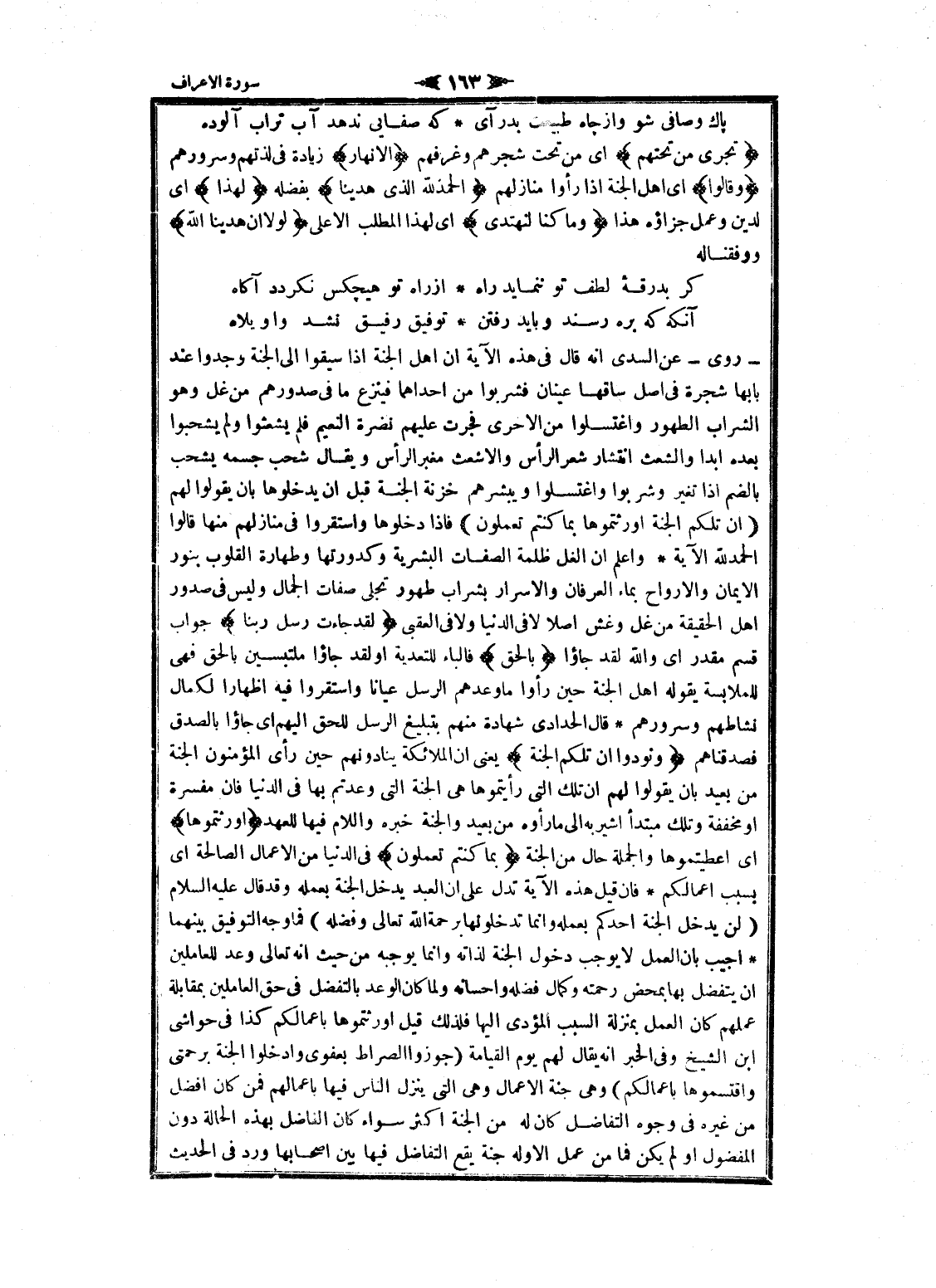 - روى- عن السدى انه قال فى هذه الآية ان اهل الجنة إذا سيقوا الى الجنة وجدوا عند بابها شجرة فى اصل ساقها عينان فشربوا من إحداهما فينزع ما فى صدورهم من غل وهو الشراب الطهور واغتسلوا من الاخرى فجرت عليهم نضرة النعيم فلم يشعثوا ولم يشحبوا بعده ابدا والشعث انتشار شعر الرأس والأشعث مغبر الرأس ويقال شحب جسمه يشحب بالضم إذا تغير وشربوا واغتسلوا ويبشرهم خزنة الجنة قبل ان يدخلوها بان يقولوا لهم أَنْ تِلْكُمُ الْجَنَّةُ أُورِثْتُمُوها بِما كُنْتُمْ تَعْمَلُونَ فاذا دخلوها واستقروا فى منازلهم منها قالوا الحمد لله الآية واعلم ان الغل ظلمة الصفات البشرية وكدورتها وطهارة القلوب بنور الايمان والأرواح بماء العرفان والاسرار بشراب طهور تجلى صفات الجمال وليس فى صدور اهل الحقيقة من غل وغش أصلا لا فى الدنيا ولا فى العقبى لَقَدْ جاءَتْ رُسُلُ رَبِّنا جواب قسم مقدر اى والله لقد جاؤا بِالْحَقِّ فالباء للتعدية او لقد جاؤا ملتبسين بالحق فهى للملابسة يقوله اهل الجنة حين رأوا ما وعدهم الرسل عيانا واستقروا فيه إظهارا لكمال نشاطهم وسرورهم قال الحدادي شهادة منهم بتبليغ الرسل للحق إليهم اى جاؤا بالصدق فصدقناهم وَنُودُوا أَنْ تِلْكُمُ الْجَنَّةُ يعنى ان الملائكة ينادونهم حين رأى المؤمنون الجنة من بعيد بان يقولوا لهم ان تلك التي رأيتموها هى الجنة التي وعدتم بها فى الدنيا فان مفسرة او مخففة وتلك مبتدأ أشير به الى ما رأوه من بعيد والجنة خبره واللام فيها للعهد أُورِثْتُمُوها اى أعطيتموها والجملة حال من الجنة بِما كُنْتُمْ تَعْمَلُونَ فى الدنيا من الأعمال الصالحة اى بسبب أعمالكم فان قيل هذه الآية تدل على ان العبد يدخل الجنة بعمله وقد قال عليه السلام (لن يدخل الجنة أحدكم بعمله وانما تدخلونها برحمة الله تعالى وفضله) فما وجه التوفيق بينهما أجيب بان العمل لا يوجب دخول الجنة لذاته وانما يوجبه من حيث انه تعالى وعد للعاملين ان يتفضل بها بمحض رحمته وكمال فضله وإحسانه ولما كان الوعد بالتفضل فى حق العاملين بمقابلة عملهم كان العمل بمنزلة السبب المؤدى إليها فلذلك قيل أورثتموها بأعمالكم كذا فى حواشى ابن الشيخ وفى الخبر انه يقال لهم يوم القيامة (جوزوا الصراط بعفوي وادخلوا الجنة برحمتي واقتسموها بأعمالكم) وهى جنة الأعمال وهى التي ينزل الناس فيها بأعمالهم فمن كان أفضل من غيره فى وجوه التفاضل كان له من الجنة اكثر سواء كان الفاضل بهذه الحالة دون المفضول او لم يكن فما من عمل إلا وله جنة يقع التفاضل فيها بين أصحابها ورد فى الحديث