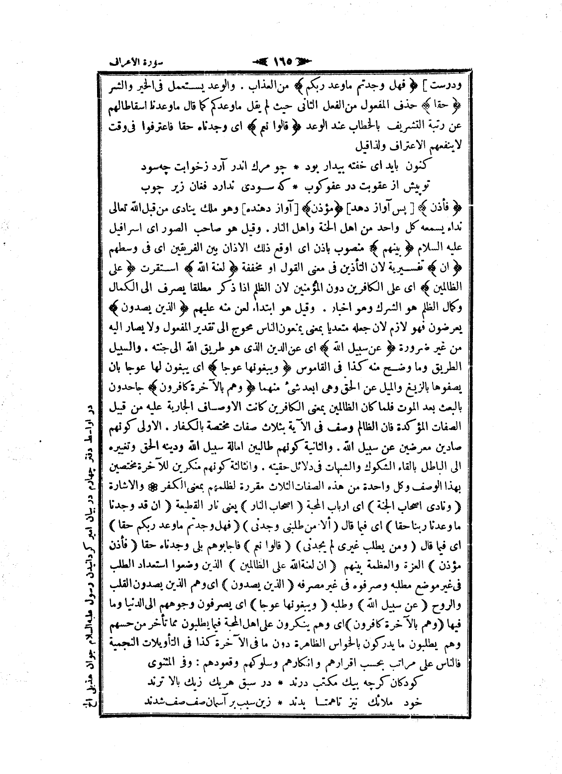 فَأَذَّنَ [پس آواز دهد] مُؤَذِّنٌ [آواز دهنده] وهو ملك ينادى من قبل الله تعالى نداء يسمعه كل واحد من اهل الحنة واهل النار. وقيل هو صاحب الصور اى اسرافيل عليه السلام بَيْنَهُمْ منصوب بإذن اى أوقع ذلك الاذان بين الفريقين اى فى وسطهم أَنْ تفسيرية لان التأذين فى معنى القول او مخففة لَعْنَةُ اللَّهِ استقرت عَلَى الظَّالِمِينَ اى على الكافرين دون المؤمنين لان الظلم إذا ذكر مطلقا يصرف الى الكمال وكمال الظلم هو الشرك وهو اخبار. وقيل هو ابتداء لعن منه عليهم الَّذِينَ يَصُدُّونَ يعرضون فهو لازم لان جعله متعديا بمعنى يمنعون الناس محوج الى تقدير المفعول ولا يصار اليه من غير ضرورة عَنْ سَبِيلِ اللَّهِ اى عن الدين الذي هو طريق الله الى جنته. والسبيل الطريق وما وضح منه كذا فى القاموس وَيَبْغُونَها عِوَجاً اى يبغون لها عوجا بان يصفوها بالزيغ والميل عن الحق وهى ابعد شىء منهما وَهُمْ بِالْآخِرَةِ كافِرُونَ جاحدون بالبعث بعد الموت فلما كان الظالمين بمعنى الكافرين كانت الأوصاف الجارية عليه من قبيل الصفات المؤكدة فان الظالم وصف فى الآية بثلاث صفات مختصة بالكفار. الاولى كونهم صادين معرضين عن سبيل الله. والثانية كونهم طالبين امالة سبيل الله ودينه الحق وتغييره الى الباطل بإلقاء الشكوك والشبهات فى دلائل حقيته. والثالثة كونهم منكرين للآخرة مختصين بهذا الوصف وكل واحدة من هذه الصفات الثلاث مقررة لظلمهم بمعنى الكفر والاشارة وَنادى أَصْحابُ الْجَنَّةِ اى ارباب المحبة أَصْحابَ النَّارِ يعنى نار القطيعة أَنْ قَدْ وَجَدْنا ما وَعَدَنا رَبُّنا حَقًّا اى فيما قال (ألا من طلبنى وجدنى) فَهَلْ وَجَدْتُمْ ما وَعَدَ رَبُّكُمْ حَقًّا اى فيما قال (ومن يطلب غيرى لم يجدنى) قالُوا نَعَمْ فاجابوهم بلى وجدناه حقا فَأَذَّنَ مُؤَذِّنٌ العزة والعظمة بينهم أَنْ لَعْنَةُ اللَّهِ عَلَى الظَّالِمِينَ الذين وضعوا استعداد الطلب فى غير موضع مطلبه وصرفوه فى غير مصرفه الَّذِينَ يَصُدُّونَ اى وهم الذين يصدون القلب والروح عَنْ سَبِيلِ اللَّهِ وطلبه وَيَبْغُونَها عِوَجاً اى يصرفون وجوههم الى الدنيا وما فيها وَهُمْ بِالْآخِرَةِ كافِرُونَ اى وهم ينكرون على اهل المحبة فيما يطلبون مما تأخر من حسهم وهم يطلبون ما يدركون بالحواس الظاهرة دون ما فى الآخرة كذا فى التأويلات النجمية فالناس على مراتب بحسب إقرارهم وانكارهم وسلوكهم وقعودهم: وفى المثنوى