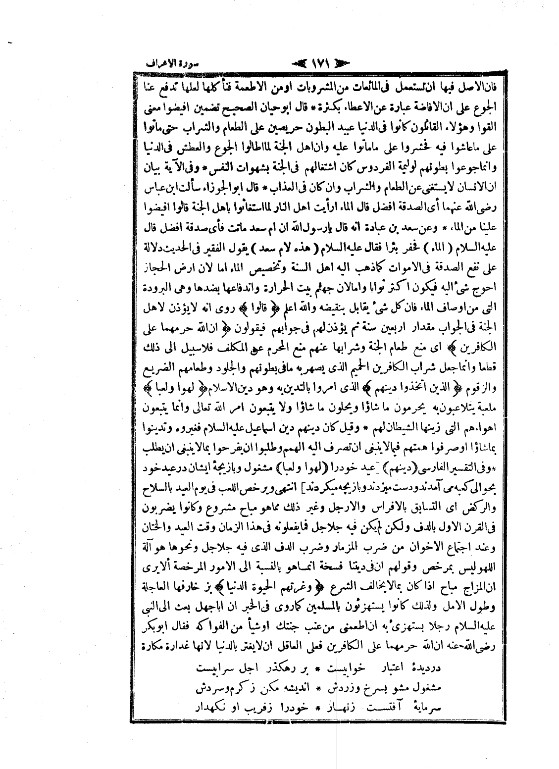 فان الأصل فيها ان تستعمل فى المائعات من المشروبات او من الاطعمة فنأكلها لعلها تدفع عنا الجوع على ان الافاضة عبارة عن الإعطاء بكثرة قال ابو حيان الصحيح تضمين أفيضوا معنى القوا وهؤلاء القائلون كانوا فى الدنيا عبيد البطون حريصين على الطعام والشراب حتى ماتوا على ما عاشوا فيه فحشروا على ما ماتوا عليه وان اهل الجنة لما أطالوا الجوع والعطش فى الدنيا وانما جوعوا بطونهم لوليمة الفردوس كان اشتغالهم فى الجنة بشهوات النفس وفى الآية بيان ان الإنسان لا يستغنى عن الطعام والشراب وان كان فى العذاب قال ابو الجوزاء سألت ابن عباس رضى الله عنهما أي الصدقة أفضل قال الماء أرأيت اهل النار لما استغاثوا باهل الجنة قالوا أفيضوا علينا من الماء وعن سعد بن عبادة انه قال يا رسول الله ان أم سعد ماتت فأى صدقة أفضل قال عليه السلام (الماء) فحفر بئرا فقال عليه السلام (هذه لام سعد) يقول الفقير فى الحديث دلالة على نفع الصدقة فى الأموات كما ذهب اليه اهل السنة وتخصيص الماء اما لان ارض الحجاز أحوج شىء اليه فيكون اكثر ثوابا وإما لأن جهنم بيت الحرارة واندفاعها بضدها وهى البرودة التي من أوصاف الماء فان كل شىء يقابل بنقيضه والله اعلم قالُوا روى انه لا يؤذن لاهل الجنة فى الجواب مقدار أربعين سنة ثم يؤذن لهم فى جوابهم فيقولون إِنَّ اللَّهَ حَرَّمَهُما عَلَى الْكافِرِينَ اى منع طعام الجنة وشرابها عنهم منع المحرم عن المكلف فلا سبيل الى ذلك قطعا وانما جعل شراب الكافرين الحميم الذي يصهر به ما فى بطونهم والجلود وطعامهم الضريع والزقوم الَّذِينَ اتَّخَذُوا دِينَهُمْ الذي أمروا بالتدين به وهو دين الإسلام لَهْواً وَلَعِباً ملعبة يتلاعبون به يحرمون ما شاؤا ويحلون ما شاؤا ولا يتبعون امر الله تعالى وانما يتبعون أهواءهم التي زينها الشيطان لهم وقيل كان دينهم دين إسماعيل عليه السلام فغيروه وتدينوا بما شاؤا او صرفوا همتهم فيما لا ينبغى ان تصرف اليه الهمم وطلبوا ان يفرحوا بما لا ينبغى ان يطلب وفى التفسير الفارسي دِينَهُمْ [عيد خود را لَهْواً وَلَعِباً مشغول وبازيچهـ ايشان در عيد خود بحوالى كعبه مى آمدند ودست ميزدند وبازيچهـ ميكردند] انتهى ويرخص اللعب فى يوم العيد بالسلاح والركض اى التسابق بالافراس والأرجل وغير ذلك مما هو مباح مشروع وكانوا يضربون فى القرن الاول بالدف ولكن لم يكن فيه جلاجل فما يفعلونه فى هذا الزمان وقت العيد والختان وعند اجتماع الاخوان من ضرب المزمار وضرب الدف الذي فيه جلاجل ونحوها هو آلة اللهو ليس بمرخص وقولهم ان فى ديننا فسخة انما هو بالنسبة الى الأمور المرخصة ألا يرى ان المزاج مباح إذا كان بما لا يخالف الشرع وَغَرَّتْهُمُ الْحَياةُ الدُّنْيا بزخارفها العاجلة وطول الأمل ولذلك كانوا يستهزئون بالمسلمين كما روى فى الخبر ان أبا جهل بعث الى النبي عليه السلام رجلا يستهزئ به ان أطعمني من عنب جنتك او شيأ من الفواكه فقال أبو بكر رضى الله عنه ان الله حرمهما على الكافرين فعلى العاقل ان لا يغتر بالدنيا لانها غدارة مكارة