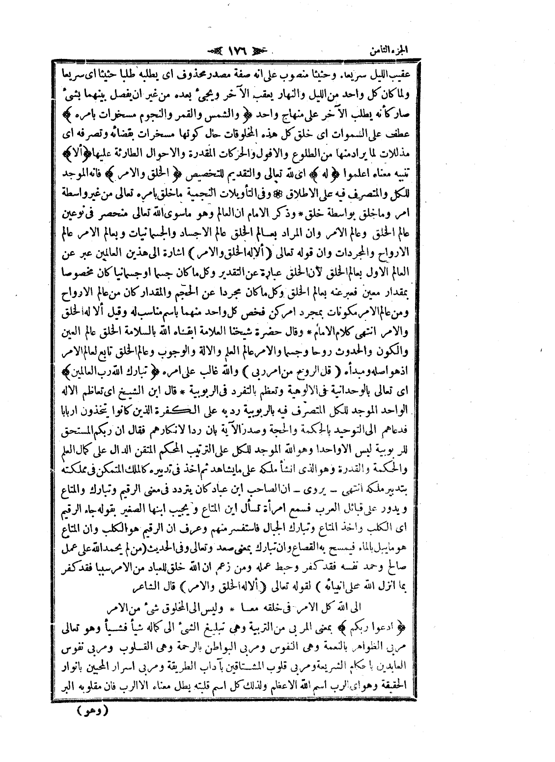 عقيب الليل سريعا وحثيثا منصوب على انه صفة مصدر محذوف اى يطلبه طلبا حثيثا اى سريعا ولما كان كل واحد من الليل والنهار يعقب الآخر ويجىء بعده من غير ان يفصل بينهما بشىء صار كأنه يطلب الآخر على منهاج واحد وَالشَّمْسَ وَالْقَمَرَ وَالنُّجُومَ مُسَخَّراتٍ بِأَمْرِهِ عطف على السموات اى خلق كل هذه المخلوقات حال كونها مسخرات بقضائه وتصرفه اى مذللات لما يراد منها من الطلوع والأفول والحركات المقدرة والأحوال الطارئة عليها أَلا تنبيه معناه اعلموا لَهُ اى لله تعالى والتقديم للتخصيص الْخَلْقُ وَالْأَمْرُ فانه الموجد للكل والمتصرف فيه على الإطلاق وفى التأويلات النجمية ما خلق بامره تعالى من غير واسطة امر وما خلق بواسطة خلق وذكر الامام ان العالم وهو ما سوى الله تعالى منحصر فى نوعين عالم الخلق وعالم الأمر وان المراد بعالم الخلق عالم الأجساد والجسمانيات وبعالم الأمر عالم الأرواح والمجردات وان قوله تعالى أَلا لَهُ الْخَلْقُ وَالْأَمْرُ اشارة الى هذين العالمين عبر عن العالم الاول بعالم الخلق لان الخلق عبارة عن التقدير وكل ما كان جسما او جسمانيا كان مخصوصا بمقدار معين فعبر عنه بعالم الخلق وكل ما كان مجردا عن الحجم والمقدار كان من عالم الأرواح ومن عالم الأمر مكونات بمجرد امر كن فخص كل واحد منهما باسم مناسب له وقيل ألا له الخلق والأمر انتهى كلام الامام وقال حضرة شيخنا العلامة أبقاه الله بالسلامة الخلق عالم العين والكون والحدوث روحا وجسما والأمر عالم العلم والآلة والوجوب وعالم الخلق تابع لعالم الأمر إذ هو أصله ومبدأه قُلِ الرُّوحُ مِنْ أَمْرِ رَبِّي والله غالب على امره تَبارَكَ اللَّهُ رَبُّ الْعالَمِينَ اى تعالى بالوحدانية فى الالوهية وتعظم بالتفرد فى الربوبية قال ابن الشيخ اى تعاظم الا له الواحد الموجد للكل المتصرف فيه بالربوبية رد به على الكفرة الذين كانوا يتخذون أربابا فدعاهم الى التوحيد بالحكمة والحجة وصدر الآية بان ردا لانكارهم فقال ان ربكم المستحق للربوبية ليس الا واحدا وهو الله الموجد للكل على الترتيب المحكم المتقن الدال على كمال العلم والحكمة والقدرة وهو الذي انشأ ملكه على ما يشاهد ثم أخذ فى تدبيره كالملك المتمكن فى مملكته بتدبير ملكه انتهى- يروى- ان الصاحب ابن عباد كان يتردد فى معنى الرقيم وتبارك والمتاع ويدور على قبائل العرب فسمع امرأة تسأل اين المتاع ويجيب ابنها الصغير بقوله جاء الرقيم اى الكلب وأخذ المتاع وتبارك الجبال فاستفسر منهم وعرف ان الرقيم هو الكلب وان المتاع هو ما يبل بالماء فيمسح به القصاع وان تبارك بمعنى صعد وتعالى وفى الحديث (من لم يحمد الله على عمل صالح وحمد نفسه فقد كفر وحبط عمله ومن زعم ان الله خلق للعباد من الأمر سببا فقد كفر بما انزل الله على أنبيائه) لقوله تعالى أَلا لَهُ الْخَلْقُ وَالْأَمْرُ قال الشاعر