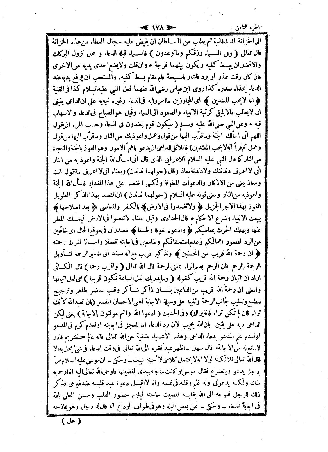 الى الخزانة السلطانية ثم يطلب من السلطان ان يفيض عليه سجال العطاء من هذه الخزانة قال تعالى وَفِي السَّماءِ رِزْقُكُمْ وَما تُوعَدُونَ فالسماء قبلة الدعاء ومحل نزول البركات والأفضل ان يبسط كفيه ويكون بينهما فرجة وان قلت ولا يضع احدى يديه على الاخرى فان كان وقت عذر او برد فاشار بالمسبحة قام مقام بسط كفيه. والمستحب ان يرفع يديه عند الدعاء بحذاء صدره كذا روى ابن عباس رضى الله عنهما فعل النبي عليه السلام كذا فى القنية إِنَّهُ لا يُحِبُّ الْمُعْتَدِينَ اى المجاوزين ما أمروا به فى الدعاء وغيره نبه به على ان الداعي ينبغى ان لا يطلب ما لا يليق كرتبة الأنبياء والصعود الى السماء وقيل هو الصياح فى الدعاء والإسهاب فيه وعن النبي صلى الله عليه وسلم (سيكون قوم يعتدون فى الدعاء وحب المرء ان يقول اللهم انى اسألك الجنة وما قرّب إليها من قول وعمل وأعوذ بك من النار وما قرّب إليها من قول وعمل ثم قرأ انه لا يحب المعتدين) فاللائق للداعى ان يدعو باهمّ الأمور وهو الفوز بالجنة والنجاة من النار كما قال النبي عليه السلام للاعرابى الذي قال انى اسأل الله الجنة وأعوذ به من النار انى لا اعرف دندنتك ولا دندنة معاذ وقال (حولهما ندندن) ومعناه انى لا اعرف ما تقول أنت ومعاذ يعنى من الاذكار والدعوات المطولة ولكنى اختصر على هذا المقدار فاسأل الله الجنة وأعوذ به من النار ومعنى قوله عليه السلام (حولهما ندندن) ان القصد بهذا الذكر الطويل الفوز بهذا الاجر الجزيل وَلا تُفْسِدُوا فِي الْأَرْضِ بالكفر والمعاصي بَعْدَ إِصْلاحِها ببعث الأنبياء وشرع الاحكام قال الحدادي وقيل معناه لا تعصوا فى الأرض فيمسك المطر عنها ويهلك الحرث بمعاصيكم وَادْعُوهُ خَوْفاً وَطَمَعاً مصدران فى موقع الحال اى خائفين من الرد لقصور أعمالكم وعدم استحقاقكم وطامعين فى اجابته تفضلا وإحسانا لفرط رحمته إِنَّ رَحْمَتَ اللَّهِ قَرِيبٌ مِنَ الْمُحْسِنِينَ