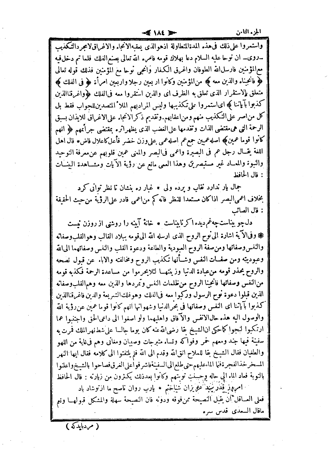 وفى الآية اشارة الى نوح الروح الذي أرسله الله الى قومه ببلاد القالب وهو القلب وصفاته والنفس وصفاتها ومن صفة الروح العبودية والطاعة ودعوة القلب والنفس وصفاتهما الى الله وعبوديته ومن صفات النفس وشأنها تكذيب الروح ومخالفته والإباء عن قبول نصحه والروح يحذر قومه من عبادة الدنيا وزينتها لئلا يحرموا من مساعدة الرحمة فكذبه قومه من النفس وصفاتها فانجينا الروح من ظلمات النفس وتمردها والذين معه وهم القلب وصفاته الذين قبلوا دعوة نوح الرسول وركبوا معه فى الفلك وهو فلك الشريعة والدين فاغرقنا الذين كذبوا بآياتنا اى النفس وصفاتها فى بحر الدنيا وشهواتها انهم كانوا قوما عمين عن رؤية الله والوصول اليه هذه حال الأنفس والآفاق وأهليهما ولو أصغوا الى داعى الحق واجتنبوا عما ارتكبوا لنجوا كما حكى ان الشيخ بقا رضى الله عنه كان يوما جالسا على شط نهر الملك فمرت به سفينة فيها جند ومعهم خمر وفواكه ونساء متبرجات وصبيان ومغانى وهم فى غاية من اللهو والطغيان فقال الشيخ بقا للملاح اتق الله وقدم الى الله فلم يلتفتوا الى كلامه فقال ايها النهر المسخر خذا الفجرة فنما الماء عليهم حتى طلع الى السفينة فاشرفوا على الغرق فصاحوا بالشيخ وأعلنوا بالتوبة فعاد الماء الى حاله وحسنت توبتهم وكانوا بعد ذلك يكثرون من زيارته: قال الحافظ
