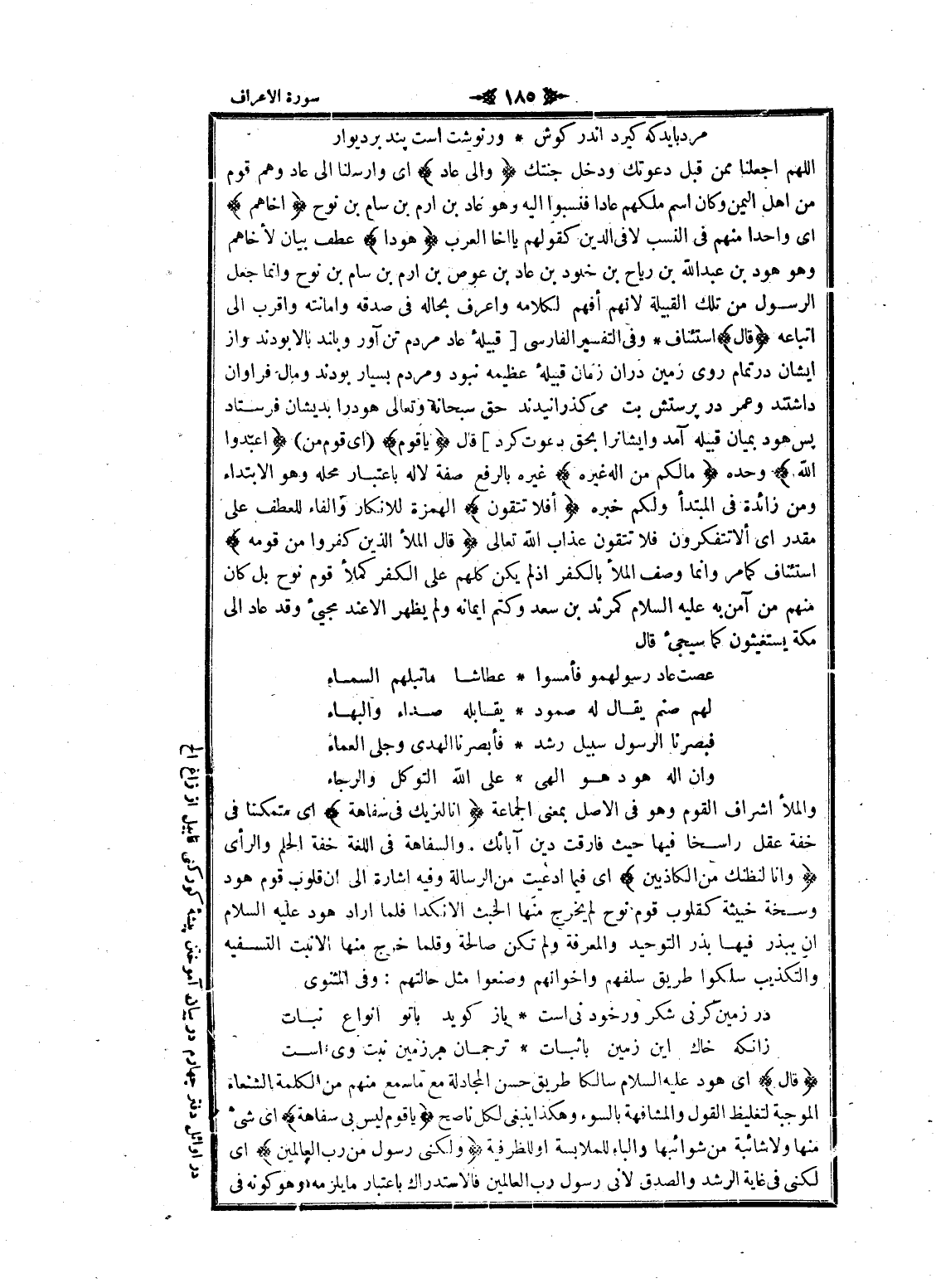 اللهم اجعلنا ممن قبل دعوتك ودخل جنتك وَإِلى عادٍ اى وأرسلنا الى عاد وهم قوم من اهل اليمن وكان اسم ملكهم عادا فنسبوا اليه وهو عاد بن ارم بن سام بن نوح أَخاهُمْ اى واحدا منهم فى النسب لا فى الدين كقولهم يا أخا العرب هُوداً عطف بيان لأخاهم وهو هود بن عبد الله بن رياح بن خلود بن عاد بن عوص بن ارم بن سام بن نوح وانما جعل الرسول من تلك القبيلة لانهم أفهم لكلامه واعرف بحاله فى صدقه وأمانته واقرب الى اتباعه قالَ استئناف وفى التفسير الفارسي [قبيله عاد مردم تن آور وبلند بالا بودند واز ايشان در تمام روى زمين در ان زمان قبيله عظيمه نبود ومردم بسيار بودند ومال فراوان داشتند وعمر در پرستش بت مى كذرانيدند حق سبحانه وتعالى هود را بديشان فرستاد پس هود بميان قبيله آمد وايشانرا بحق دعوت كرد] قال يا قَوْمِ (اى قوم من) اعْبُدُوا اللَّهَ وحده ما لَكُمْ مِنْ إِلهٍ غَيْرُهُ غيره بالرفع صفة لا له باعتبار محله وهو الابتداء ومن زائدة فى المبتدأ ولكم خبره أَفَلا تَتَّقُونَ الهمزة للانكار والفاء للعطف على مقدر اى ألا تتفكرون فلا تتقون عذاب الله تعالى قالَ الْمَلَأُ الَّذِينَ كَفَرُوا مِنْ قَوْمِهِ استئناف كما مر وانما وصف الملأ بالكفر إذ لم يكن كلهم على الكفر كملأ قوم نوح بل كان منهم من آمن به عليه السلام كمرثد بن سعد وكتم إيمانه ولم يظهر الا عند مجيىء وقد عاد الى مكة يستغيثون كما سيجيئ قال