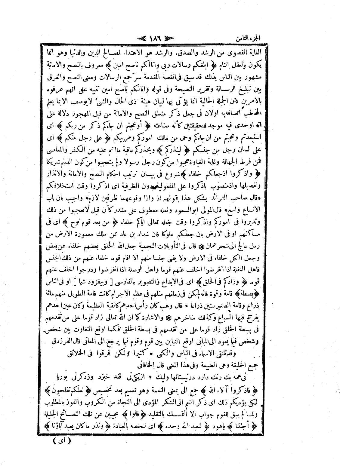 الغاية القصوى من الرشد والصدق. والرشد هو الاهتداء لمصالح الدين والدنيا وهو انما يكون بالعقل التام أُبَلِّغُكُمْ رِسالاتِ رَبِّي وَأَنَا لَكُمْ ناصِحٌ أَمِينٌ معروف بالنصح والامانة مشهور بين الناس بذلك قد سبق فى القصة المقدمة سرّ جمع الرسالات ومعنى النصح والفرق بين تبليغ الرسالة وتقرير النصيحة وفى قوله وانا لكم ناصح أمين تنبيه على انهم عرفوه بالأمرين لان الجملة الحالية انما يؤتى بها لبيان هيئة ذى الحال والشيء لا يوصف الا بما يعلم المخاطب اتصافه به أو لأن فى جعل ذكر متعلق النصح والامانة من قبل المهجور دلالة على انه أوحدي فيه موجد للحقيقتين كأنه صناعته أَوَعَجِبْتُمْ أَنْ جاءَكُمْ ذِكْرٌ مِنْ رَبِّكُمْ اى استبعدتم وعجبتم من ان جاءكم وحي من مالك أموركم ومربيكم عَلى رَجُلٍ مِنْكُمْ اى على لسان رجل من جنسكم لِيُنْذِرَكُمْ ويحذركم عاقبة ما أنتم عليه من الكفر والمعاصي فمن فرط الجهالة وغاية الغباوة عجبوا من كون رجل رسولا ولم يتعجبوا من كون الصنم شريكا وَاذْكُرُوا إِذْ جَعَلَكُمْ خُلَفاءَ شروع فى بيان ترتيب احكام النصح والامانة والانذار وتفصيلها وإذ منصوب باذكروا على المفعولية دون الظرفية اى اذكروا وقت استخلافكم قال صاحب الفرائد يشكل هذا بقولهم إذ وإذا وقوعهما ظرفين لازم وأجيب بان باب الاتساع واسع قال المولى ابو السعود ولعله معطوف على مقدر كأن قيل لا تعجبوا من ذلك وتدبروا فى أموركم واذكروا وقت جعله تعالى إياكم خلفاء مِنْ بَعْدِ قَوْمِ نُوحٍ اى فى مساكنهم او فى الأرض بان جعلكم ملوكا فان شداد بن عاد ممن ملك معمورة الأرض من رمل عالج الى شحر عمان قال فى التأويلات النجمية جعل الله الخلق بعضهم خلفاء عن بعض وجعل الكل خلفاء فى الأرض ولا يفنى جنسا منهم الا اقام قوما خلفاء عنهم من ذلك الجنس فاهل الغفلة إذا انقرضوا اخلف عنهم قوما واهل الوصلة إذا انقرضوا ودرجوا اخلف عنهم قوما وَزادَكُمْ فِي الْخَلْقِ اى فى الإبداع والتصوير بالفارسي [وبيفزود شما] او فى الناس بَصْطَةً قامة وقوة فانه لم يكن فى زمانهم مثلهم فى عظم الاجرام كانت قامة الطويل منهم مائة ذراع وقامة الصغير ستين ذراعا قال وهب كان رأس أحدهم كالقبة العظيمة وكان عين أحدهم يفرخ فيها السباع وكذلك مناخرهم والاشارة كما ان الله تعالى زاد قوما على من تقدمهم فى بسطة الخلق زاد قوما على من تقدمهم فى بسطة الخلق فكما أوقع التفاوت بين شخص وشخص فيما يعود الى المبانى أوقع التباين بين قوم وقوم فيما يرجع الى المعاني قال الفرزدق