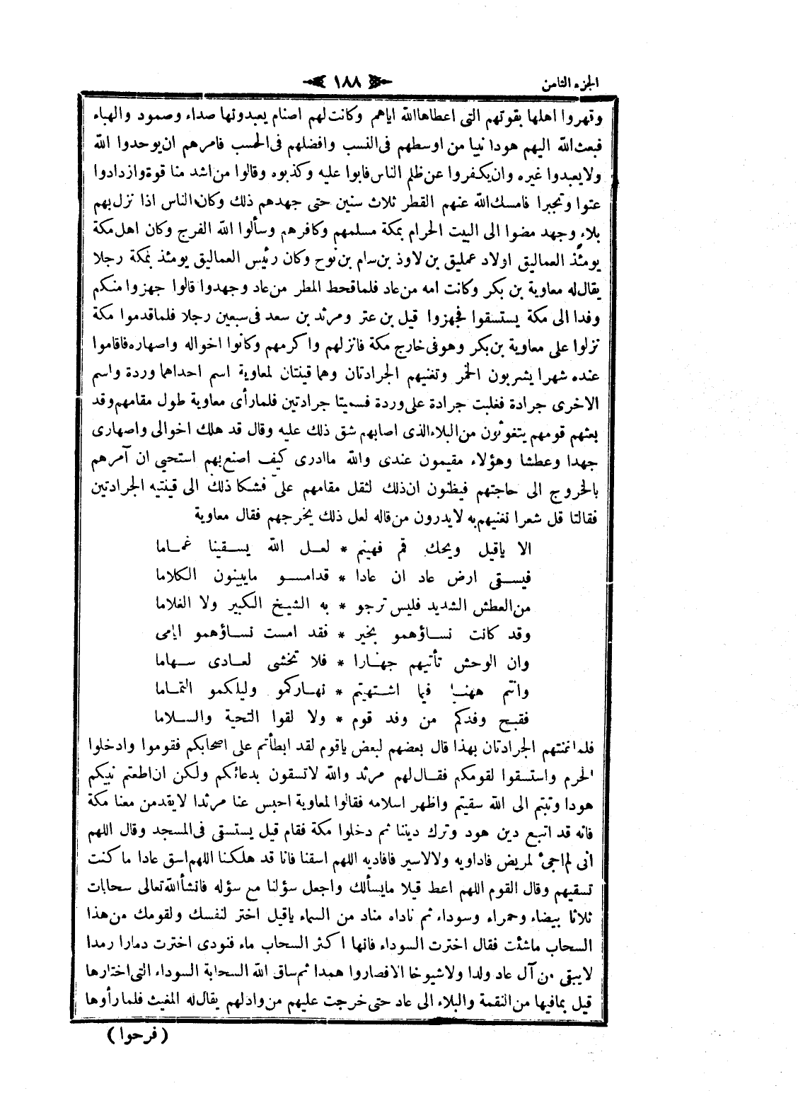 فلما غنتهم الجرادتان بهذا قال بعضهم لبعض يا قوم لقد أبطأتم على أصحابكم فقوموا وادخلوا الحرم واستسقوا لقومكم فقال لهم مرثد والله لا تسقون بدعائكم ولكن ان أطعتم نبيكم هودا وتبتم الى الله سقيتم واظهر إسلامه فقالوا لمعاوية احبس عنا مرثدا لا يقدمن معنا مكة فانه قد اتبع دين هود وترك ديننا ثم دخلوا مكة فقام قيل يستسقى فى المسجد وقال اللهم انى لم أجئ لمريض فاداويه ولا لاسير فافاديه اللهم اسقنا فانا قد هلكنا اللهم اسق عادا ما كنت تسقيهم وقال القوم اللهم أعط قيلا ما يسألك واجعل سؤلنا مع سؤله فانشأ الله تعالى سحابات ثلاثا بيضاء وحمراء وسوداء ثم ناداه مناد من السماء يا قيل اختر لنفسك ولقومك من هذا السحاب ما شئت فقال اخترت السوداء فانها اكثر السحاب ماء فنودى اخترت دمارا رمدا لا يبقى من آل عاد ولدا ولا شيوخا الا فصاروا همدا ثم ساق الله السحابة السوداء التي اختارها قيل بما فيها من النقمة والبلاء الى عاد حتى خرجت عليهم من واد لهم يقال له المغيث فلما رأوها