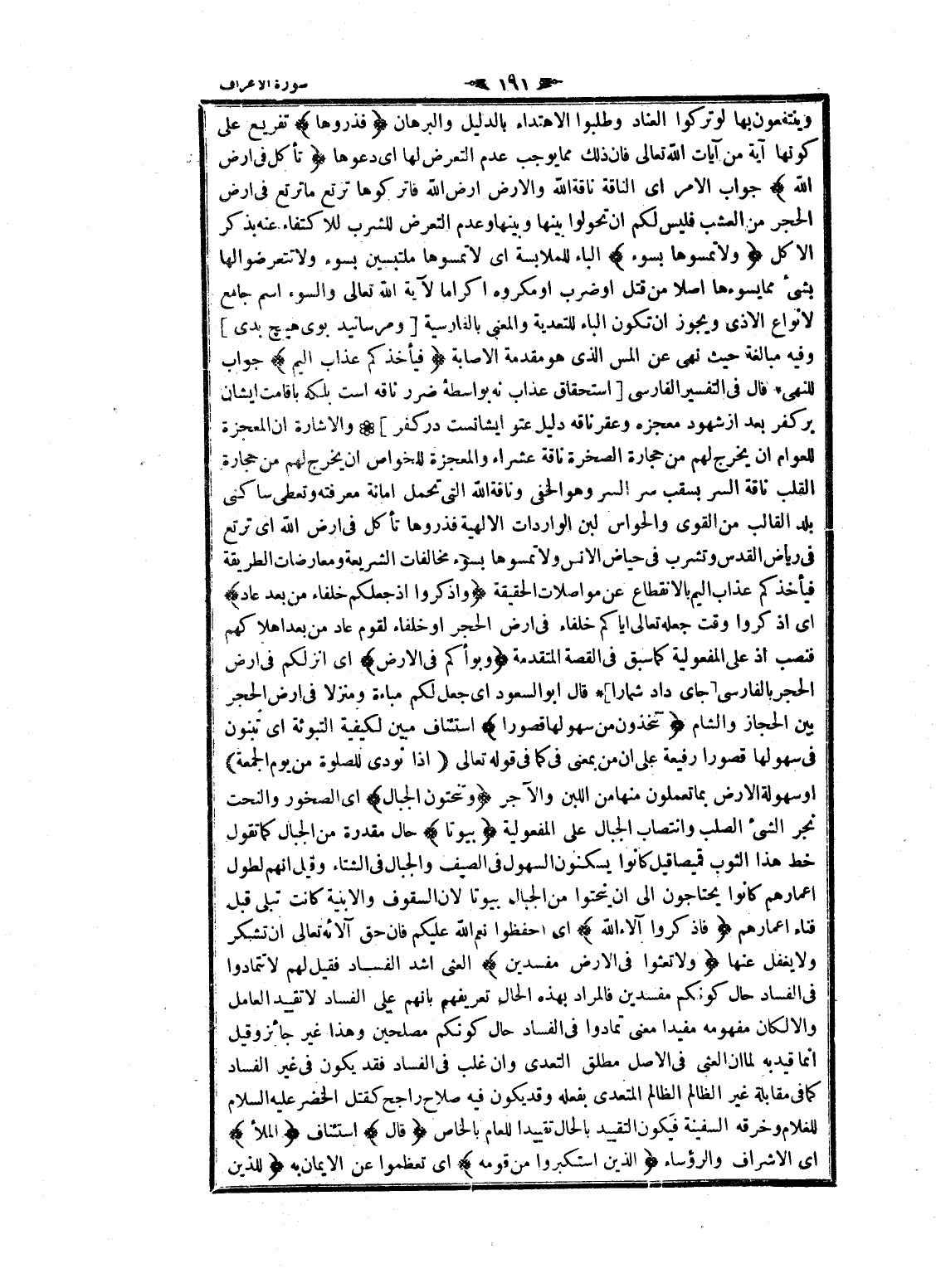 وينتفعون بها لو تركوا العناد وطلبوا الاهتداء بالدليل والبرهان فَذَرُوها تفريع على كونها آية من آيات الله تعالى فان ذلك مما يوجب عدم التعرض لها اى دعوها تَأْكُلْ فِي أَرْضِ اللَّهِ جواب الأمر اى الناقة الله والأرض فاتركوها ترتع ما ترتع فى ارض الحجر من العشب فليس لكم ان تحولوا بينها وبينها وعدم التعرض للشرب للاكتفاء عنه بذكر الاكل وَلا تَمَسُّوها بِسُوءٍ الباء للملابسة اى لا تمسوها ملتبسين بسوء ولا تتعرضوا لها بشىء مما يسوءها أصلا من قتل او ضرب او مكروه إكراما لآية الله تعالى والسوء اسم جامع لانواع الأذى ويجوز ان تكون الباء للتعدية والمعنى بالفارسية [ومرسانيد بوى هيچ بدى] وفيه مبالغة حيث نهى عن المس الذي هو مقدمة الاصابة فَيَأْخُذَكُمْ عَذابٌ أَلِيمٌ جواب للنهى قال فى التفسير الفارسي [استحقاق عذاب نه بواسطه ضرر ناقه است بلكه با قامت ايشان بر كفر بعد از شهود معجزه وعقر ناقه دليل عتو ايشانست در كفر] والاشارة ان المعجزة للعوام ان يخرج لهم من حجارة الصخرة ناقة عشراء والمعجزة للخواص ان يخرج لهم من حجارة القلب ناقة السر بسقب سر السر وهو الخفي وناقة الله التي تحمل امانة معرفته وتعطى ساكنى بلد القالب من القوى والحواس لبن الواردات الالهية فذروها تأكل فى ارض الله اى ترقع فى رياض القدس وتشرب فى حياض الانس ولا تمسوها بسوء مخالفات الشريعة ومعارضات الطريقة فيأخذكم عذاب اليم بالانقطاع عن مواصلات الحقيقة وَاذْكُرُوا إِذْ جَعَلَكُمْ خُلَفاءَ مِنْ بَعْدِ عادٍ اى اذكروا وقت جعله تعالى إياكم خلفاء فى ارض الحجر او خلفاء لقوم عاد من بعد إهلاكهم فنصب إذ على المفعولية كما سبق فى القصة المتقدمة وَبَوَّأَكُمْ فِي الْأَرْضِ اى أنزلكم فى ارض الحجر بالفارسي [جاى داد شما را] قال ابو السعود اى جعل لكم مباءة ومنزلا فى ارض الحجر بين الحجاز والشام تَتَّخِذُونَ مِنْ سُهُولِها قُصُوراً استئناف مبين لكيفية التبوئة اى تبنون فى سهولها قصورا رفيعه على ان من بمعنى فى كما فى قوله تعالى إِذا نُودِيَ لِلصَّلاةِ مِنْ يَوْمِ الْجُمُعَةِ او سهولة الأرض بما تعملون منها من اللبن والآجر وَتَنْحِتُونَ الْجِبالَ اى الصخور والنحت نجر الشيء الصلب وانتصاب الجبال على المفعولية بُيُوتاً حال مقدرة من الجبال كما تقول خط هذا الثوب قميصا قيل كانوا يسكنون السهول فى الصيف والجبال فى الشتاء وقيل انهم لطول أعمارهم كانوا يحتاجون الى ان ينحتوا من الجبال بيوتا لان السقوف والابنية كانت تبلى قبل فناء أعمارهم فَاذْكُرُوا آلاءَ اللَّهِ اى احفظوا نعم الله عليكم فان حق آلائه تعالى ان تشكر ولا يغفل عنها وَلا تَعْثَوْا فِي الْأَرْضِ مُفْسِدِينَ العثى أشد الفساد فقيل لهم لا تتمادوا فى الفساد حال كونكم مفسدين فالمراد بهذه الحال تعريفهم بانهم على الفساد لا تقييد العامل والا لكان مفهومه مفيدا معنى تمادوا فى الفساد حال كونكم مصلحين وهذا غير جائز وقيل انما قيد به لما ان العثى فى الأصل مطلق التعدي وان غلب فى الفساد فقد يكون فى غير الفساد كما فى مقابلة غير الظالم الظالم المتعدى بفعله وقد يكون فيه صلاح راجح كقتل الخضر عليه السلام للغلام وخرقه السفينة فيكون التقييد بالحال تقييدا للعام بالخاص قالَ استئناف الْمَلَأُ اى الاشراف والرؤساء الَّذِينَ اسْتَكْبَرُوا مِنْ قَوْمِهِ اى تعظموا عن الايمان به لِلَّذِينَ اسْتُضْعِفُوا