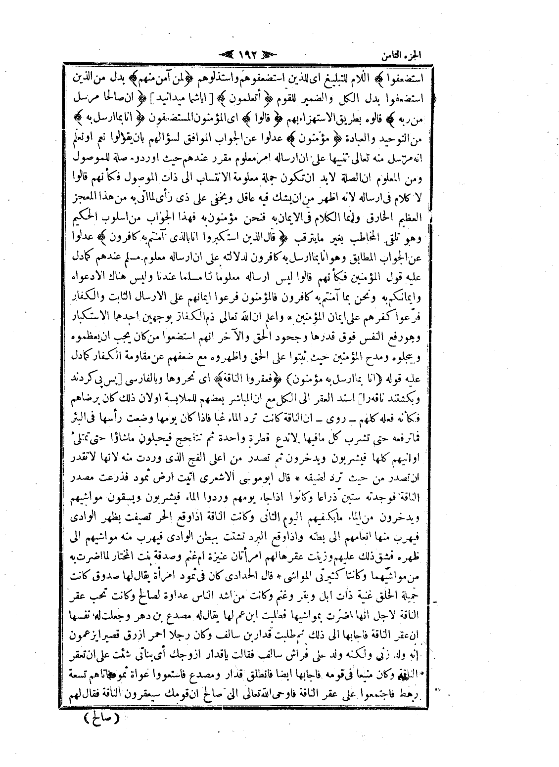 اللام للتبليغ اى للذين استضعفوهم واستذلوهم لِمَنْ آمَنَ مِنْهُمْ بدل من الذين استضعفوا بدل الكل والضمير للقوم أَتَعْلَمُونَ [آيا شما ميدانيد] أَنَّ صالِحاً مُرْسَلٌ مِنْ رَبِّهِ قالوه بطريق الاستهزاء بهم قالُوا اى المؤمنون المستضعفون إِنَّا بِما أُرْسِلَ بِهِ من التوحيد والعبادة مُؤْمِنُونَ عدلوا عن الجواب الموافق لسؤالهم بان يقولوا نعم او نعلم انه مرسل منه تعالى تنبيها على ان إرساله امر معلوم مقرر عندهم حيث أوردوه صلة للموصول ومن المعلوم ان الصلة لا بد ان تكون جملة معلومة الانتساب الى ذات الموصول فكأنهم قالوا لا كلام فى إرساله لانه اظهر من ان يشك فيه عاقل ويخفى على ذى رأى لما اتى به من هذا المعجز العظيم الخارق وانما الكلام فى الايمان به فنحن مؤمنون به فهذا الجواب من اسلوب الحكيم وهو تلقى المخاطب بغير ما يترقب قالَ الَّذِينَ اسْتَكْبَرُوا إِنَّا بِالَّذِي آمَنْتُمْ بِهِ كافِرُونَ عدلوا عن الجواب المطابق وهو انا بما أرسل به كافرون لدلالته على ان إرساله معلوم مسلم عندهم كما دل عليه قول المؤمنين فكأنهم قالوا ليس إرساله معلوما لنا مسلما عندنا وليس هناك إلا دعواه وايمانكم به ونحن بما آمنتم به كافرون فالمؤمنون فرعوا ايمانهم على الإرسال الثابت والكفار فرّعوا كفرهم على ايمان المؤمنين واعلم ان الله تعالى ذم الكفار بوجهين أحدهما الاستكبار وهو رفع النفس فوق قدرها وجحود الحق والآخر انهم استضعوا من كان يجب ان يعظموه ويبجلوه ومدح المؤمنين حيث ثبتوا على الحق وأظهروه مع ضعفهم عن مقاومة الكفار كما دل عليه قوله إِنَّا بِما أُرْسِلَ بِهِ مُؤْمِنُونَ فَعَقَرُوا النَّاقَةَ اى نحروها وبالفارسي [پس پى كردند وبكشتند ناقه را] أسند العقر الى الكل مع ان المباشر بعضهم للملابسة أو لأن ذلك كان برضاهم فكأنه فعله كلهم- روى- ان الناقة كانت ترد الماء غبا فاذا كان يومها وضعت رأسها فى البئر فما ترفعه حتى تشرب كل ما فيها لا تدع قطرة واحدة ثم تتفحج فيحبلون ما شاؤا حتى تمتلىء أوانيهم كلها فيشربون ويدخرون ثم تصدر من أعلى الفج الذي وردت منه لانها لا تقدر ان تصدر من حيث ترد لضيقه قال ابو موسى الأشعري أتيت ارض ثمود فذرعت مصدر الناقة فوجدته ستين ذراعا وكانوا إذا جاء يومهم وردوا الماء فيشربون ويسقون مواشيهم ويدخرون من الماء ما يكفيهم اليوم الثاني وكانت الناقة إذا وقع الحر تصيفت بظهر الوادي فيهرب منها أنعامهم الى بطنه وإذا وقع البرد تشتت ببطن الوادي فيهرب منه مواشيهم الى ظهره فشق ذلك عليهم وزينت عقرها لهم امرأتان عنيزة أم غنم وصدقة بنت المختار لما أضرت به من مواشيهما وكانتا كثيرتى المواشي قال الحدادي كان فى ثمود امرأة يقال لها صدوق كانت جميلة الخلق غنية ذات ابل وبقر وغنم وكانت من أشد الناس عداوة لصالح وكانت تحب عقر الناقة لاجل انها أضرت بمواشيها فطلبت ابن عم لها يقال له مصدع بن دهر وجعلت له نفسها ان عقر الناقة فاجابها الى ذلك ثم طلبت قدار بن سالف وكان رجلا احمر ازرق قصيرا يزعمون انه ولد زنى ولكنه ولد على فراش سالف فقالت يا قدار أزوجك أي بناتي شئت على ان تعقر الناقة وكان منيعا فى قومه فاجابها ايضا فانطلق قدار ومصدع فاستعووا عواة ثمود فاتاهم تسعة رهط فاجتمعوا على عقر الناقة فاوحى الله تعالى الى صالح ان قومك سيعقرون الناقة فقال لهم