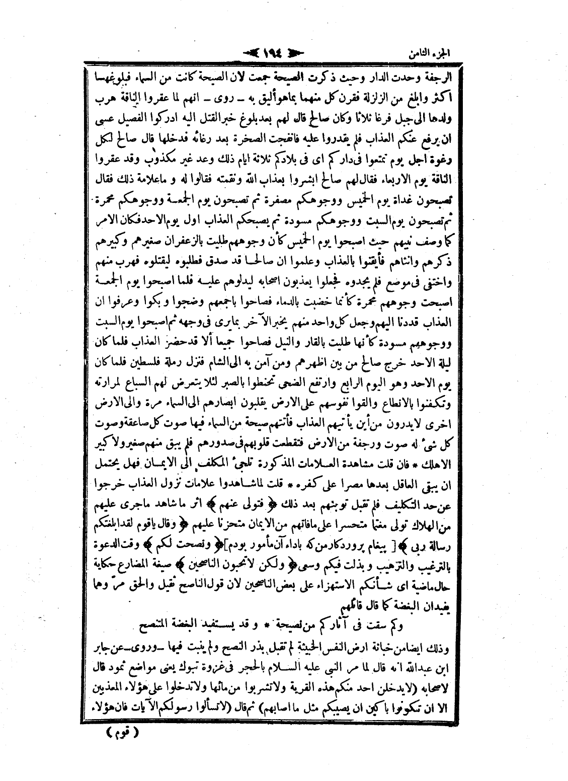 وذلك ايضا من خباثة ارض النفس الخبيثة لم تقبل بذر النصح ولم ينبت فيها- وروى- عن جابر ابن عبد الله انه قال لما مر النبي عليه السلام بالحجر فى غزوة تبوك يعنى مواضع ثمود قال لاصحابه (لا يدخلن أحد منكم هذه القرية ولا تشربوا من مائها ولا تدخلوا على هؤلاء المعذبين الا ان تكونوا باكين ان يصيبكم مثل ما أصابهم) ثم قال (لا تسألوا رسولكم الآيات فان هؤلاء