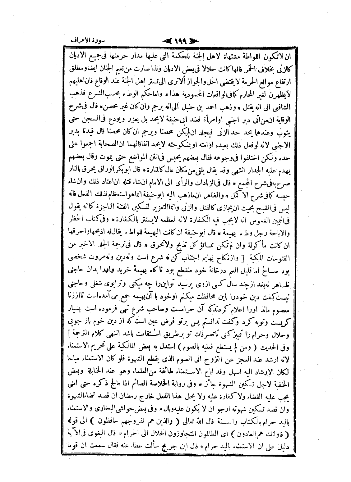 ان لا تكون اللواطة مشتهاة لاهل الجنة للحكمة التي عليها مدار حرمتها فى جميع الأديان كالزنى بخلاف الخمر فانها كانت حلالا فى بعض الأديان ولذا صارت من نعيم الجنان ايضا ومطلق ارتفاع موانع الحرمة لا يقتضى الحل والجواز ألا ترى الى تستر اهل الجنة عند الوقاع فان أهليهم لا يظهرن لغير المحارم كما فى الواقعات المحمودية هذا واما حكم الوطء بحسب الشرع فذهب الشافعي الى انه يقتل وذهب احمد بن حنبل الى انه يرجم وان كان غير محصن قال فى شرح الوقاية ان من اتى دبر اجنبى او امرأة فعند ابى حنيفة لا يحد بل يعزر ويودع فى السجن حتى يتوب وعندهما يحد حد الزنى فيجلد ان لم يكن محصنا ويرجم ان كان محصنا قال قيدنا بدبر الأجنبي لانه لو فعل ذلك بعبده او أمته او بمنكوحته لا يحد اتفاقا لهما ان الصحابة اجمعوا على حده ولكن اختلفوا فى وجوهه فقال بعضهم يحبس فى أنتن المواضع حتى يموت وقال بعضهم يهدم عليه الجدار انتهى وقد يقال يلقى من مكان عال كالمنارة قال أبو بكر الوراق يحرق بالنار صرح به فى شرح المجمع قال فى الزيادات والرأى الى الامام ان شاء قتله ان اعتاد ذلك وان شاء حبسه كما فى شرح الأكمل والظاهر ان ما ذهب اليه ابو حنيفة انما هو استعظام لذلك الفعل فانه ليس فى القبح بحيث ان يجازى كالقتل والزنى وانما التعزير لتسكين الفتنة الناجزة كما انه يقول فى اليمين الغموس انه لا يجب فيه الكفارة لانه لعظمه لا يستتر بالكفارة وفى كتاب الحظر والإباحة رجل وطء بهيمة قال ابو حنيفة ان كانت البهيمة للواطء يقال له اذبحها وأحرقها ان كانت مأكولة وان لم تكن مماتؤ كل تذبح ولا تحرق قال فى ترجمة الجلد الأخير من الفتوحات المكية [واز نكاح بهايم اجتناب كن نه شرع است ونه دين ونه مروت شخصى بود صالح اما قليل العلم در خانه خود منقطع بود ناكاه بهيمه خريد واو را بدان حاجتى ظاهر نه بعد از چند سال كسى از وى پرسيد تو اين را چهـ