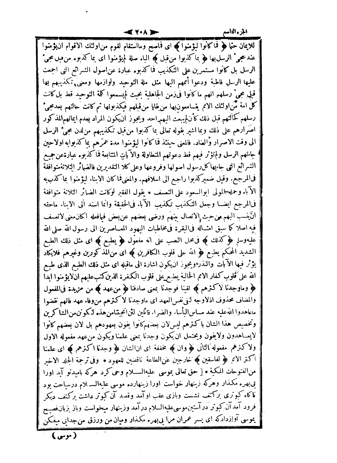 للايمان حتما فَما كانُوا لِيُؤْمِنُوا اى فما صح وما استقام لقوم من أولئك الأقوام ان يؤمنوا عند مجىء الرسل بها بِما كَذَّبُوا مِنْ قَبْلُ الباء صلة لم يؤمنوا اى بما كذبوه من قبل مجىء الرسل بل كانوا مستمرين على التكذيب فما كذبوه عبارة عن اصول الشرائع التي أجمعت عليها الرسل قاطبة ودعوا أممهم إليها مثل ملة التوحيد ولوازمها ومعنى تكذيبهم بها قبل مجىء رسلهم انهم ما كانوا فى زمن الجاهلية بحيث لم يسمعوا كلمة التوحيد قط بل كانت كل امة من أولئك الأمم يتسامعون بها من بقايا من قبلهم فيكذبونها ثم كانت حالتهم بعد مجىء رسلهم كحالتهم قبل ذلك كأن لم يبعث إليهم أحد ويجوز ان يكون المراد بعدم ايمانهم المذكور إصرارهم على ذلك وبما أشير بقوله تعالى بما كذبوا من قبل تكذيبهم من لدن مجىء الرسل الى وقت الإصرار والعناد. فالمعنى حينئذ فما كانوا ليؤمنوا مدة عمرهم بما كذبوا به اولا حين جاءتهم الرسل ولم تؤثر فيهم قط دعوتهم المتطاولة والآيات المتتابعة فما كذبوه عبارة عن جميع الشرائع التي جاء بها كل رسول أصولها وفروعها وعلى كلا التقديرين فالضمائر الثلاثة متوافقة فى المرجع. وقيل ضمير كذبوا راجع الى أسلافهم. والمعنى فما كان الأبناء ليؤمنوا بما كذب به الآباء وحمله المولى ابو السعود على التعسف يقول الفقير لو كانت الضمائر الثلاثة متوافقة فى المرجع ايضا وجعل التكذيب تكذيب الآباء فى الحقيقة وانما أسند الى الأبناء ما حقه ان ينسب إليهم من حيث الاتصال بينهم ورضى بعضهم عن بعض فيما فعله لكان معنى لا تعسف فيه أصلا كما سبق أمثاله فى البقرة فى مخاطبات اليهود المعاصرين الى رسول الله صلى الله عليه وسلم كَذلِكَ فى محل النصب على انه مفعول يَطْبَعُ اى مثل ذلك الطبع الشديد المحكم يطبع اللَّهُ عَلى قُلُوبِ الْكافِرِينَ اى من المذكورين وغيرهم فلا يكاد يؤثر فيها الآيات والنذر ويجوز ان يكون اشارة الى ما قبله اى مثل ذلك الطبع الذي طبع الله على قلوب كفار الأمم الخالية يطبع على قلوب الكفرة الذين كتب عليهم ان لا يؤمنوا ابدا وَما وَجَدْنا لِأَكْثَرِهِمْ لقينا فوجدنا بمعنى صادفنا مِنْ عَهْدٍ من مزيدة فى المفعول والمضاف محذوف إذ لا وجه لنفى نفس العهد اى ما وجدنا لاكثرهم من وفاء عهد فانهم نقضوا ما عاهدوا الله عليه عند مساس البأساء والضراء قائلين لئن أنجيتنا من هذه لنكونن من الشاكرين وتخصيص هذا الشان بأكثرهم ليس لان بعضهم كانوا يفون بعهودهم بل لان بعضهم كانوا لا يعاهدون ولا يفون ويحتمل ان يكون وجدنا بمعنى علمنا ويكون من عهد مفعوله الاول ولاكثرهم مفعوله الثاني وَإِنْ مخففة اى ان الشان وَجَدْنا أَكْثَرَهُمْ اى علمنا اكثر الأمم لَفاسِقِينَ خارجين عن الطاعة ناقضين للعهود وفى ترجمة الجلد الأخير من الفتوحات المكية [حق تعالى بموسى عليه السلام وحي كرد هر كه باميد تو آيد او را بي بهره مكذار وهر كه زينهار خواست او را زينهار ده موسى عليه السلام در سياحت بود ناكاه كبوترى بر كتف نشست وبازي عقب او آمد وقصد آن كبوتر داشت بر كتف ديكر فرود آمد آن كبوتر در آستين موسى عليه السلام در آمد وزينهار ميخواست وباز بزبان فصيح بموسى آواز داد كه اى پسر عمران مرا بي بهره مكذار وميان من ورزق من جدايى ميفكن