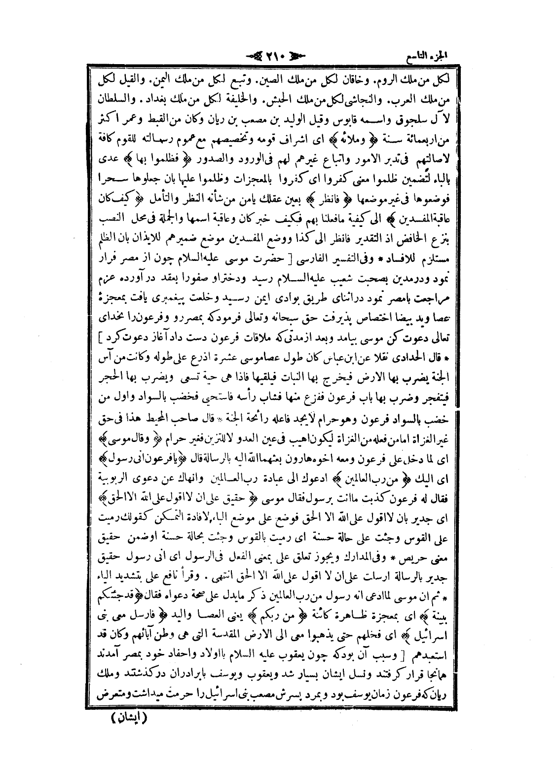 لكل من ملك الروم. وخاقان لكل من ملك الصين. وتبع لكل من ملك اليمن. والقيل لكل من ملك العرب. والنجاشي لكل من ملك الحبش. والخليفة لكل من ملك بغداد. والسلطان لآل سلجوق واسمه قابوس وقيل الوليد بن مصعب بن ريان وكان من القبط وعمر اكثر من اربعمائة سنة وَمَلَائِهِ اى اشراف قومه وتخصيصهم مع عموم رسالته للقوم كافة لاصالتهم فى تدبر الأمور واتباع غيرهم لهم فى الورود والصدور فَظَلَمُوا بِها عدى بالباء لتضمين ظلموا معنى كفروا اى كفروا بالمعجزات وظلموا عليها بان جعلوها سحرا فوضعوها فى غير موضعها فَانْظُرْ بعين عقلك يا من شأنه النظر والتأمل كَيْفَ كانَ عاقِبَةُ الْمُفْسِدِينَ الى كيفية ما فعلنا بهم فكيف خبر كان وعاقبة اسمها والجملة فى محل النصب بنزع الخافض إذ التقدير فانظر الى كذا ووضع المفسدين موضع ضميرهم للايذان بان الظلم مستلزم للافساد وفى التفسير الفارسي [حضرت موسى عليه السلام چون از مصر فرار نمود ودر مدين بصحبت شعيب عليه السلام رسيد ودختر او صفورا بعقد در آورده عزم مراجعت با مصر نمود در اثناى طريق بوادي ايمن رسيد وخلعت پيغمبرى يافت بمعجزه عصا ويد بيضا اختصاص پذيرفت حق سبحانه وتعالى فرمود كه بمصر رو وفرعون را بخداى تعالى دعوت كن موسى بيامد وبعد از مدتى كه ملاقات فرعون دست داد آغاز دعوت كرد] قال الحدادي نقلا عن ابن عباس كان طول عصا موسى عشرة اذرع على طوله وكانت من آس الجنة يضرب بها الأرض فيخرج بها النبات فيلقيها فاذا هى حية تسعى ويضرب بها الحجر فيتفجر وضرب بها باب فرعون ففزع منها فشاب رأسه فاستحيى فخضب بالسواد وأول من خضب بالسواد فرعون وهو حرام لا يجد فاعله رائحة الجنة قال صاحب المحيط هذا فى حق غير الغزاة اما من فعله من الغزاة ليكون اهيب فى عين العدو لا للتزين فغير حرام وَقالَ مُوسى اى لما دخل على فرعون ومعه اخوه هارون بعثهما الله اليه بالرسالة قال يا فِرْعَوْنُ إِنِّي رَسُولٌ اى إليك مِنْ رَبِّ الْعالَمِينَ أدعوك الى عبادة رب العالمين وأنهاك عن دعوى الربوبية فقال له فرعون كذبت ما أنت برسول فقال موسى حَقِيقٌ عَلى أَنْ لا أَقُولَ عَلَى اللَّهِ إِلَّا الْحَقَّ اى جدير بان لا أقول على الله الا الحق فوضع على موضع الباء لافادة التمكن كقولك رميت على القوس وجئت على حالة حسنة اى رميت بالقوس وجئت بحالة حسنة او ضمن حقيق معنى حريص وفى المدارك ويجوز تعلق على بمعنى الفعل فى الرسول اى انى رسول حقيق جدير بالرسالة أرسلت على ان لا أقول على الله الا الحق انتهى. وقرأ نافع على بتشديد الياء ثم ان موسى لما ادعى انه رسول من رب العالمين ذكر ما يدل على صحة دعواه فقال قَدْ جِئْتُكُمْ بِبَيِّنَةٍ اى بمعجزة ظاهرة كائنة مِنْ رَبِّكُمْ يعنى العصا واليد فَأَرْسِلْ مَعِيَ بَنِي إِسْرائِيلَ اى فخلهم حتى يذهبوا معى الى الأرض المقدسة التي هى وطن آبائهم وكان قد استعبدهم [وسبب آن بود كه چون يعقوب عليه السلام با أولاد وأحفاد خود بمصر آمدند همانجا قرار گرفتند ونسل ايشان بسيار شد ويعقوب ويوسف با برادران درگذشتند وملك ريان كه فرعون زمان يوسف بود وبمرد پسرش مصعب بنى إسرائيل را حرمت ميداشت ومتعرض