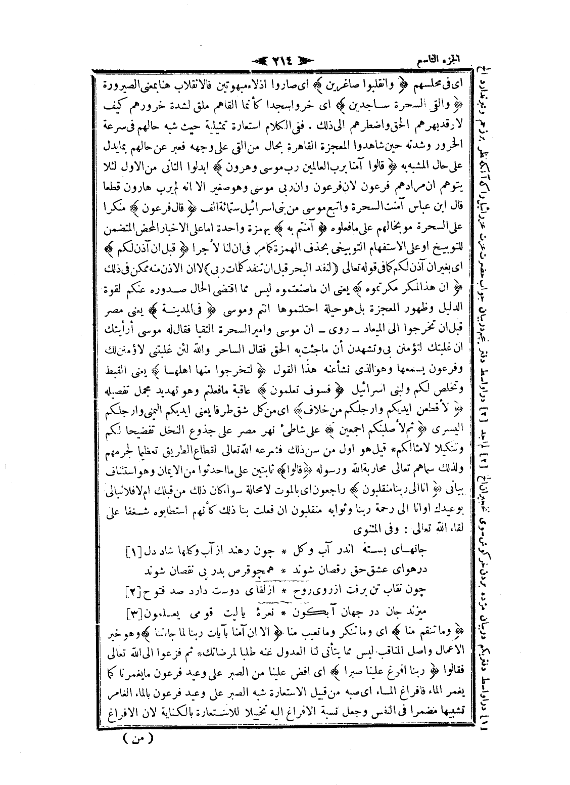 اى فى مجلسهم وَانْقَلَبُوا صاغِرِينَ اى صاروا أذلاء مبهوتين فالانقلاب هنا بمعنى الصيرورة وَأُلْقِيَ السَّحَرَةُ ساجِدِينَ اى خروا سجدا كأنما ألقاهم ملق لشدة خرورهم كيف لا وقد بهرهم الحق واضطرهم الى ذلك. ففى الكلام استعارة تمثيلية حيث شبه حالهم فى سرعة الخرور وشدته حين شاهدوا المعجزة القاهرة بحال من القى على وجهه فعبر عن حالهم بما يدل على حال المشبه به قالُوا آمَنَّا بِرَبِّ الْعالَمِينَ رَبِّ مُوسى وَهارُونَ ابدلوا الثاني من الاول لئلا يتوهم ان مرادهم فرعون لان فرعون وان ربى موسى وهو صغير الا انه لم يرب هارون قطعا قال ابن عباس آمنت السحرة واتبع موسى من بنى إسرائيل ستمائة الف قالَ فِرْعَوْنُ منكرا على السحرة موبخا لهم على ما فعلوه آمَنْتُمْ بِهِ بهمزة واحدة اما على الاخبار المحض المتضمن للتوبيخ او على الاستفهام التوبيخي بحذف الهمزة كمامر فى ان لنا لأجرا قَبْلَ أَنْ آذَنَ لَكُمْ اى بغير ان آذن لكم كما فى قوله تعالى لَنَفِدَ الْبَحْرُ قَبْلَ أَنْ تَنْفَدَ كَلِماتُ رَبِّي لا ان الاذن منه ممكن فى ذلك إِنَّ هذا لَمَكْرٌ مَكَرْتُمُوهُ يعنى ان ما صنعتموه ليس مما اقتضى الحال صدوره عنكم لقوة الدليل وظهور المعجزة بل هو حيلة احتلتموها أنتم وموسى فِي الْمَدِينَةِ يعنى مصر قبل ان تخرجوا الى الميعاد- روى- ان موسى وامير السحرة التقيا فقال له موسى أرأيتك ان غلبتك لتؤمنن بي وتشهدون أن ما جئت به الحق فقال الساحر والله لئن غلبتنى لاؤمنن لك وفرعون يسمعها وهو الذي نشأ عنه هذا القول لِتُخْرِجُوا مِنْها أَهْلَها يعنى القبط وتخلص لكم ولبنى إسرائيل فَسَوْفَ تَعْلَمُونَ عاقبة ما فعلتم وهو تهديد مجمل تفصيله لَأُقَطِّعَنَّ أَيْدِيَكُمْ وَأَرْجُلَكُمْ مِنْ خِلافٍ اى من كل شق طرفا يعنى ايديكم اليمنى وأرجلكم اليسرى ثُمَّ لَأُصَلِّبَنَّكُمْ أَجْمَعِينَ على شاطىء نهر مصر على جذوع النخل تفضيحا لكم وتنكيلا لامثالكم قيل هو أول من سن ذلك فشرعه الله تعالى لقطاع الطريق تعظيما لجرمهم ولذلك سماهم تعالى محاربة الله ورسوله قالُوا ثابتين على ما أحدثوا من الايمان وهو استئناف بيانى إِنَّا إِلى رَبِّنا مُنْقَلِبُونَ راجعون اى بالموت لا محالة سواء كان ذلك من قبلك أم لا فلا نبالى بوعيدك او انا الى رحمة ربنا وثوابه منقلبون ان فعلت بنا ذلك كأنهم استطابوه شغفا على لقاء الله تعالى: وفى المثنوى