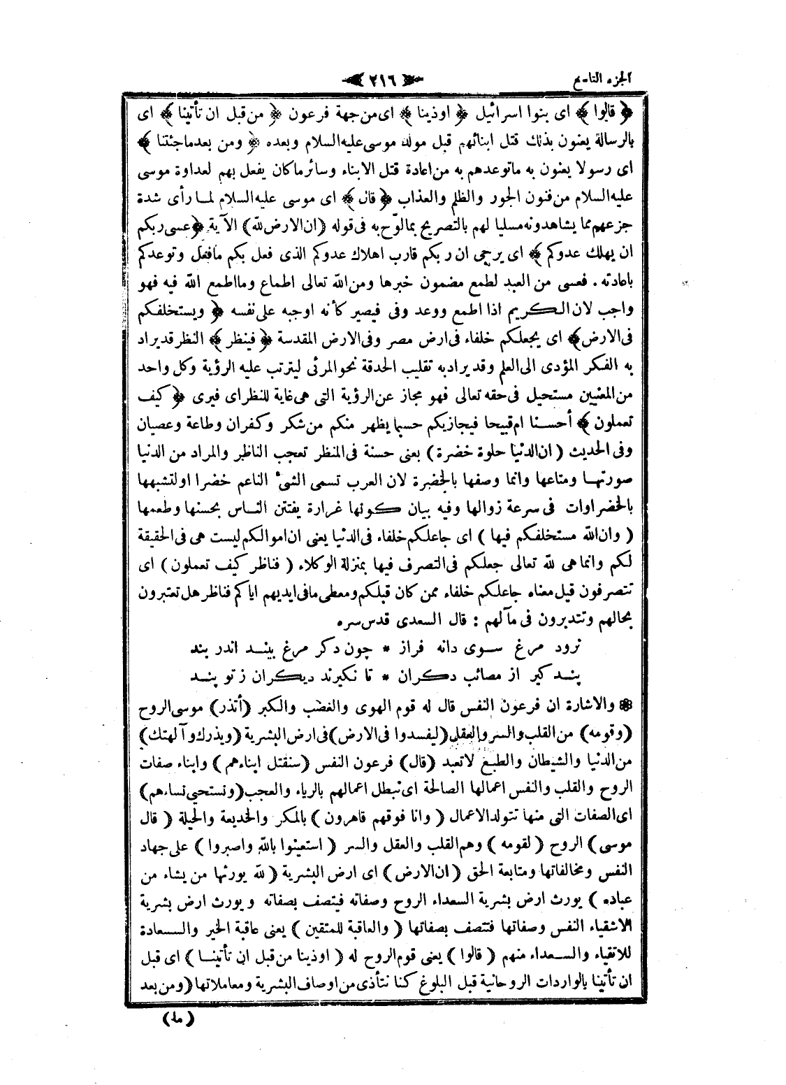 اى الصفات التي منها تتولد الأعمال وَإِنَّا فَوْقَهُمْ قاهِرُونَ بالمكر والخديعة والحيلة قالَ مُوسى الروح لِقَوْمِهِ وهم القلب والعقل والسر اسْتَعِينُوا بِاللَّهِ وَاصْبِرُوا على جهاد النفس ومخالفاتها ومتابعة الحق إِنَّ الْأَرْضَ اى ارض البشرية لِلَّهِ يُورِثُها مَنْ يَشاءُ مِنْ عِبادِهِ يورث ارض بشرية السعداء الروح وصفاته فيتصف بصفاته ويورث ارض بشرية الأشقياء النفس وصفاتها فتتصف بصفاتها وَالْعاقِبَةُ لِلْمُتَّقِينَ يعنى عاقبة الخير والسعادة للاتقياء والسعداء منهم قالُوا يعنى قوم الروح له أُوذِينا مِنْ قَبْلِ أَنْ تَأْتِيَنا اى قبل ان تأتينا بالواردات الروحانية قبل البلوغ كنا نتأذى من أوصاف البشرية ومعاملاتها وَمِنْ بَعْدِ ما جِئْتَنا