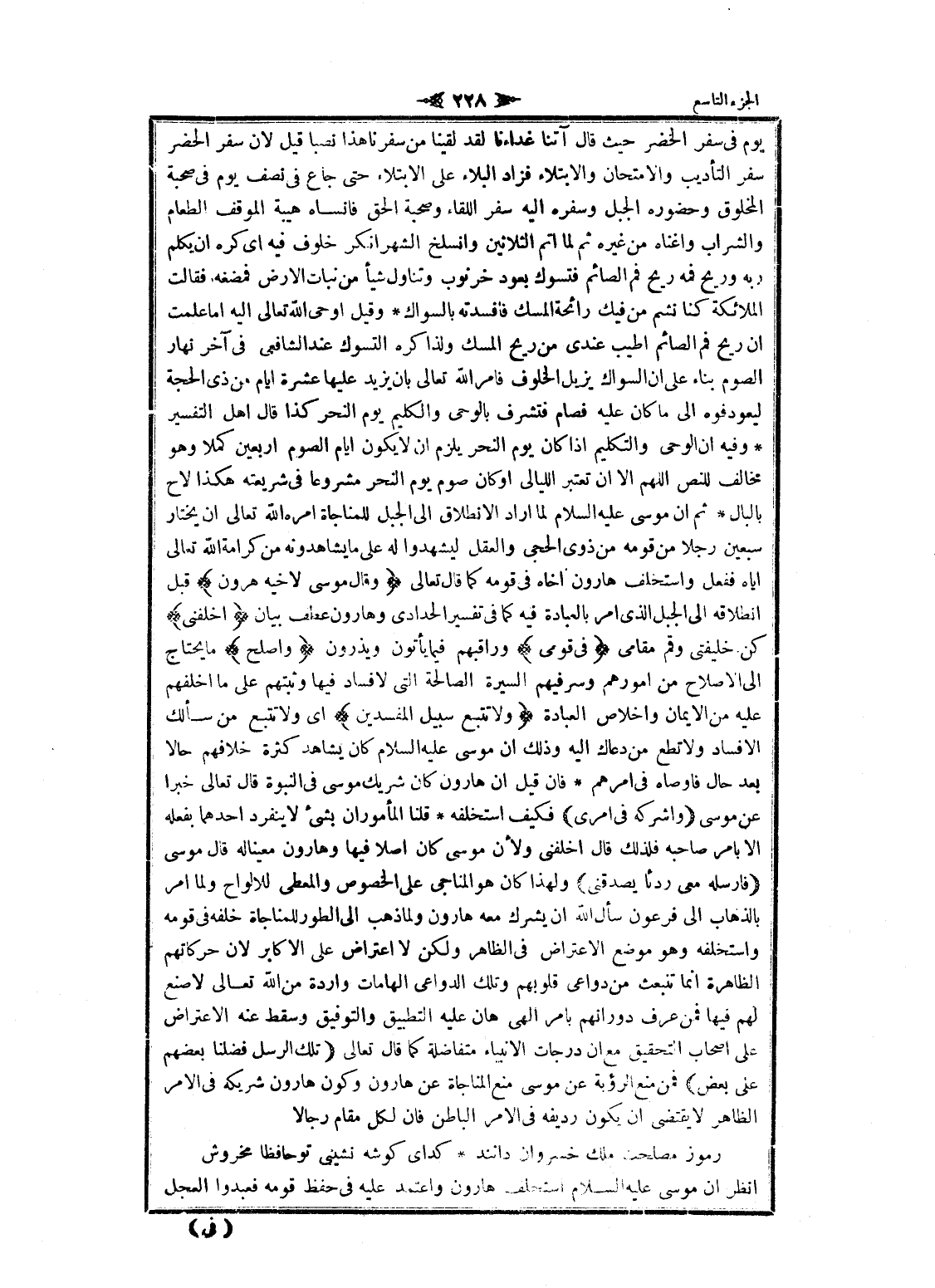 وهو مخالف للنص اللهم الا ان تعتبر الليالى او كان صوم يوم النحر مشروعا فى شريعته هكذا لاح بالبال ثم ان موسى عليه السلام لما أراد الانطلاق الى الجبل للمناجاة امره الله تعالى ان يختار سبعين رجلا من قومه من ذوى الحجى والعقل ليشهدوا له على ما يشاهدونه من كرامة الله تعالى إياه ففعل واستخلف هارون أخاه فى قومه كما قال تعالى وَقالَ مُوسى لِأَخِيهِ هارُونَ قبل انطلاقه الى الجبل الذي امر بالعبادة فيه كما فى تفسير الحدادي وهارون عطف بيان اخْلُفْنِي كن خليفتى وقم مقامى فِي قَوْمِي وراقبهم فيما يأتون ويذرون وَأَصْلِحْ ما يحتاج الى الإصلاح من أمورهم وسرفيهم السيرة الصالحة التي لا فساد فيها وثبتهم على ما اخلفهم عليه من الايمان واخلاص العبادة وَلا تَتَّبِعْ سَبِيلَ الْمُفْسِدِينَ اى ولا تتبع من سألك الإفساد ولا تطع من دعاك اليه وذلك ان موسى عليه السلام كان يشاهد كثرة خلافهم حالا بعد حال فاوصاه فى أمرهم فان قيل ان هارون كان شريك موسى فى النبوة قال تعالى خبرا عن موسى وَأَشْرِكْهُ فِي أَمْرِي فكيف استخلفه قلنا المأموران بشىء لا ينفرد أحدهما بفعله الا بامر صاحبه فلذلك قال اخلفني ولأن موسى كان أصلا فيها وهارون معينا له قال موسى فَأَرْسِلْهُ مَعِي رِدْءاً يُصَدِّقُنِي ولهذا كان هو المناجى على الخصوص والمعطى للالواح ولما امر بالذهاب الى فرعون سأل الله ان يشرك معه هارون ولما ذهب الى الطور للمناجاة خلفه فى قومه واستخلفه وهو موضع الاعتراض فى الظاهر ولكن لا اعتراض على الأكابر لان حركاتهم الظاهرة انما تنبعث من دواعى قلوبهم وتلك الدواعي الهامات واردة من الله تعالى لا صنع لهم فيها فمن عرف دورانهم بامر الهى هان عليه التطبيق والتوفيق وسقط عنه الاعتراض على اصحاب التحقيق مع ان درجات الأنبياء متفاضلة كما قال تعالى تِلْكَ الرُّسُلُ فَضَّلْنا بَعْضَهُمْ عَلى بَعْضٍ فمن منع الرؤية عن موسى منع المناجاة عن هارون وكون هارون شريكه فى الأمر الظاهر لا يقتضى ان يكون رديفه فى الأمر الباطن فان لكل مقام رجالا