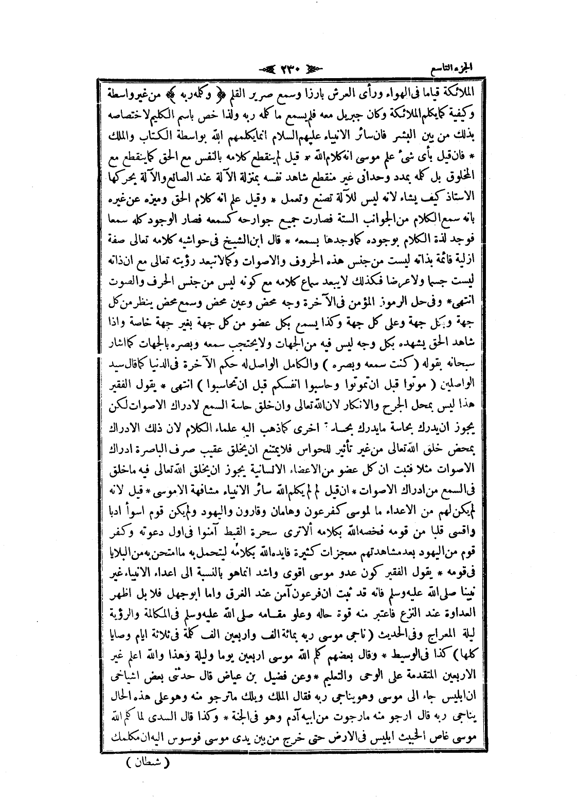 لا يبعد سماع كلامه مع كونه ليس من جنس الحرف والصوت انتهى وفى حل الرموز المؤمن فى الآخرة وجه محض وعين محض وسمع محض ينظر من كل جهة وبكل جهة وعلى كل جهة وكذا يسمع بكل عضو من كل جهة بغير جهة خاصة وإذا شاهد الحق يشهده بكل وجه ليس فيه من الجهات ولا يحتجب سمعه وبصره بالجهات كما أشار سبحانه بقوله (كنت سمعه وبصره) والكامل الواصل له حكم الآخرة فى الدنيا كما قال سيد الواصلين (موتوا قبل ان تموتوا وحاسبوا أنفسكم قبل ان تحاسبوا) انتهى يقول الفقير هذا ليس بمحل الجرح والإنكار لان الله تعالى وان خلق حاسة السمع لادراك الأصوات لكن يجوز ان يدرك بحاسة ما يدرك بحاسة اخرى كما ذهب اليه علماء الكلام لان ذلك الإدراك بمحض خلق الله تعالى من غير تأثير للحواس فلا يمتنع ان يخلق عقيب صرف الباصرة ادراك الأصوات مثلا فثبت ان كل عضو من الأعضاء الانسانية يجوز ان يخلق الله تعالى فيه ما خلق فى السمع من ادراك الأصوات ان قيل لم لم يكلم الله سائر الأنبياء مشافهة الا موسى قيل لانه لم يكن لهم من الأعداء ما لموسى كفرعون وهامان وقارون واليهود ولم يكن قوم أسوأ أدبا وأقسى قلبا من قومه فخصه الله بكلامه ألا ترى سحرة القبط آمنوا فى أول دعوته وكفر قوم من اليهود بعد مشاهدتهم معجزات كثيرة فايده الله بكلامه ليتحمل به ما امتحن به من البلايا فى قومه يقول الفقير كون عدو موسى أقوى وأشد انما هو بالنسبة الى اعداء الأنبياء غير نبينا صلى الله عليه وسلم فانه قد ثبت ان فرعون آمن عند الغرق واما ابو جهل فلا بل اظهر العداوة عند النزع فاعتبر منه قوة حاله وعلو مقامه صلى الله عليه وسلم فى المكالمة والرؤية ليلة المعراج وفى الحديث (ناجى موسى ربه بمائة الف وأربعين الف كلمة فى ثلاثة ايام وصايا كلها) كذا فى الوسيط وقال بعضهم كلم الله موسى أربعين يوما وليلة وهذا والله اعلم غير الأربعين المتقدمة على الوحى والتعليم وعن فضيل بن عياض قال حدثنى بعض أشياخي ان إبليس جاء الى موسى وهو يناجى ربه فقال الملك ويلك ما ترجو منه وهو على هذه الحال يناجى ربه قال أرجو منه مارجوت من أبيه آدم وهو فى الجنة وكذا قال السدى لما كلم الله موسى غاص الخبيث إبليس فى الأرض حتى خرج من بين يدى موسى فوسوس اليه ان مكلمك