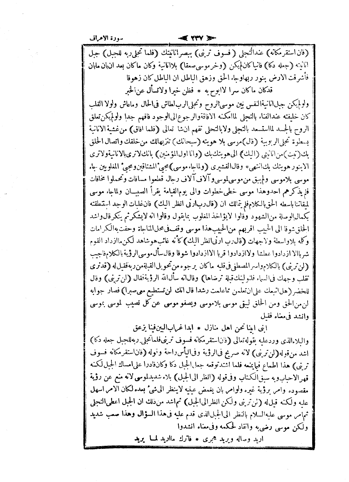 ولو لم يكن جبل انانية النفس بين موسى الروح وتجلى الرب لطاش فى الحال وما عاش ولولا القلب كان خليفته عند الفناء بالتجلى لما امكنه الافاقة والرجوع الى الوجود فافهم جدا ولو لم يكن تعلق الروح بالجسد لما استسعد بالتجلى ولا بالتحلي تفهم ان شاء تعالى فَلَمَّا أَفاقَ من غشية الانانية بسطوة تجلى الربوبية قالَ موسى بلا هويته سُبْحانَكَ تنزيها لك من خلقك واتصال الخلق بك تُبْتُ من انانيتى إِلَيْكَ الى هويتك بك وَأَنَا أَوَّلُ الْمُؤْمِنِينَ بانك لا ترى بالانانية ولا ترى الا بنور هويتك بك انتهى وقال القشيري وَلَمَّا جاءَ مُوسى مجيىء المشتاقين ومجيىء المغلوبين جاء موسى بلا موسى ولم يبق من موسى لموسى وآلاف آلاف رجال قطعوا مسافات وتحملوا مخافات فلم يذكرهم أحد وهذا موسى خطى خطوات والى يوم القيامة يقرأ الصبيان ولما جاء موسى لميقاتنا باسطه الحق بالكلام فلم يتمالك ان قالَ رَبِّ أَرِنِي أَنْظُرْ إِلَيْكَ فان غلبات الوجد استنطقته بكمال الوصلة من الشهود وقالوا لا يؤاخذ المغلوب بما يقول وقالوا انه لا يشكر ثم ينكر قال وأشد الخلق شوقا الى الحبيب أقربهم من الحبيب هذا موسى وقف فى محل المناجاة وحفت به الكرامات وكلمه بلا واسطة ولا جهات قالَ رَبِّ أَرِنِي أَنْظُرْ إِلَيْكَ كأنه غائب هو شاهد لكن ما ازداد القوم شربا الا ازدادوا عطشا ولا ازدادوا قربا الا ازدادوا شوقا وقال سأل موسى الرؤية بالكلام فاجيب لَنْ تَرانِي بالكلام واسر المصطفى فى قلبه ما كان يرجوه من تحويل القبلة من ربه فقيل له قَدْ نَرى تَقَلُّبَ وَجْهِكَ فِي السَّماءِ فَلَنُوَلِّيَنَّكَ قِبْلَةً تَرْضاها وقال انه سأل الله الرؤية فقال لَنْ تَرانِي وقال للخضر هَلْ أَتَّبِعُكَ عَلى أَنْ تُعَلِّمَنِ مِمَّا عُلِّمْتَ رُشْداً قالَ إِنَّكَ لَنْ تَسْتَطِيعَ مَعِيَ صَبْراً فصار جوابه لن من الحق ومن الخلق ليبقى موسى بلا موسى ويصفو موسى عن كل نصيب لموسى بموسى وانشد فى معناه فقيل