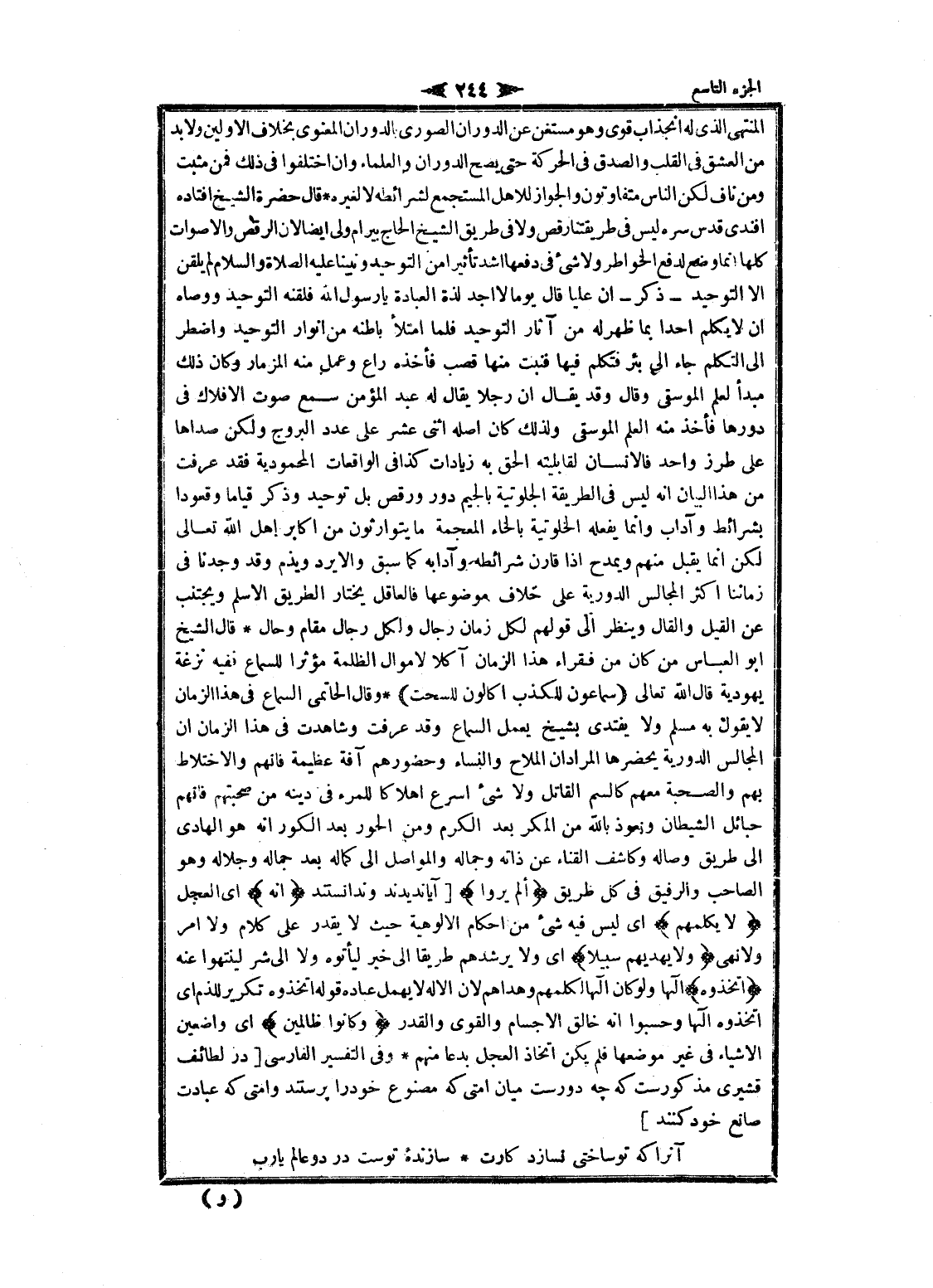 المنتهى الذي له انجذاب قوى وهو مستغن عن الدوران الصوري بالدوران المعنوي بخلاف الأولين ولا بد من العشق فى القلب والصدق فى الحركة حتى يصح الدوران والعلماء وان اختلفوا فى ذلك فمن مثبت ومن ناف لكن الناس متفاوتون والجواز للاهل المستجمع لشرائطه لا لغيره قال حضرة الشيخ افتاده افندى قدس سره ليس فى طريقتنا رقص ولا فى طريق الشيخ الحاج بيرام ولى ايضا لان الرقص والأصوات كلها انما وضع لدفع الخواطر ولا شىء فى دفعها أشد تأثير أمن التوحيد ونبينا عليه الصلاة والسلام لم يلقن الا التوحيد- ذكر- ان عليا قال يوما لا أجد لذة العبادة يا رسول الله فلقنه التوحيد ووصاه ان لا يكلم أحدا بما ظهر له من آثار التوحيد فلما امتلأ باطنه من أنوار التوحيد واضطر الى التكلم جاء الى بئر فتكلم فيها فنبت منها قصب فأخذه راع وعمل منه المزمار وكان ذلك مبدأ لعلم الموسيقى وقال وقد يقال ان رجلا يقال له عبد المؤمن سمع صوت الافلاك فى دورها فأخذ منه العلم الموسيقى ولذلك كان أصله اثنى عشر على عدد البروج ولكن صداها على طرز واحد فالانسان لقابليته الحق به زيادات كذا فى الواقعات المحمودية فقد عرفت من هذا البيان انه ليس فى الطريقة الجلوتية بالجيم دور ورقص بل توحيد وذكر قياما وقعودا بشرائط وآداب وانما يفعله الخلوتية بالخاء المعجمة ما يتوارثون من أكابر اهل الله تعالى لكن انما يقبل منهم ويمدح إذا قارن شرائطه وآدابه كما سبق والا يرد ويذم وقد وجدنا فى زماننا اكثر المجالس الدورية على خلاف موضوعها فالعاقل يختار الطريق الأسلم ويجتنب عن القيل والقال وينظر الى قولهم لكل زمان رجال ولكل رجال مقام وحال قال الشيخ ابو العباس من كان من فقراء هذا الزمان آكلا لاموال الظلمة مؤثرا للسماع ففيه نزغة يهودية قال الله تعالى سَمَّاعُونَ لِلْكَذِبِ أَكَّالُونَ لِلسُّحْتِ وقال الحاتمي السماع فى هذا الزمان لا يقول به مسلم ولا يفتدى بشيخ يعمل السماع وقد عرفت وشاهدت فى هذا الزمان ان المجالس الدورية يحضرها المرادان الملاح والنساء وحضورهم آفة عظيمة فانهم والاختلاط بهم والصحبة معهم كالسم القاتل ولا شىء اسرع إهلاكا للمرء فى دينه من صحبتهم فانهم حبائل الشيطان ونعوذ بالله من المكر بعد الكرم ومن الحور بعد الكور انه هو الهادي الى طريق وصاله وكاشف القناء عن ذاته وجماله والمواصل الى كماله بعد جماله وجلاله وهو الصاحب والرفيق فى كل طريق أَلَمْ يَرَوْا [آيا نديدند ونداستند أَنَّهُ اى العجل لا يُكَلِّمُهُمْ اى ليس فيه شىء من احكام الالوهية حيث لا يقدر على كلام ولا امر ولا نهى وَلا يَهْدِيهِمْ سَبِيلًا اى ولا يرشدهم طريقا الى خير ليأتوه ولا الى شر لينتهوا عنه اتَّخَذُوهُ آلها ولو كان آلها لكلمهم وهداهم لان الإله لا يهمل عباده قوله اتخذوه تكرير للذم اى اتخذوه آلها وحسبوا انه خالق الأجسام والقوى والقدر وَكانُوا ظالِمِينَ اى واضعين الأشياء فى غير موضعها فلم يكن اتخاذ العجل بدعا منهم وفى التفسير الفارسي [در لطائف قشيرى مذكورست كه چهـ دورست ميان أمتي كه مصنوع خود را پرستند وأمتي كه عبادت صانع خود كنند]