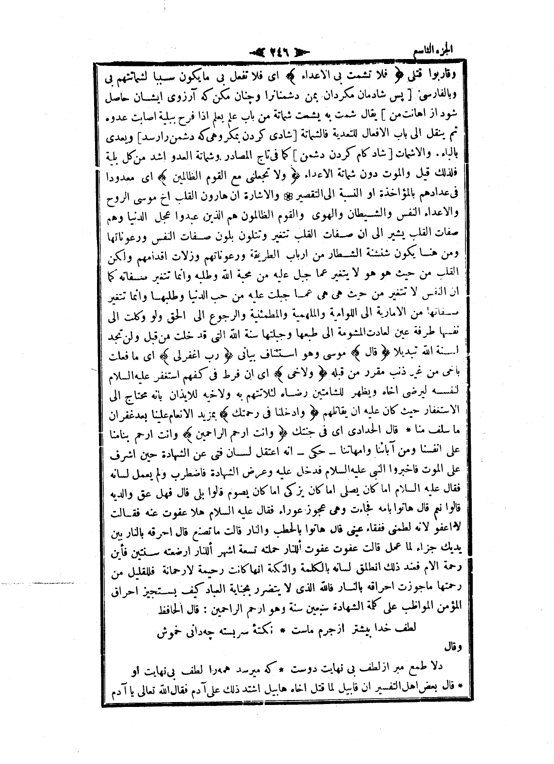 وقاربوا قتلى فَلا تُشْمِتْ بِيَ الْأَعْداءَ اى فلا تفعل بي ما يكون سببا لشماتتهم بي وبالفارسي [پس شادمان مكردان بمن دشمنانرا و چنان مكن كه آرزوى ايشان حاصل شود از اهانت من] يقال شمت به شمت شماتة من باب علم يعلم إذا فرح ببلية أصابت عدوه ثم ينقل الى باب الافعال للتعدية فالشماتة [شادى كردن بمكروهى كه دشمن را رسد] ويعدى بالباء. والاشمات [شاد كام كردن دشمن] كما فى تاج المصادر وشماتة العدو أشد من كل بلية فلذلك قيل والموت دون شماتة الأعداء وَلا تَجْعَلْنِي مَعَ الْقَوْمِ الظَّالِمِينَ اى معدودا فى عدادهم بالمؤاخذة او النسبة الى التقصير والاشارة ان هارون القلب أخ موسى الروح والأعداء النفس والشيطان والهوى والقوم الظالمون هم الذين عبدوا عجل الدنيا وهم صفات القلب يشير الى ان صفات القلب تتغير وتتلون بلون صفات النفس ورعوناتها ومن هنا يكون شنشنة الشطار من ارباب الطريقة ورعوناتهم وزلات أقدامهم ولكن القلب من حيث هو هو لا يتغير عما جبل عليه من محبة الله وطلبه وانما تتغير صفاته كما ان النفس لا تتغير من حيث هى هى عما جبلت عليه من حب الدنيا وطلبها وانما تتغير صفاتها من الامارية الى اللوامية والملهمية والمطمئنية والرجوع الى الحق ولو وكلت الى نفسها طرفة عين لعادت المشومة الى طبعها وجبلتها سنة الله التي قد خلت من قبل ولن تجد لسنة الله تبديلا قالَ موسى وهو استئناف بيانى رَبِّ اغْفِرْ لِي اى ما فعلت بأخي من غير ذنب مقرر من قبله وَلِأَخِي اى ان فرط فى كفهم استغفر عليه السلام لنفسه ليرضى أخاه ويظهر للشامتين رضاه لئلا تتهم به ولاخيه للايذان بانه محتاج الى الاستغفار حيث كان عليه ان يقاتلهم وَأَدْخِلْنا فِي رَحْمَتِكَ بمزيد الانعام علينا بعد غفران ما سلف منا قال الحدادي اى فى جنتك وَأَنْتَ أَرْحَمُ الرَّاحِمِينَ وأنت ارحم بنا منا على أنفسنا ومن آبائنا وأمهاتنا- حكى- انه اعتقل لسان فتى عن الشهادة حين اشرف على الموت فاخبروا النبي عليه السلام فدخل عليه وعرض الشهادة فاضطرب ولم يعمل لسانه فقال عليه السلام اما كان يصلى اما كان يزكى اما كان يصوم قالوا بلى قال فهل عق والديه قالوا نعم قال هاتوا بامه فجاءت وهى عجوز عوراء فقال عليه السلام هلا عفوت عنه فقالت لا أعفو لانه لطمنى ففقاء عينى قال هاتوا بالحطب والنار قالت ما تصنع قال أحرقه بالنار بين يديك جزاء لما عمل قالت عفوت عفوت أللنار حملته تسعة أشهر أللنار ارضعته سنتين فأين رحمة الام فعند ذلك انطلق لسانه بالكلمة والنكمة انها كانت رحيمة لارحمانة فللقليل من رحمتها ما جوزت إحراقه بالنار فالله الذي لا يتضرر بجناية العباد كيف يستجيز إحراق المؤمن المواظب على كلمة الشهادة سبعين سنة وهو ارحم الراحمين: قال الحافظ