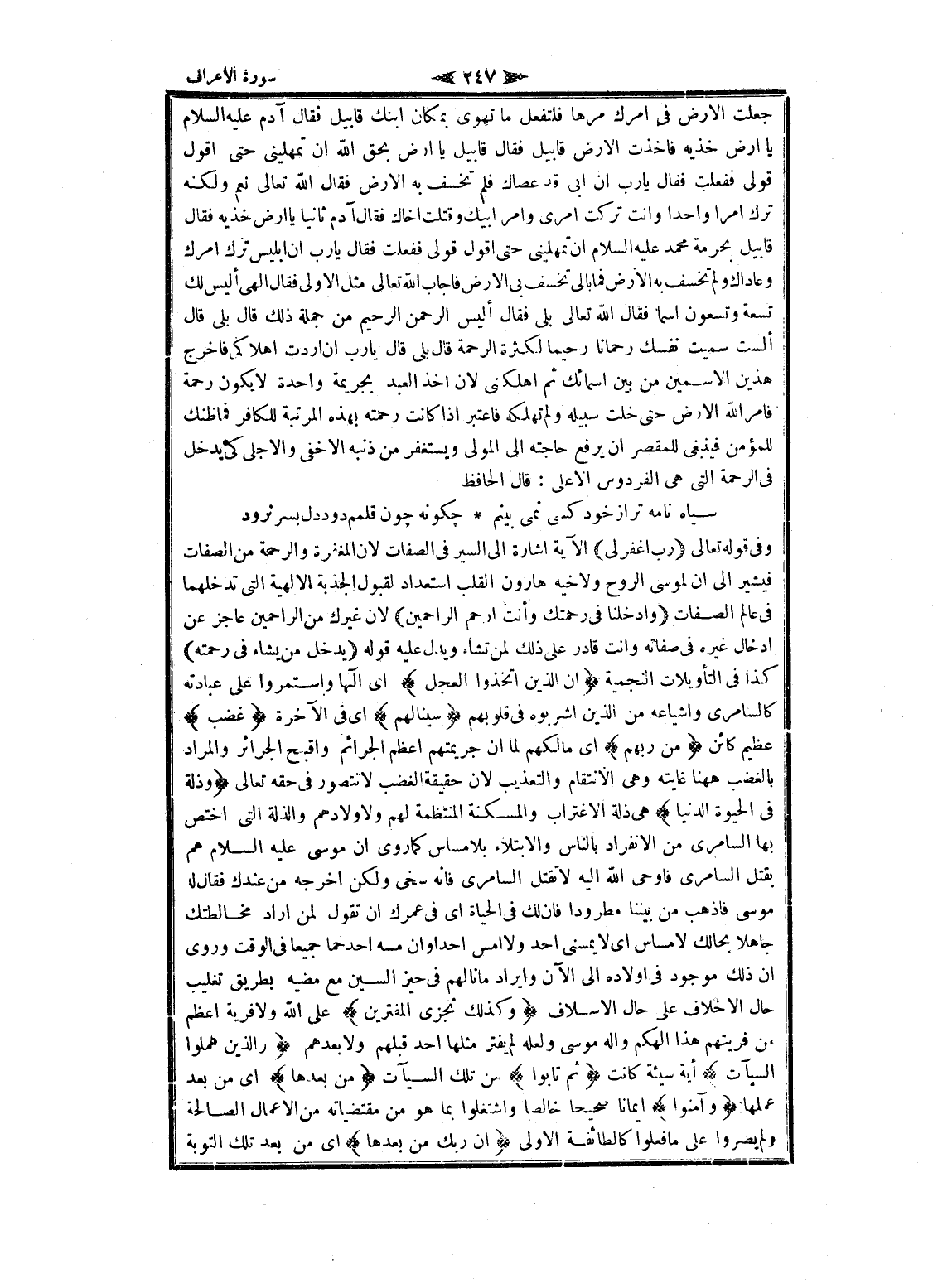 جعلت الأرض فى أمرك مرها فلتفعل ما تهوى بمكان ابنك قابيل فقال آدم عليه السلام يا ارض خذيه فاخذت الأرض قابيل فقال قابيل يا ارض بحق الله ان تمهلينى حتى أقول قولى ففعلت فقال يا رب ان ابى قد عصاك فلم تخسف به الأرض فقال الله تعالى نعم ولكنه ترك امرا واحدا وأنت تركت امرى وامر أبيك وقتلت أخاك فقال آدم ثانيا يا ارض خذيه فقال قابيل بحرمة محمد عليه السلام ان تمهلينى حتى أقول قولى ففعلت فقال يا رب ان إبليس ترك أمرك وعاداك ولم تخسف به الأرض فما بالى تخسف بي الأرض فاجاب الله تعالى مثل الاولى فقال الهى أليس لك تسعة وتسعون اسما فقال الله تعالى بلى فقال أليس الرحمن الرحيم من جملة ذلك قال بلى قال ألست سميت نفسك رحمانا رحيما لكثرة الرحمة قال بلى قال يا رب ان أردت إهلاكي فاخرج هذين الاسمين من بين أسمائك ثم أهلكني لان أخذ العبد بجريمة واحدة لا يكون رحمة فامر الله الأرض حتى خلت سبيله ولم تهلكه فاعتبر إذا كانت رحمته بهذه المرتبة للكافر فما ظنك للمؤمن فينبغى للمقصر ان يرفع حاجته الى المولى ويستغفر من ذنبه الأخفى والاجلى كى يدخل فى الرحمة التي هى الفردوس الأعلى: قال الحافظ