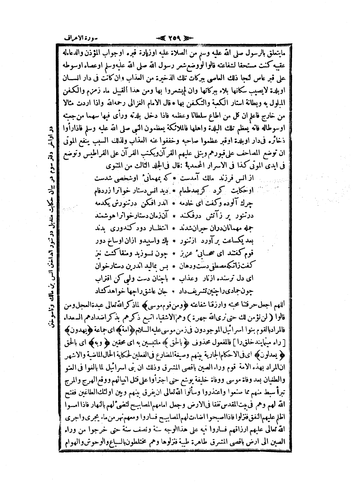 ما يتعلق بالرسول صلى الله عليه وسلم من الصلاة عليه او زيارة قبره او جواب المؤذن والدعاء له عقيبه كنت مستحقا لشفاعته قالوا لو وضع شعر رسول الله صلى الله عليه وسلم او عصاه او سوطه على قبر عاص لنجا ذلك العاصي ببركات تلك الذخيرة من العذاب وان كانت فى دار انسان او بلدة لا يصيب سكانها بلاء ببركاتها وان لم يشعروا بها ومن هذا القبيل ماء زمزم والكفن المبلول به وبطانة أستار الكعبة والتكفن بها قال الامام الغزالي رحمه الله وإذا أردت مثالا من خارج فاعلم ان كل من أطاع سلطانا وعظمه فاذا دخل بلدته ورأى فيها سهما من جعبته او سوطا له فانه يعظم تلك البلدة وأهلها فالملائكة يعظمون النبي صلى الله عليه وسلم فاذا رأوا ذخائره فى دار او بلدة او قبر عظموا صاحبه وخففوا عنه العذاب ولذلك السبب ينفع الموتى ان توضع المصاحف على قبورهم ويتلى عليهم القرآن ويكتب القرآن على القراطيس وتوضع فى أيدي الموتى كذا فى الاسرار المحمدية: قال فى الجلد الثالث من المثنوى