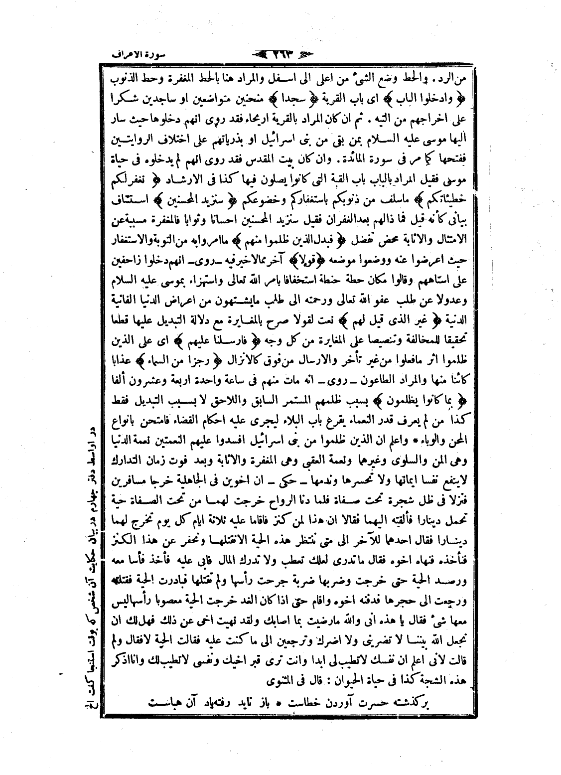 من الرد. والحط وضع الشيء من أعلى الى أسفل والمراد هنا بالحط المغفرة وحط الذنوب وَادْخُلُوا الْبابَ اى باب القرية سُجَّداً منحنين متواضعين او ساجدين شكرا على إخراجهم من التيه. ثم ان كان المراد بالقرية اريحاء فقد روى انهم دخلوها حيث سار إليها موسى عليه السلام بمن بقي من بنى إسرائيل او بذرياتهم على اختلاف الروايتين ففتحها كما مر فى سورة المائدة. وان كان بيت المقدس فقد روى انهم لم يدخلوه فى حياة موسى فقيل المراد بالباب باب القبة التي كانوا يصلون فيها كذا فى الإرشاد نَغْفِرْ لَكُمْ خَطِيئاتِكُمْ ما سلف من ذنوبكم باستغفاركم وخضوعكم سَنَزِيدُ الْمُحْسِنِينَ استئناف بيانى كأنه قيل فماذا لهم بعد الغفران فقيل سنزيد المحسنين إحسانا وثوابا فالمغفرة مسببة عن الامتثال والاثابة محض تفضل فَبَدَّلَ الَّذِينَ ظَلَمُوا مِنْهُمْ ما أمروا به من التوبة والاستغفار حيث اعرضوا عنه ووضعوا موضعه قَوْلًا آخر مما لا خير فيه- روى- انهم دخلوا زاحفين على أستاههم وقالوا مكان حطة حنطة استخفافا بامر الله تعالى واستهزاء بموسى عليه السلام وعدولا عن طلب عفو الله تعالى ورحمته الى طلب ما يشتهون من اعراض الدنيا الفانية الدنية غَيْرَ الَّذِي قِيلَ لَهُمْ نعت لقولا صرح بالمغايرة مع دلالة التبديل عليها قطعا تحقيقا للمخالفة وتنصيصا على المغايرة من كل وجه فَأَرْسَلْنا عَلَيْهِمْ اى على الذين ظلموا اثر ما فعلوا من غير تأخر والإرسال من فوق كالانزال رِجْزاً مِنَ السَّماءِ عذابا كائنا منها والمراد الطاعون- روى- انه مات منهم فى ساعة واحدة اربعة وعشرون ألفا بِما كانُوا يَظْلِمُونَ بسبب ظلمهم المستمر السابق واللاحق لا بسبب التبديل فقط كذا من لم يعرف قدر النعماء يقرع باب البلاء ليجرى عليه احكام القضاء فامتحن بانواع المحن والوباء واعلم ان الذين ظلموا من بنى إسرائيل أفسدوا عليهم النعمتين نعمة الدنيا وهى المن والسلوى وغيرهما ونعمة العقبى وهى المغفرة والاثابة وبعد فوت زمان التدارك لا ينفع نفسا إيمانها ولا تحسرها وندمها- حكى- ان أخوين فى الجاهلية خرجا مسافرين فنزلا فى ظل شجرة تحت صفاة فلما دنا الرواح خرجت لهما من تحت الصفاة حية تحمل دينارا فألقته إليهما فقالا ان هذا لمن كنز فاقاما عليه ثلاثة ايام كل يوم تخرج لهما دينارا فقال أحدهما للآخر الى متى ننتظر هذه الحية الا نقتلها ونحفر عن هذا الكنز فنأخذه فنهاه اخوه فقال ما تدرى لعلك تعطب ولا تدرك المال فابى عليه فأخذ فأسا معه ورصد الحية حتى خرجت وضربها ضربة جرحت رأسها ولم تقتلها فبادرت الحية فقتلته ورجعت الى حجرها فدفنه اخوه واقام حتى إذا كان الغد خرجت الحية معصوبا رأسها ليس معها شىء فقال يا هذه انى والله ما رضيت بما أصابك ولقد نهيت أخي عن ذلك فهل لك ان نجعل الله بيننا لا تضرينى ولا اضرك وترجعين الى ما كنت عليه فقالت الحية لا فقال ولم قالت لانى اعلم ان نفسك لا تطيب لى ابدا وأنت ترى قبر أخيك ونفسى لا تطيب لك وانا اذكر هذه الشجة كذا فى حياة الحيوان: قال فى المثنوى