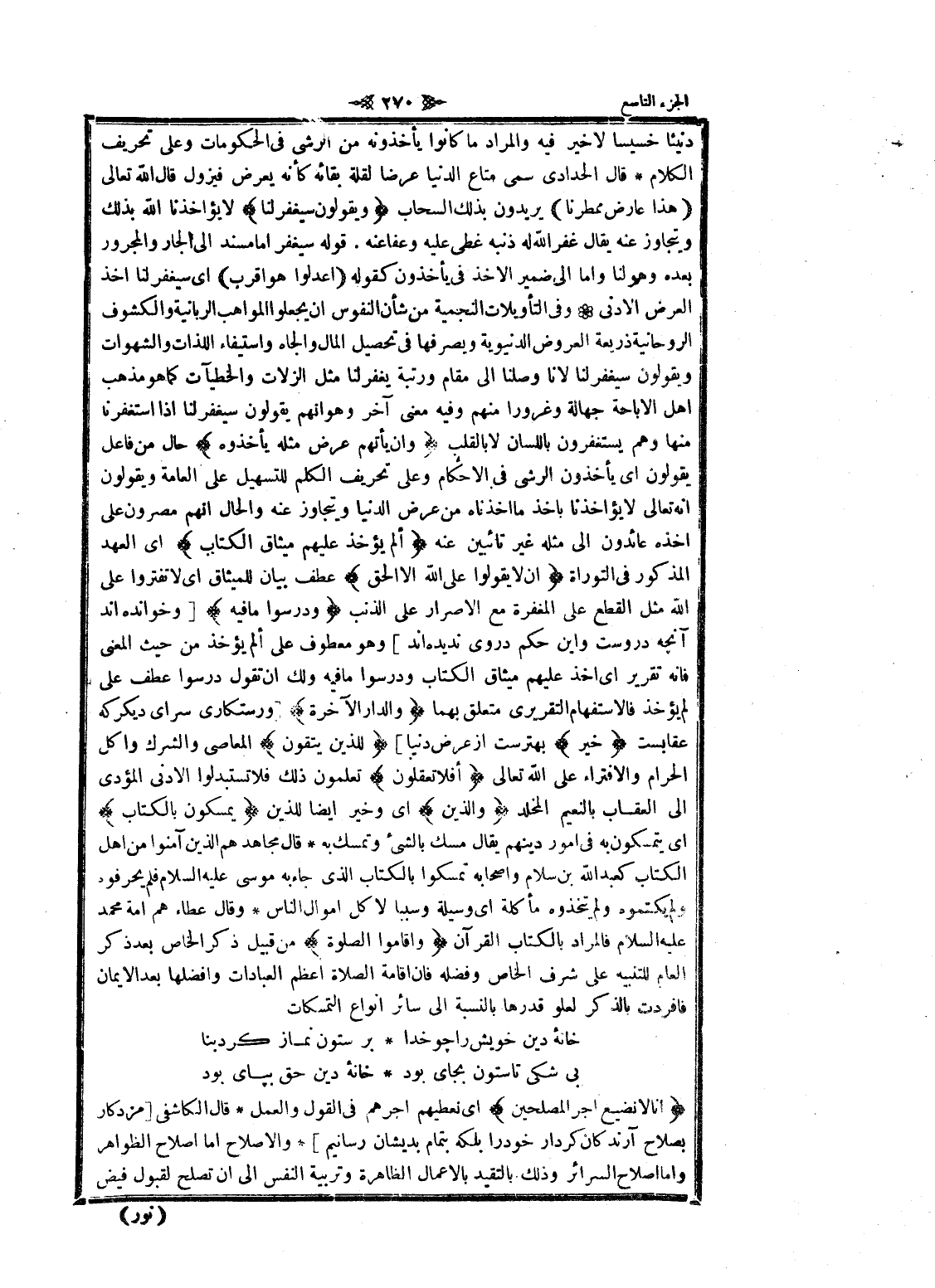 دنيئا خسيسا لا خير فيه والمراد ما كانوا يأخذونه من الرشى فى الحكومات وعلى تحريف الكلام قال الحدادي سمى متاع الدنيا عرضا لقلة بقائه كأنه يعرض فيزول قال الله تعالى هذا عارِضٌ مُمْطِرُنا يريدون بذلك السحاب وَيَقُولُونَ سَيُغْفَرُ لَنا لا يؤاخذنا الله بذلك ويتجاوز عنه يقال غفر الله له ذنبه غطى عليه وعفا عنه. قوله سيغفر اما مسند الى الجار والمجرور بعده وهو لنا واما الى ضمير الاخذ فى يأخذون كقوله اعْدِلُوا هُوَ أَقْرَبُ اى سيغفر لنا أخذ العرض الأدنى وفى التأويلات النجمية من شأن النفوس ان يجعلوا المواهب الربانية والكشوف الروحانية ذريعة العروض الدنيوية ويصرفها فى تحصيل المال والجاه واستيفاء اللذات والشهوات ويقولون سيغفر لنا لانا وصلنا الى مقام ورتبة يغفر لنا مثل الزلات والخطيئات كما هو مذهب اهل الإباحة جهالة وغرورا منهم وفيه معنى آخر وهوانهم يقولون سيغفر لنا إذا استغفرنا منها وهم يستغفرون باللسان لا بالقلب وَإِنْ يَأْتِهِمْ عَرَضٌ مِثْلُهُ يَأْخُذُوهُ حال من فاعل يقولون اى يأخذون الرشى فى الاحكام وعلى تحريف الكلم للتسهيل على العامة ويقولون انه تعالى لا يؤاخذنا بأخذ ما أخذناه من عرض الدنيا ويتجاوز عنه والحال انهم مصرون على اخذه عائدون الى مثله غير تائبين عنه أَلَمْ يُؤْخَذْ عَلَيْهِمْ مِيثاقُ الْكِتابِ اى العهد المذكور فى التوراة أَنْ لا يَقُولُوا عَلَى اللَّهِ إِلَّا الْحَقَّ عطف بيان للميثاق اى لا تفتروا على الله مثل القطع على المغفرة مع الإصرار على الذنب وَدَرَسُوا ما فِيهِ [وخوانده اند آنچهـ دروست واين حكم در وى نديده اند] وهو معطوف على ألم يؤخذ من حيث المعنى فانه تقرير اى أخذ عليهم ميثاق الكتاب ودرسوا ما فيه ولك ان تقول درسوا عطف على لم يؤخذ فالاستفهام التقريرى متعلق بهما وَالدَّارُ الْآخِرَةُ [ورستكارى سراى ديكر كه عقابست خَيْرٌ بهترست از عرض دنيا] لِلَّذِينَ يَتَّقُونَ المعاصي والشرك وأكل الحرام والافتراء على الله تعالى أَفَلا تَعْقِلُونَ تعلمون ذلك فلا تستبدلوا الأدنى المؤدى الى العقاب بالنعيم المخلد وَالَّذِينَ اى وخير ايضا للذين يُمَسِّكُونَ بِالْكِتابِ اى يتمسكون به فى امور دينهم يقال مسك بالشيء وتمسك به قال مجاهد هم الذين آمنوا من اهل الكتاب كعبد الله بن سلام وأصحابه تمسكوا بالكتاب الذي جاء به موسى عليه السلام فلم يحرفوه ولم يكتموه ولم يتخذوه مأكلة اى وسيلة وسببا لاكل اموال الناس وقال عطاء هم امة محمد عليه السلام فالمراد بالكتاب القرآن وَأَقامُوا الصَّلاةَ من قبيل ذكر الخاص بعد ذكر العام للتنبيه على شرف الخاص وفضله فان اقامة الصلاة أعظم العبادات وأفضلها بعد الايمان فافردت بالذكر لعلو قدرها بالنسبة الى سائر انواع التمسكات