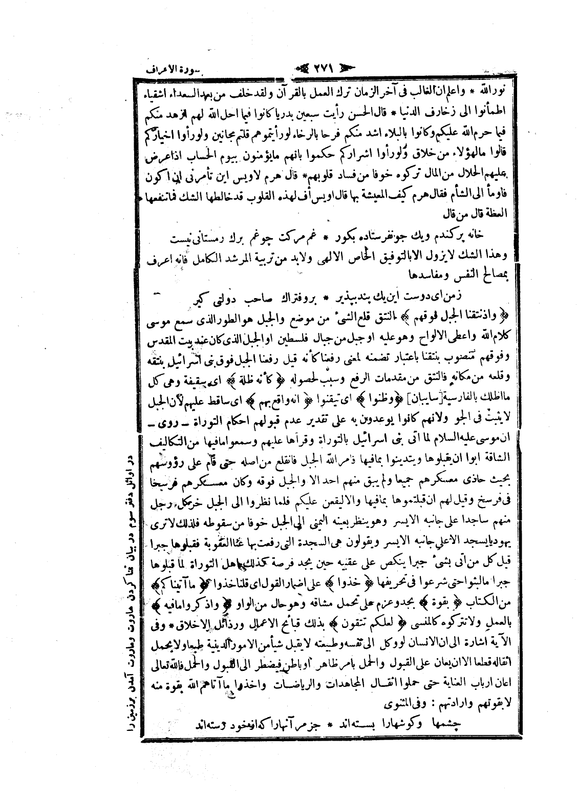 وَإِذْ نَتَقْنَا الْجَبَلَ فَوْقَهُمْ النتق قلع الشيء من موضع والجبل هو الطور الذي سمع موسى كلام الله واعطى الألواح وهو عليه او جبل من جبال فلسطين او الجبل الذي كان عند بيت المقدس وفوقهم منصوب بنتقنا باعتبار تضمنه لمعنى رفعنا كأنه قيل رفعنا الجبل فوق بنى إسرائيل بنتقه وقلعه من مكانه فالنتق من مقدمات الرفع وسبب لحصوله كَأَنَّهُ ظُلَّةٌ اى سقيفة وهى كل ما اظلك بالفارسية [سايبان] وَظَنُّوا اى تيقنوا أَنَّهُ واقِعٌ بِهِمْ اى ساقط عليهم لان الجبل لا يثبت فى الجو ولانهم كانوا يوعدون به على تقدير عدم قبولهم احكام التوراة- روى- ان موسى عليه السلام لما اتى بنى إسرائيل بالتوراة وقرآها عليهم وسمعوا ما فيها من التكاليف الشاقة أبوا ان يقبلوها ويتدينوا بما فيها فامر الله الجبل فانقلع من أصله حتى قام على رؤوسهم بحيث حاذى معسكرهم جميعا ولم يبق منهم أحد الا والجبل فوقه وكان معسكرهم فرسخا فى فرسخ وقيل لهم ان قبلتموها بما فيها والا ليقعن عليكم فلما نظروا الى الجبل خر كل رجل منهم ساجدا على جانبه الا يسر وهو ينظر بعينه اليمنى الى الجبل خوفا من سقوطه فلذلك لا ترى يهوديا يسجد الأعلى جانبه الا يسر ويقولون هى السجدة التي رفعت بها عنا العقوبة فقبلوها جبرا قيل كل من اتى بشىء جبرا ينكص على عقبيه حين يجد فرصة كذلك اهل التوراة لما قبلوها جبرا ما لبثوا حتى شرعوا فى تحريفها خُذُوا على إضمار القول اى قلنا خذوا ما آتَيْناكُمْ من الكتاب بِقُوَّةٍ بجد وعزم على تحمل مشاقه وهو حال من الواو وَاذْكُرُوا ما فِيهِ بالعمل ولا تتركوه كالمنسى لَعَلَّكُمْ تَتَّقُونَ بذلك قبائح الأعمال ورذائل الأخلاق وفى الآية اشارة الى ان الإنسان لو وكل الى نفسه وطبيعته لا يقبل شيأ من الأمور الدينية طبعا ولا يحمل أثقاله قطعا الا ان يعان على القبول والحمل بامر ظاهر او باطن فيضطر الى القبول والحمل فالله تعالى أعان ارباب العناية حتى حملوا أثقال المجاهدات والرياضيات وأخذوا ما آتاهم الله بقوة منه لا بقوتهم وإرادتهم: وفى المثنوى
