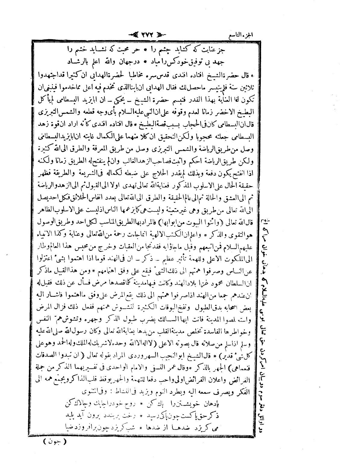 قال حضرة الشيخ افتاده افندى قدس سره مخاطبا لحضرة الهدايى ان كثيرا قد اجتهدوا ثلاثين سنة فلم يتيسر ما حصل لك فقال الهدايى ان بابنا الذي نخدم فيه أعلى مما خدموا فينبغى ان تكون لنا العناية بهذا القدر فتبسم حضرة الشيخ- يحكى- ان أبا يزيد البسطامي لم يأكل البطيخ الأخضر زمانا لعدم وقوفه على ان النبي عليه السلام بأى وجه قطعه والشمس التبريزي قال ان البسطامي كان فى الحجاب بسبب قصة البطيخ قال افتاده افندى كأنه أراد ان قوة زهد البسطامي جعلته محجوبا ولكن التحقيق ان كلا منهما على الكمال غايته ان أبا يزيد البسطامي وصل من طريق الرياضة والشمس التبريزي وصل من طريق المعرفة والطرق الى الله كثيرة ولكن طريق الرياضة احكم واثبت فصاحب الزهد الغالب وان لم ينفتح له الطريق زمانا ولكنه إذا انفتح يكون دفعة وبذلك لم يقدر الحلاج على ضبطه لكماله فى الشريعة والطريقة فظهر حقيقة الحال على الأسلوب المذكور فعناية الله تعالى تهدى اولا الى القبول ثم الى الزهد والرياضة ثم الى العشق والحالة ثم الى عالم الحقيقة والطرق الى الله تعالى بعدد أنفاس الخلائق فكل أحد يصل الى الله تعالى من طريق وهى غير متعينة وليست هى كما يزعمها الناس إذ ليست على الأسلوب الظاهر قال الله تعالى وَأْتُوا الْبُيُوتَ مِنْ أَبْوابِها فالمراد بها الطريق المناسب لكل أحد وطريق الوصول هو التقوى والذكر واعلم ان الكتب الالهية انما جاءت رحمة من الله تعالى وعناية وكذا الأنبياء عليهم السلام فمن اتبعهم وقبل ما جاؤا به فقد نجا من العقبات وخرج من محبس هذا العالم وطار الى الملكوت الأعلى وللهمة تأثير عظيم- ذكر- ان فى الهند قوما إذا اهتموا بشىء اعتزلوا عن الناس وصرفوا همتهم الى ذلك الشيء فيقع على وفق اهتمامهم ومن هذا القبيل ما ذكر ان السلطان محمود غزا بلاد الهند وكانت فيها مدينة كلما قصدها مرض فسأل عن ذلك فقيل له ان عندهم جمعا من الهند إذا صرفوا همتهم الى ذلك يقع المرض على وفق ما اهتموا فاشار اليه بعض أصحابه بدق الطبول ونفخ البوقات الكثيرة لتشوش همتهم ففعل ذلك فزال المرض واستخلصوا المدينة فانت ايها السالك بضرب طبول الذكر وجهره وتشوش همّ النفس وخواطرها الفاسدة تخلص مدينة القلب من يدها بعناية الله تعالى وكان رسول الله صلى الله عليه وسلم إذا سلم من صلاته قال بصوته الأعلى (لا اله الا الله وحده لا شريك له الملك وله الحمد وهو على كل شىء قدير) قال الشيخ ابو النجيب السهروردي المراد بقوله تعالى إِنْ تُبْدُوا الصَّدَقاتِ فَنِعِمَّا هِيَ الجهر بالذكر وقال عمر النسفي والامام الواحدي فى تفسيريهما الذكر من جملة الفرائض وإعلان الفرائض اولى وأحب دفعا للتهمة والجهر يوقظ قلب الذاكر ويجمع همه الى الفكر ويصرف سمعه اليه ويطرد النوم ويزيد فى النشاط: وفى المثنوى